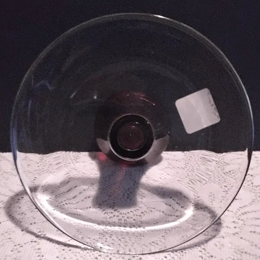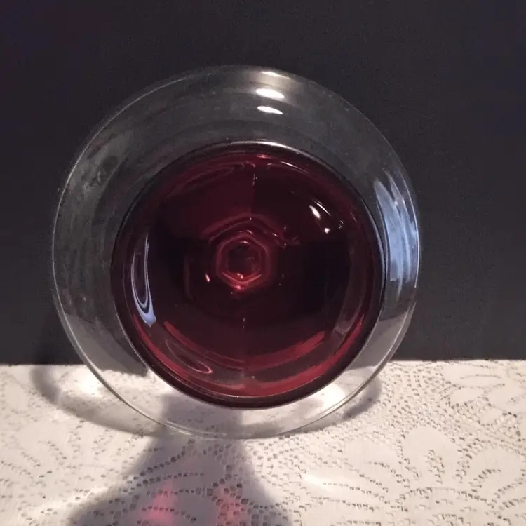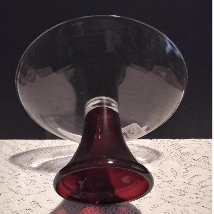 Anchor Hocking Ruby Red & Clear Pedestal Serving Platter/Cake Dish 8 inches in diameter. 4.10 inches tall and pedestal bottom is 3.9 inches. It is used and has a few scratches on top of platter. No chips or cracks. Made in the USA. Has original sticker still attached. Great Cake Platter. Picture are part of the description.