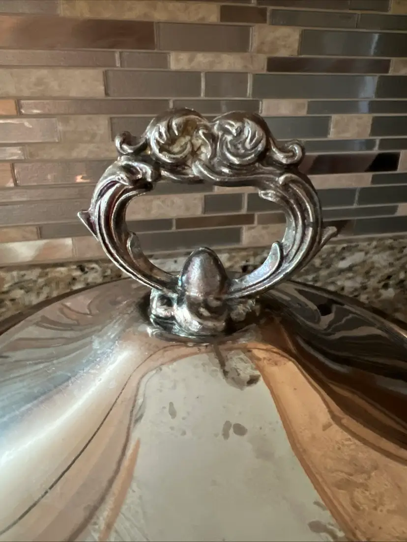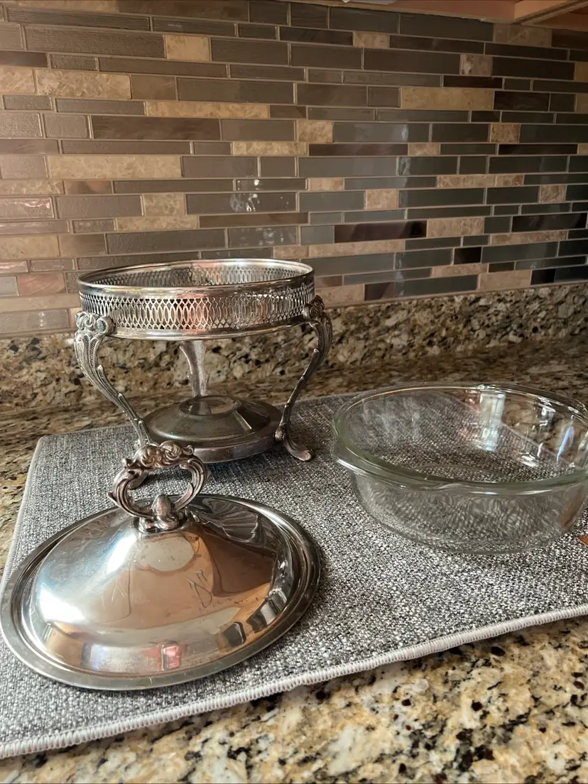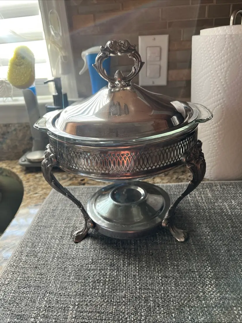 The Silver Chafing warmer is a vintage glass bowl with a round shape, featuring a decorative flower pattern in the style of Mid-Century Modern. Made by Anchor Hocking in America during the mid 20th century, this original piece is made using pressed glass technique for a glossy finish. Perfect for all occasions, this clear bowl is a unique addition to any table setting and should be hand washed to maintain its beauty. Ideal for adult use, this chafing warmer adds a touch of retro charm to any home decor.