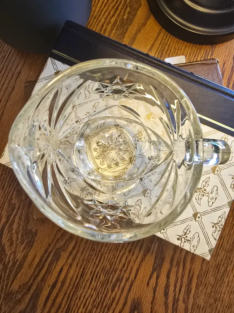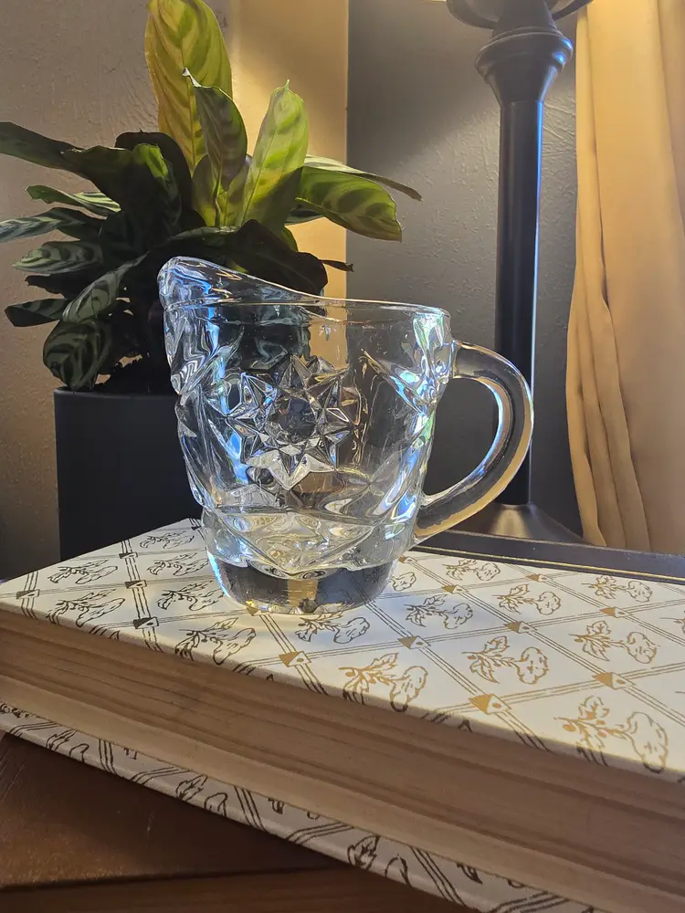 The Anchor Hocking Star Of David Creamer Pitcher is a vintage 8oz glass creamer with a clear finish. This original piece was manufactured in the United States during the early to mid-1900s using a cut glass production style. The creamer pitcher is part of the Early American Prescut/EAPC product line and features a star of David design, making it a unique and decorative piece for serving cream or milk at the table. Perfect for collectors of vintage glassware or those looking to add a touch of Americana to their kitchen.