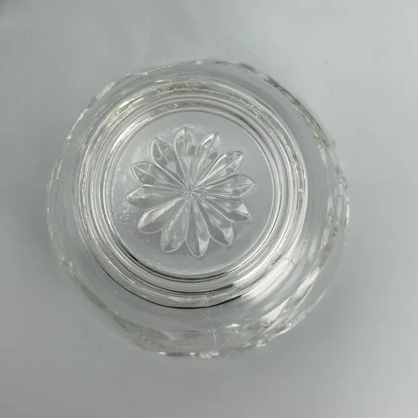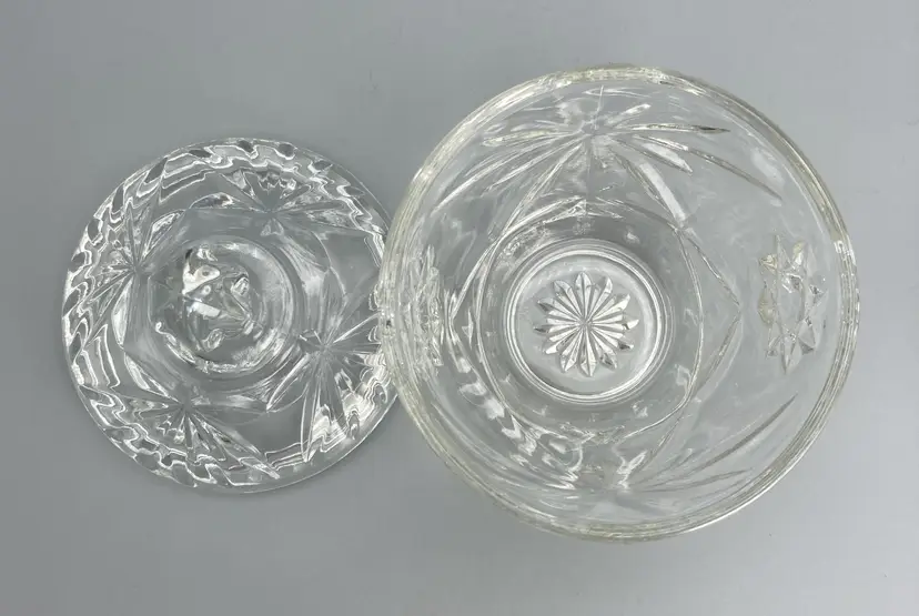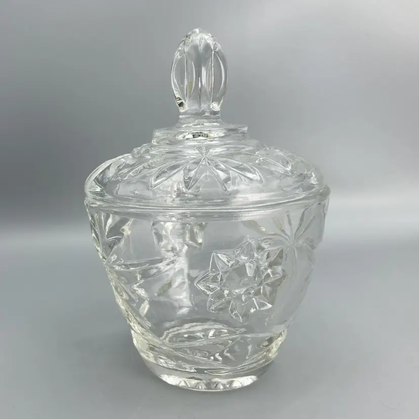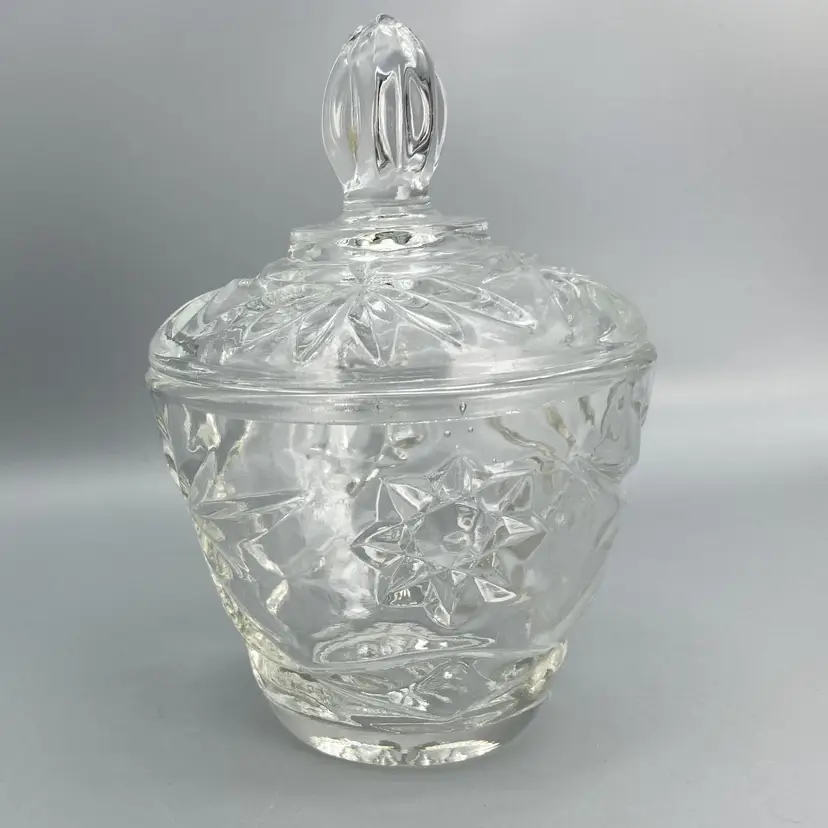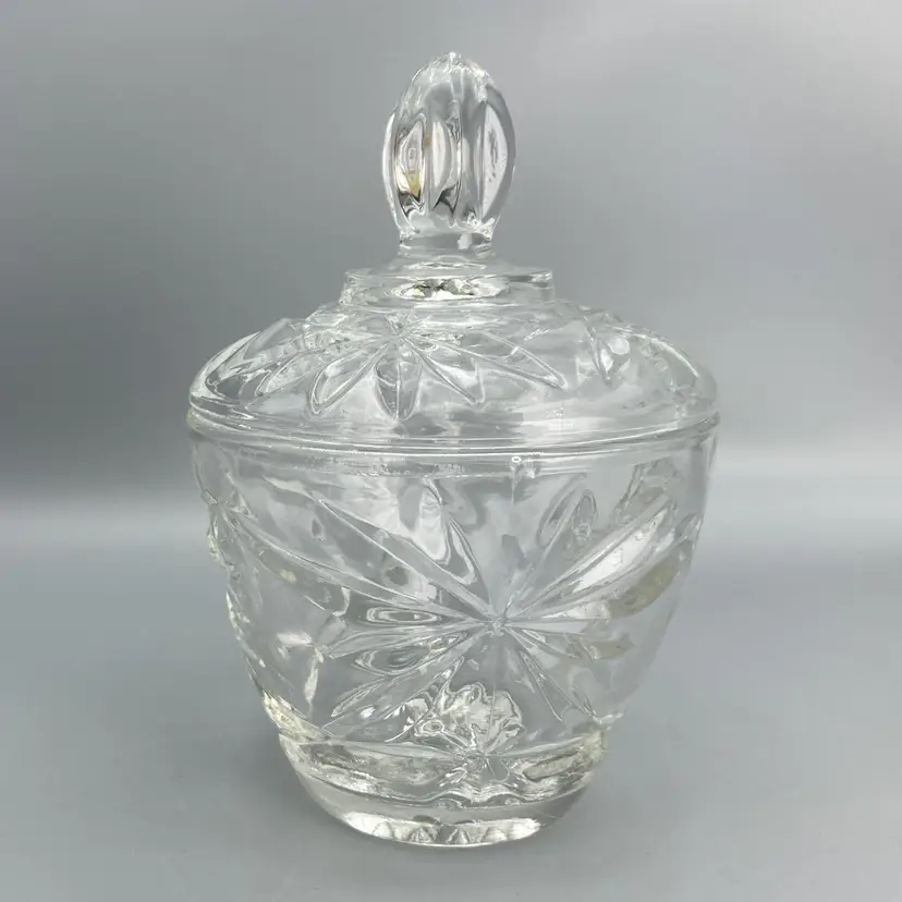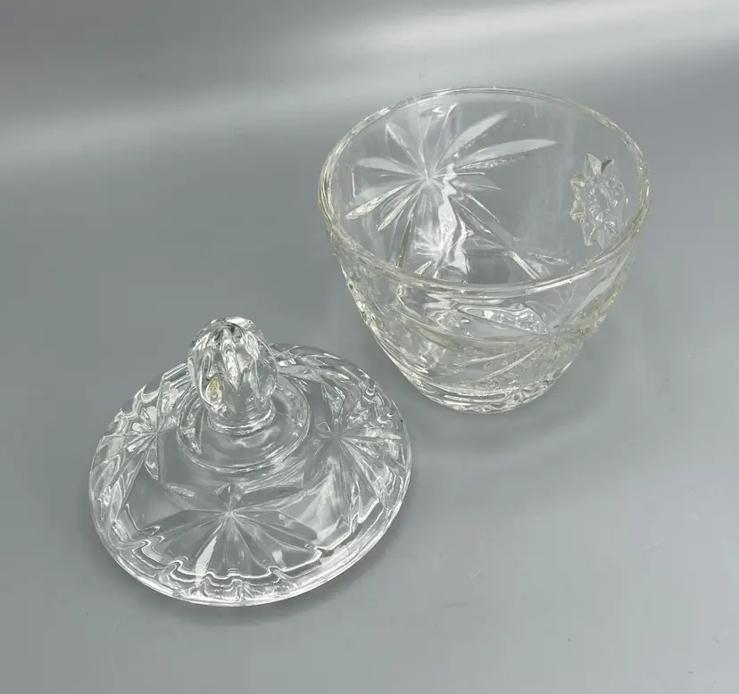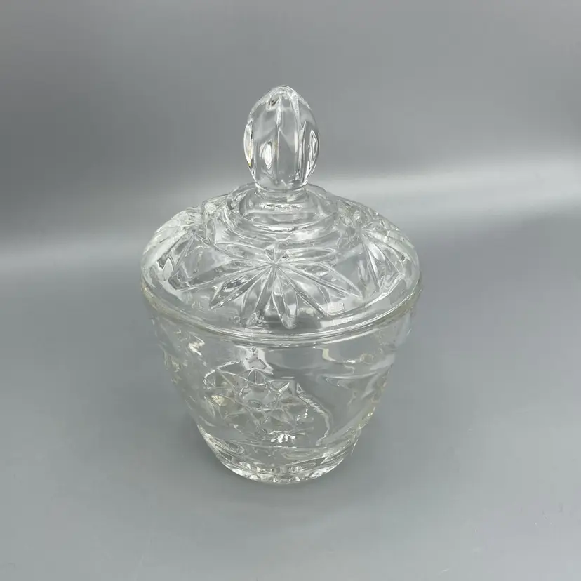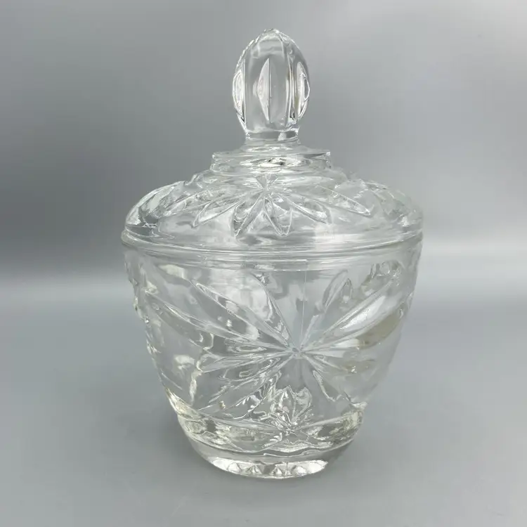 This dish is in good condition. It measures approximately 5 1/2" tall x 3 1/2" across the top x 2" across the base. Just the base dish without the lid is approximately 3" tall.