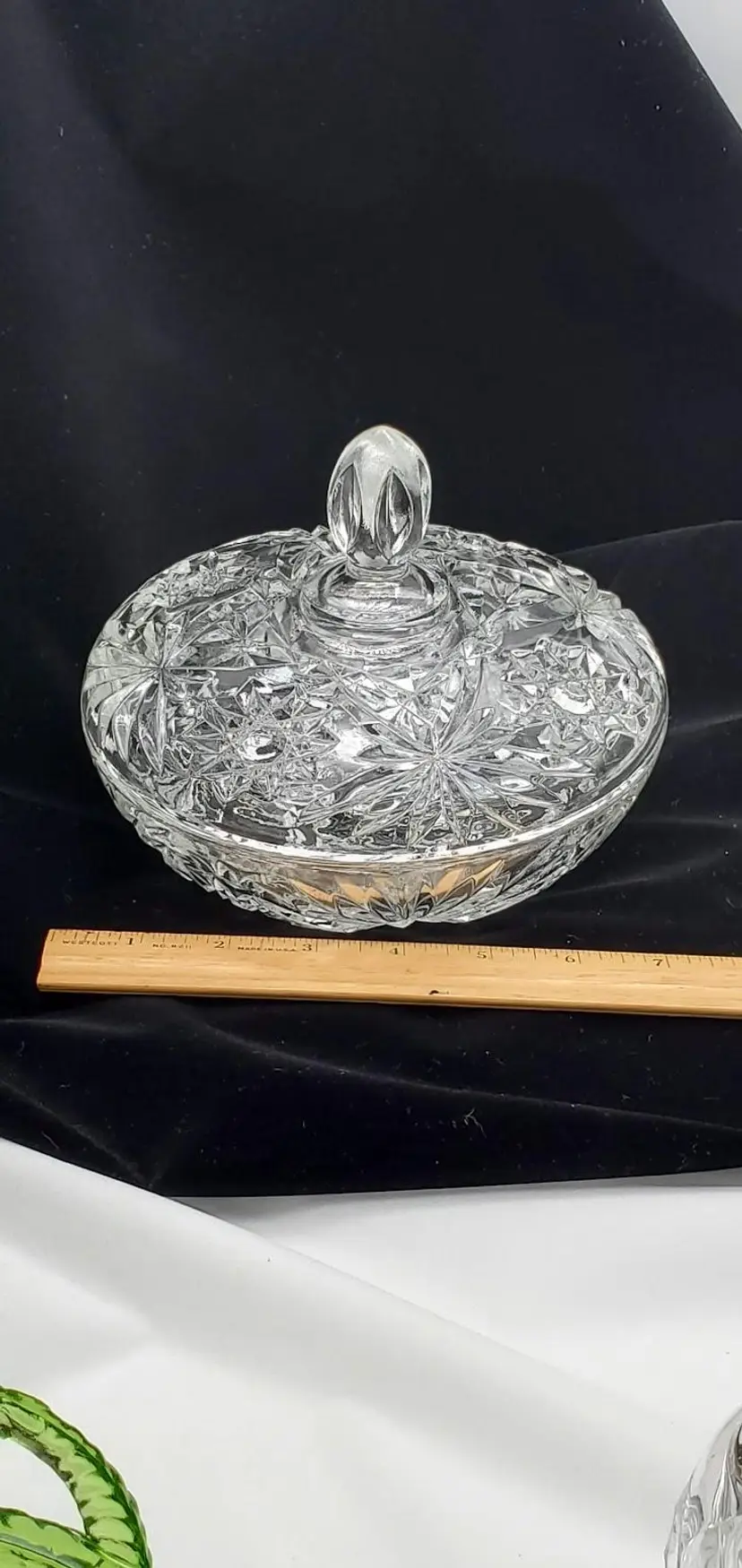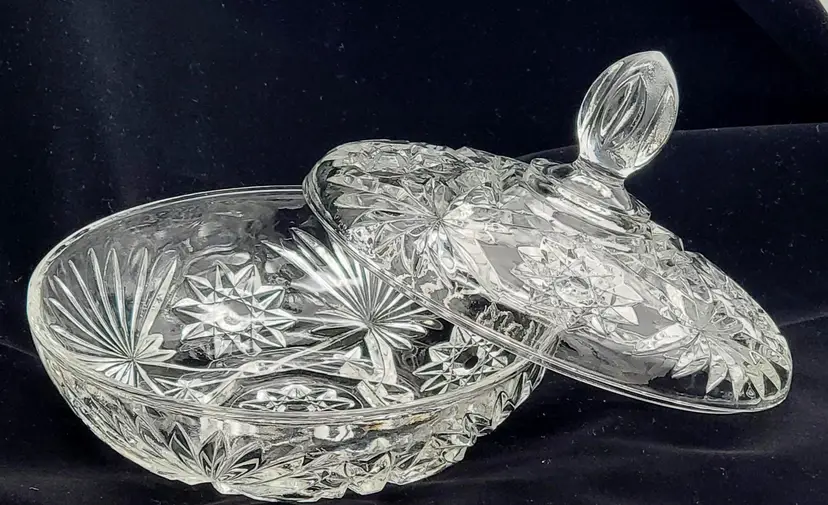 This original, United States-made candy dish stands at 6 inches tall and has a diameter of 7-1/4 inches.