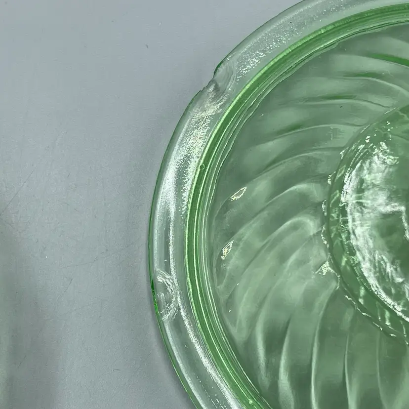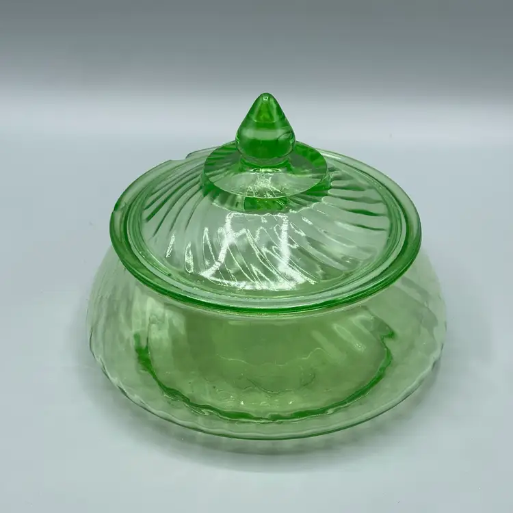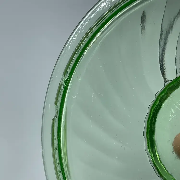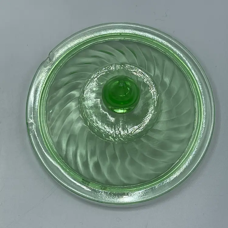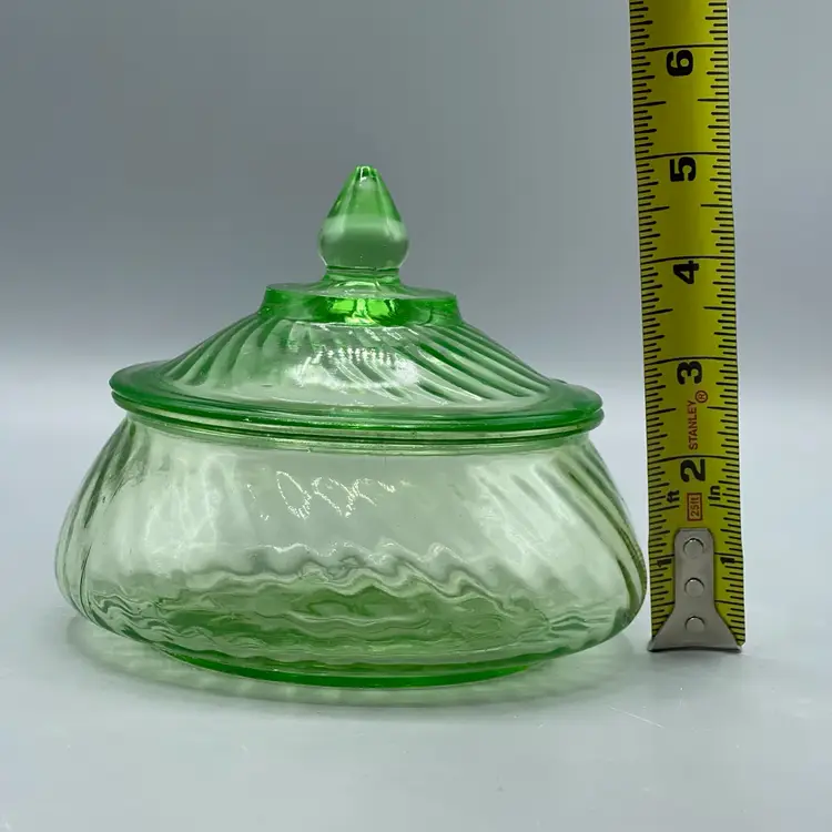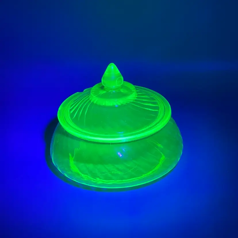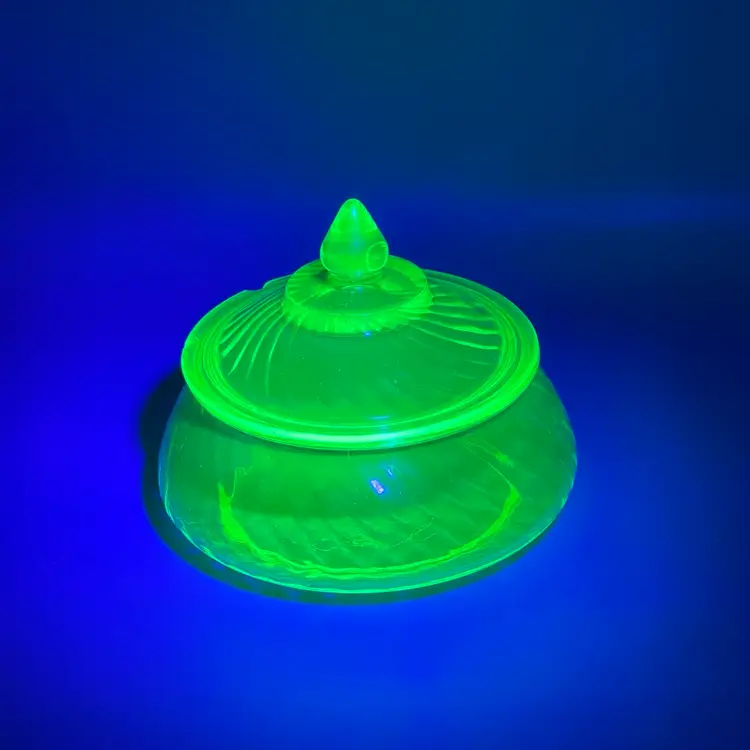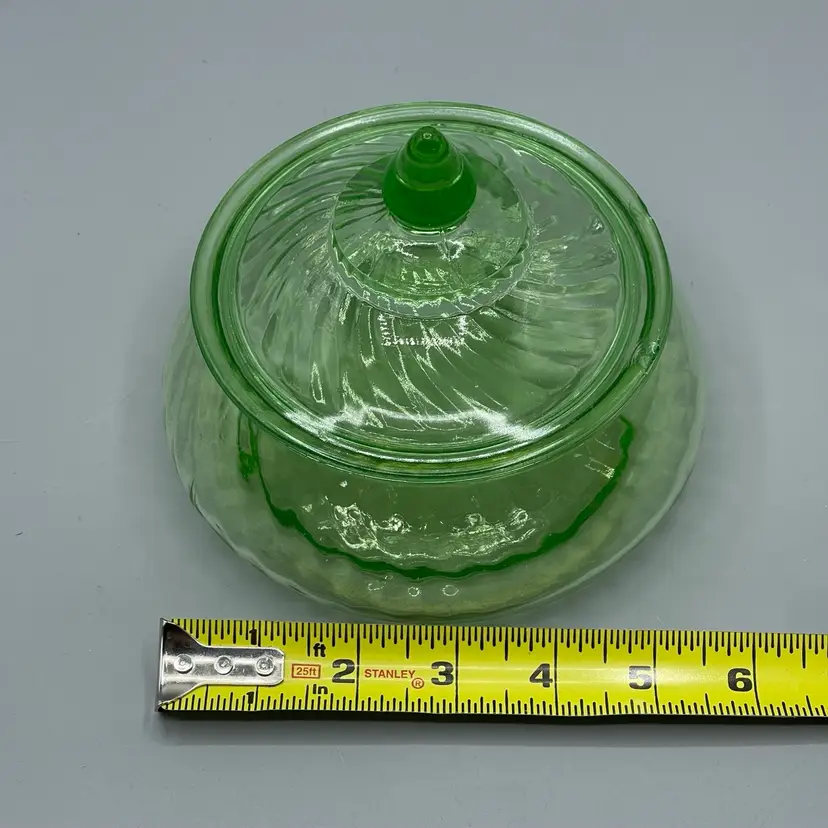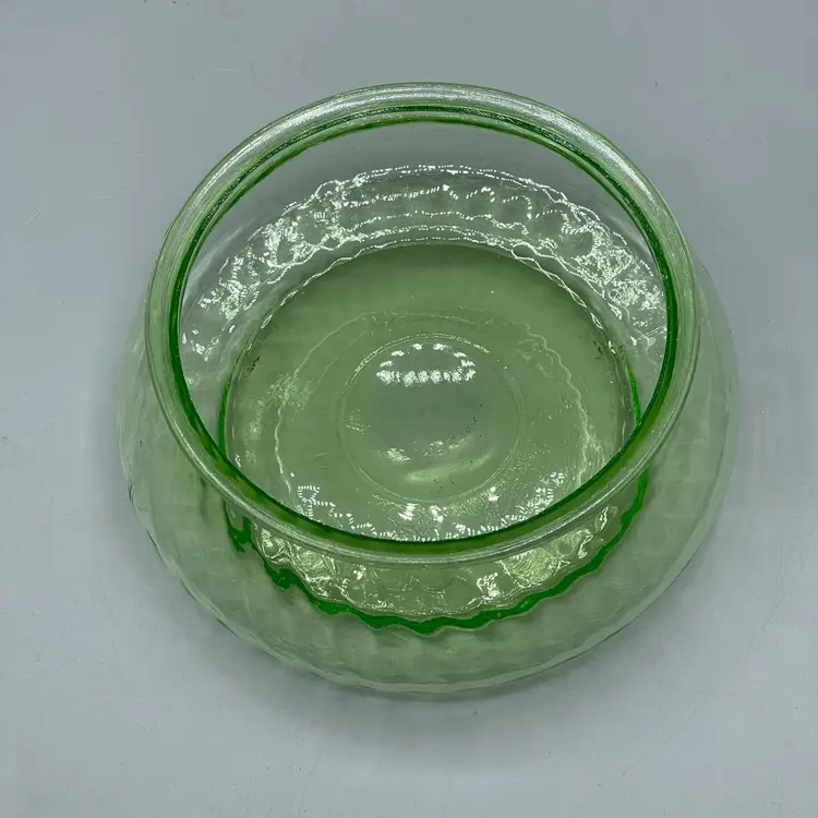 SEVERAL CHIPS ON LID. No chips or cracks on base. Glows green under UV. About 5-1/2 inches across and 5 inches tall with lid.