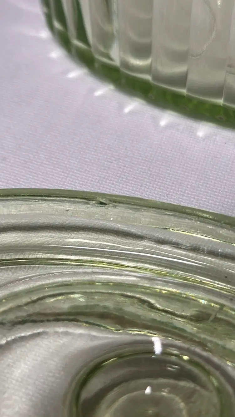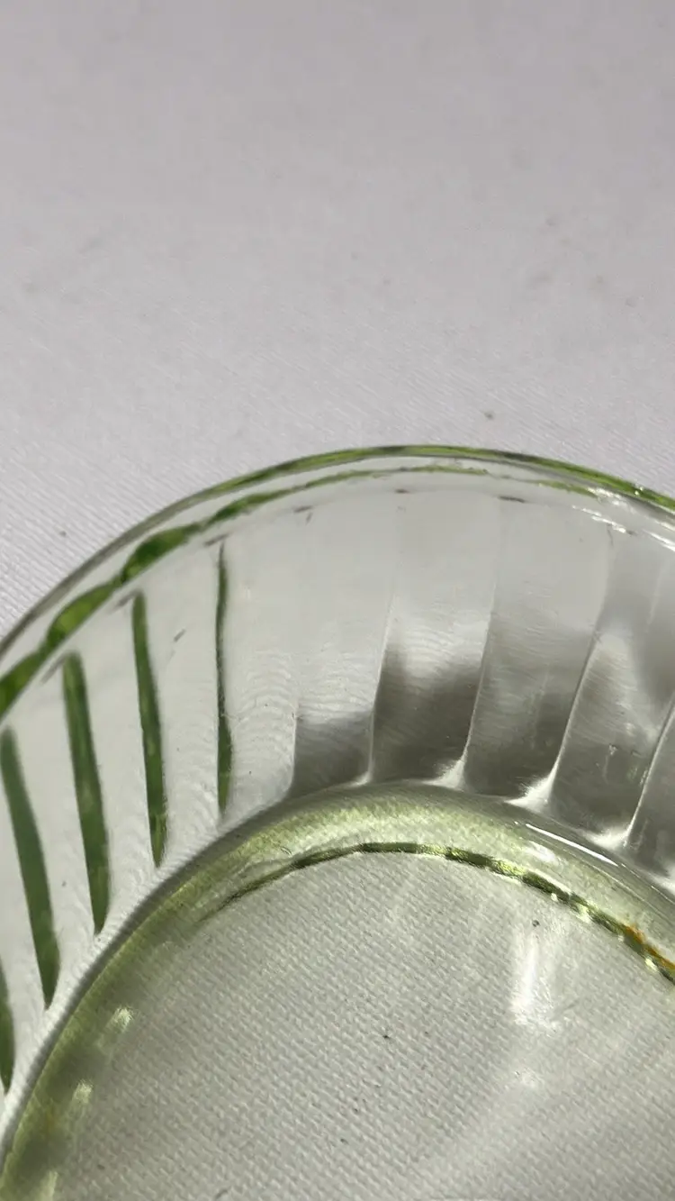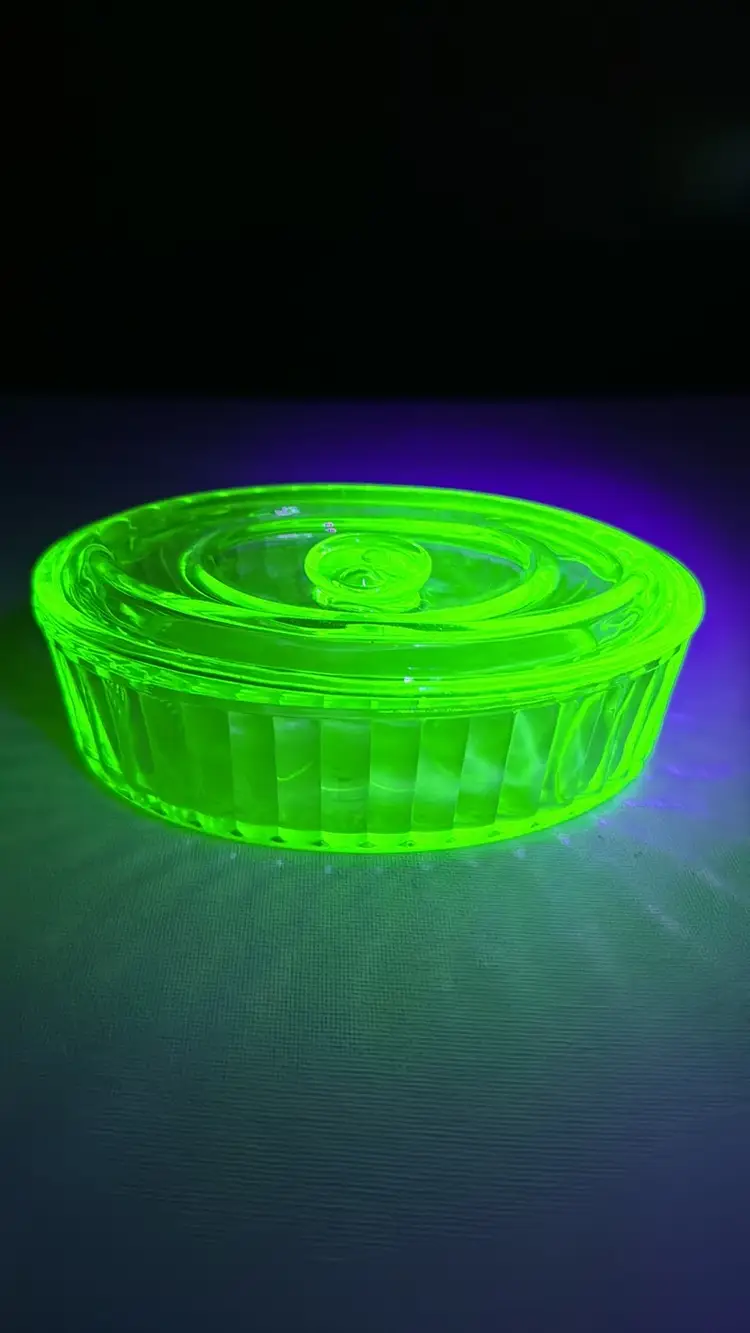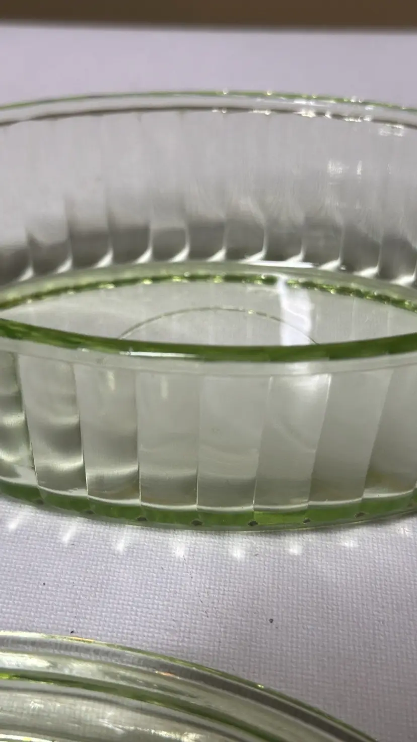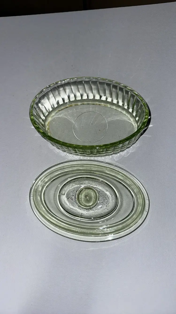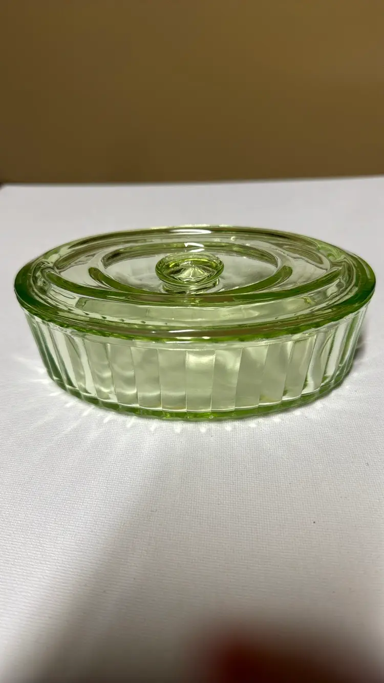 Vintage Anchor Hocking Uranium Green Ribbed Depression Glass Refrigerator Covered Dish 6” by 4” by 2” Really great condition no major chips just a few rough spots on some edges No cracks (3191924a)