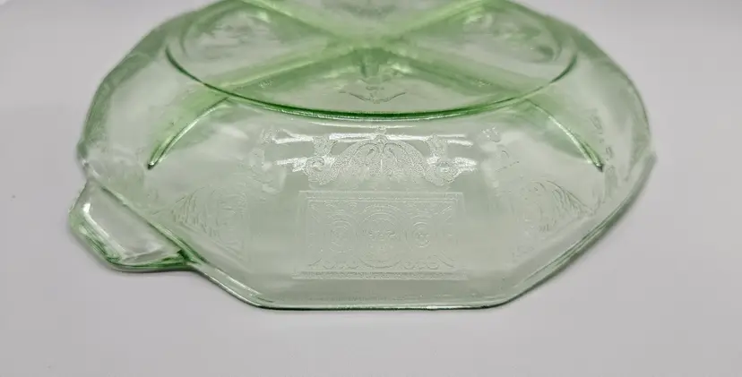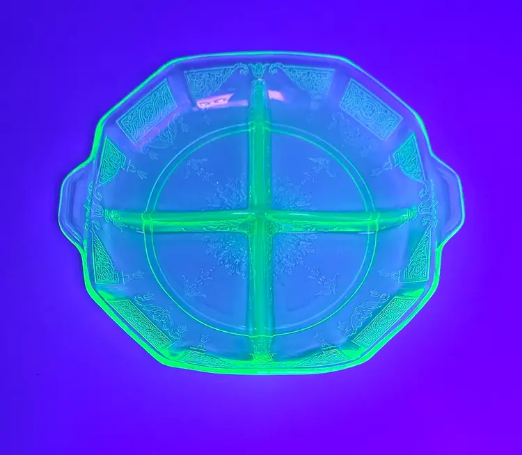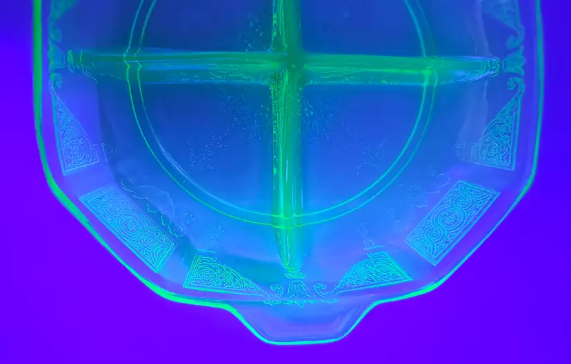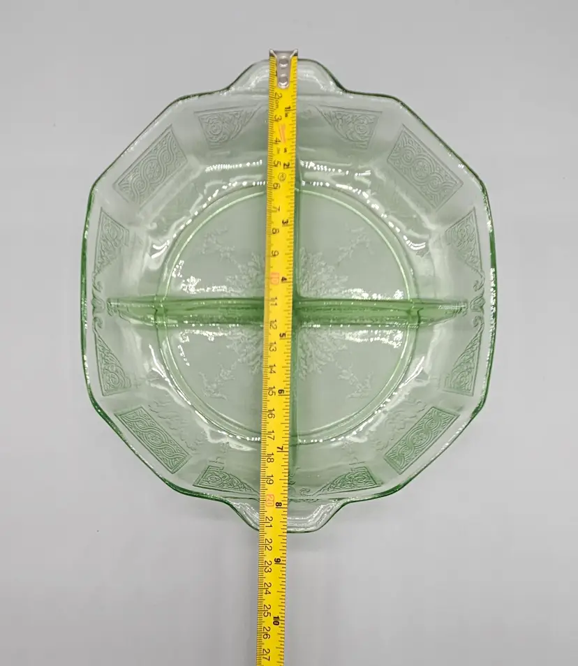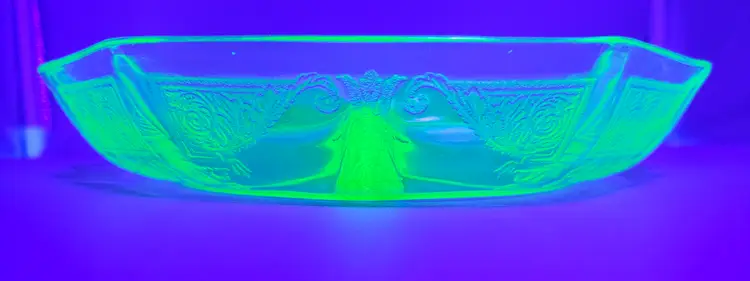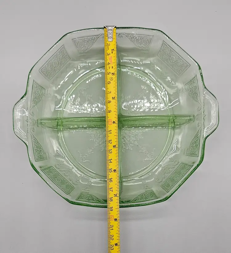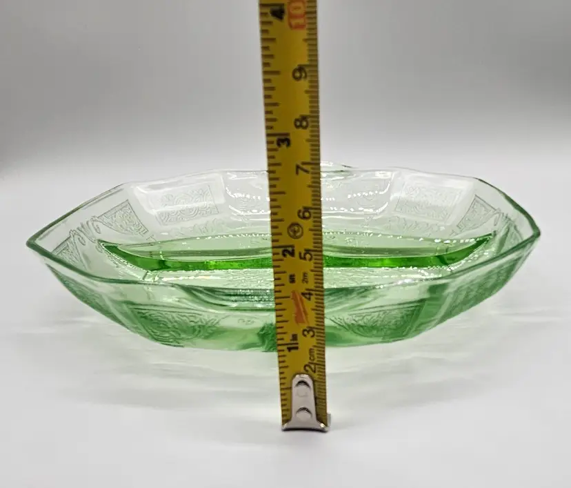 It is approximately 1 1/2" deep, 7 1/2" wide by 8 1/2" wide, from handle to handle. This dish is in Good, Pre-owned condition, showing minimal to no wear from previous use. There are no breaks, no cracks, no chips. It glows under UV Light.