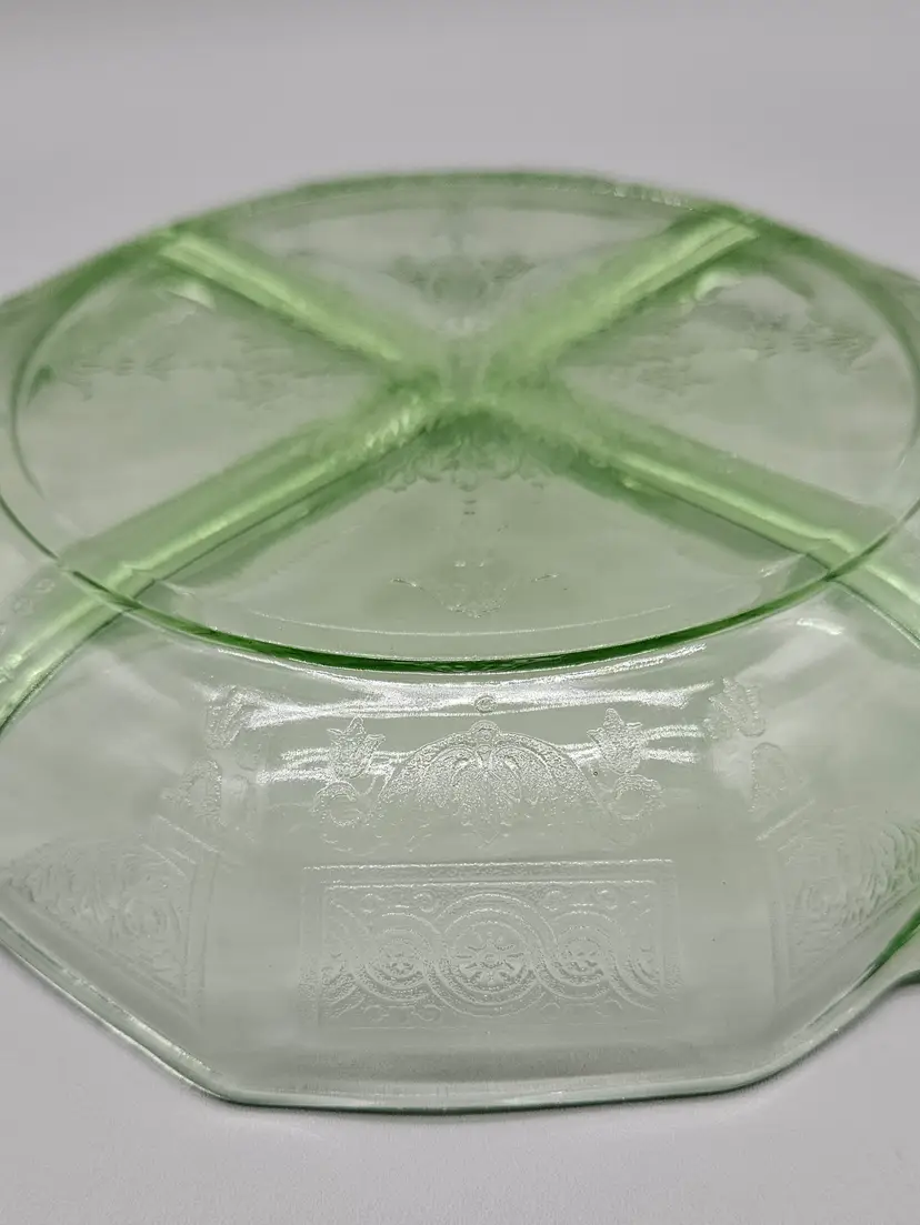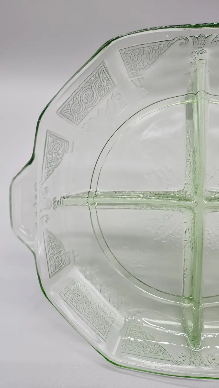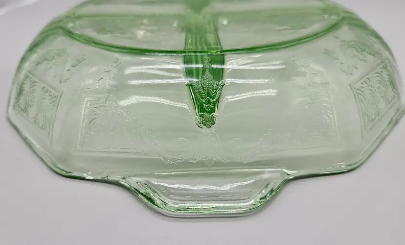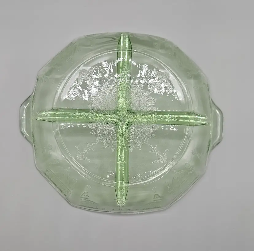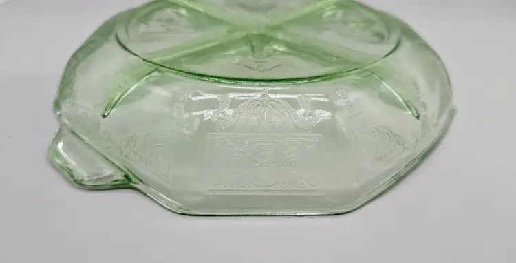 It is approximately 1 1/2" deep, 7 1/2" wide by 8 1/2" wide, from handle to handle. This dish is in Good, Pre-owned condition, showing minimal to no wear from previous use. There are no breaks, no cracks, no chips. It glows under UV Light.