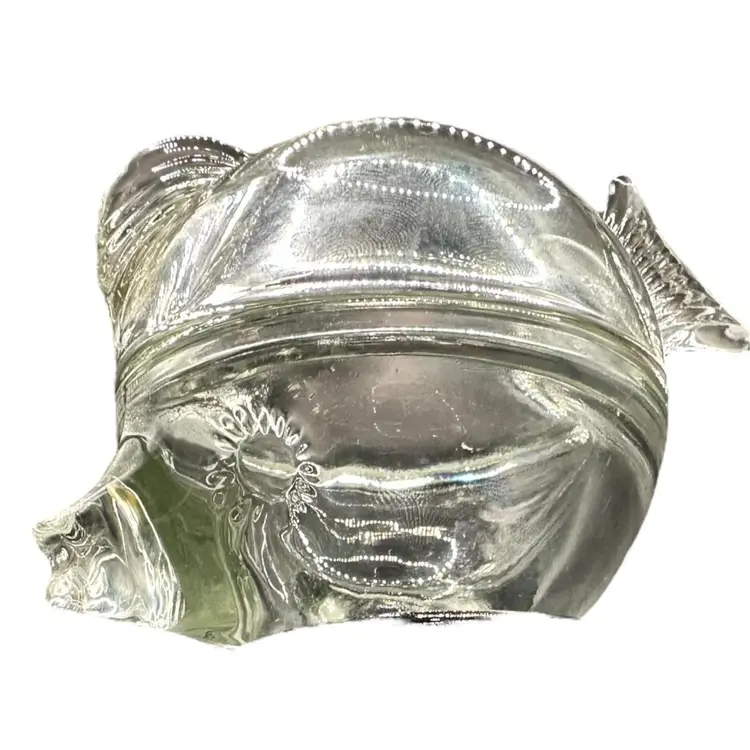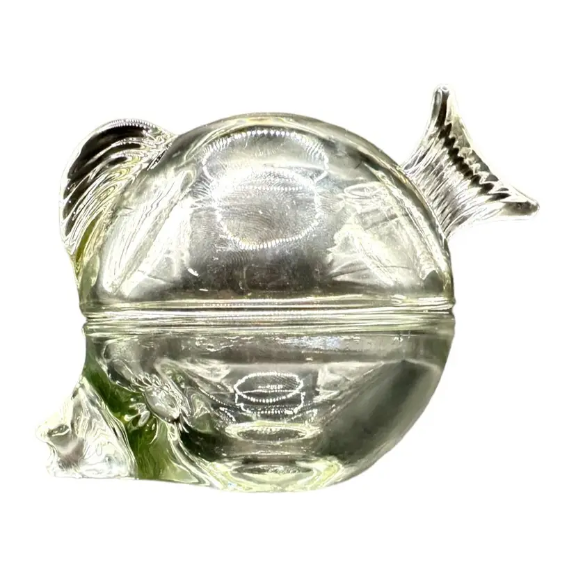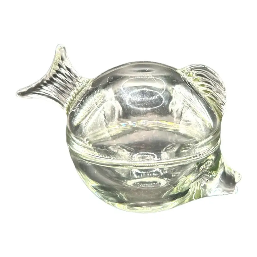 Anchor Hocking Vintage Crystal Clear Covered Glass Round Fish Dish 5" USA (1950's or 1960's) covered lidded trinket dish in the shape of a blow fish with a large bubble shaped belly. This is a nice heavy and sturdy piece, made of thick glass. In excellent condition with no chips or cracks. 5" wide at its widest and about 4" tall.