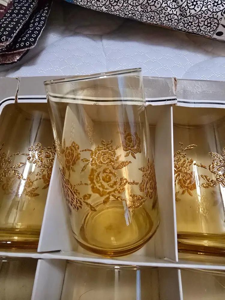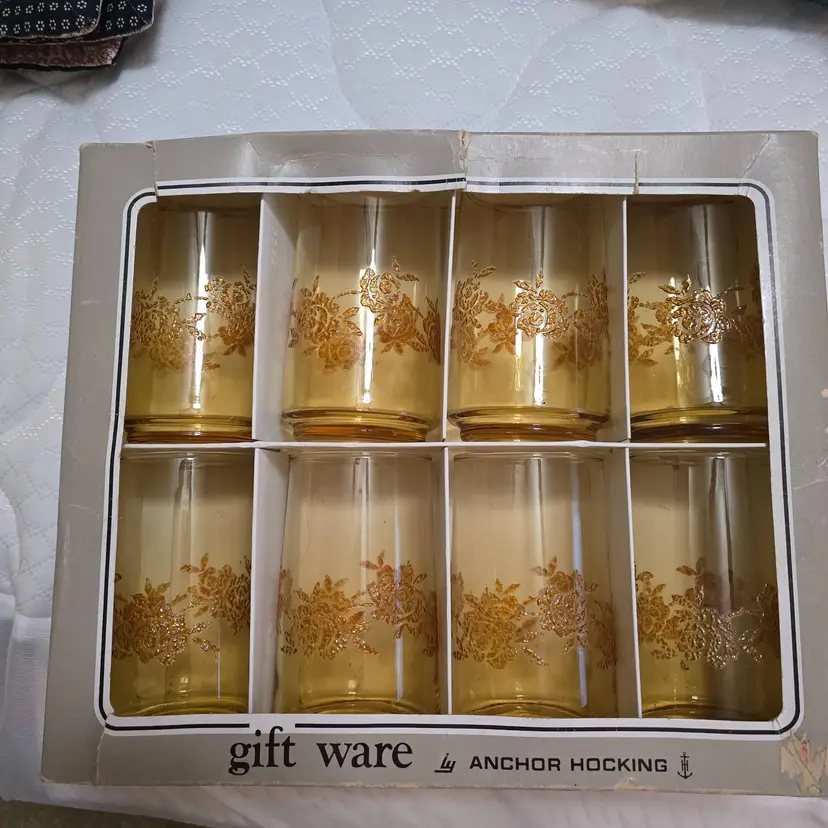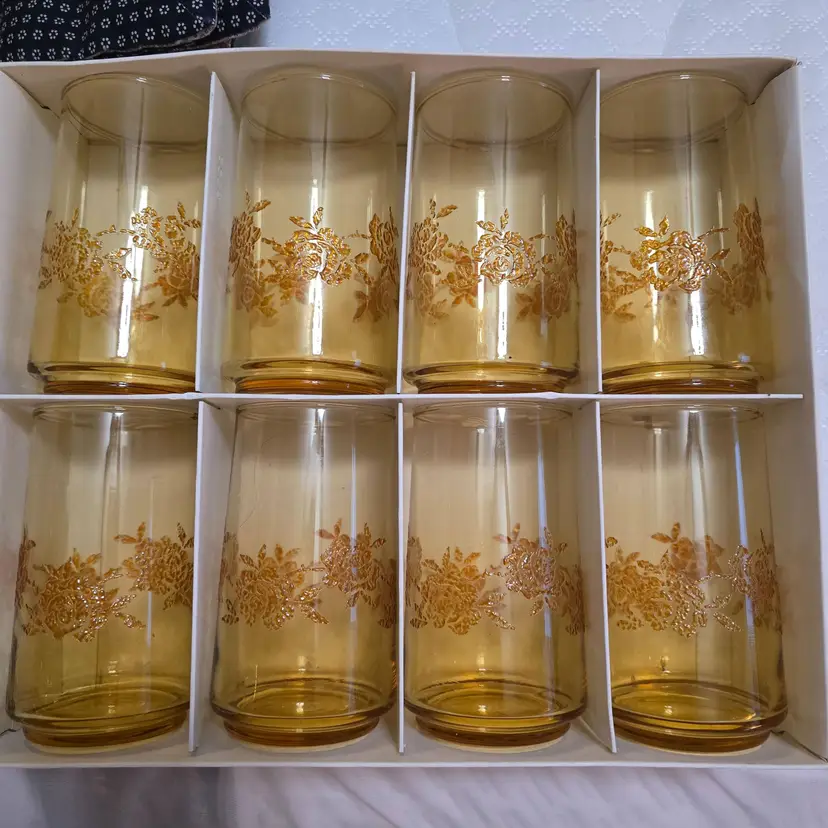 Set of 8 vintage Anchor Hocking glasses. Beautiful amber color with a raised flower embellishment. Excellent condition. Measures 4 3/4" high