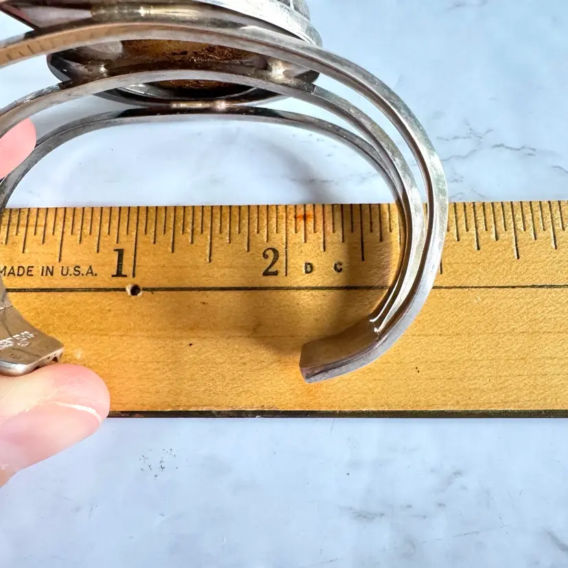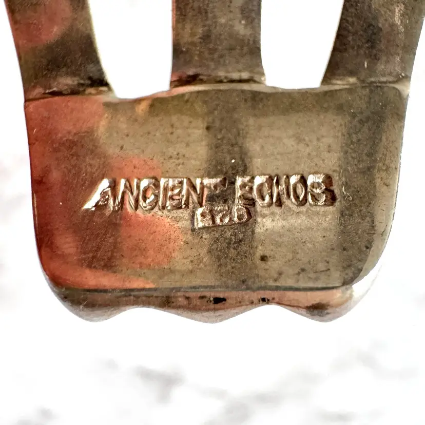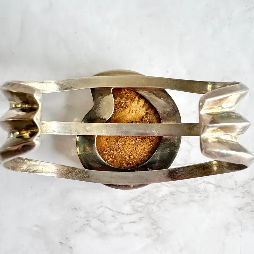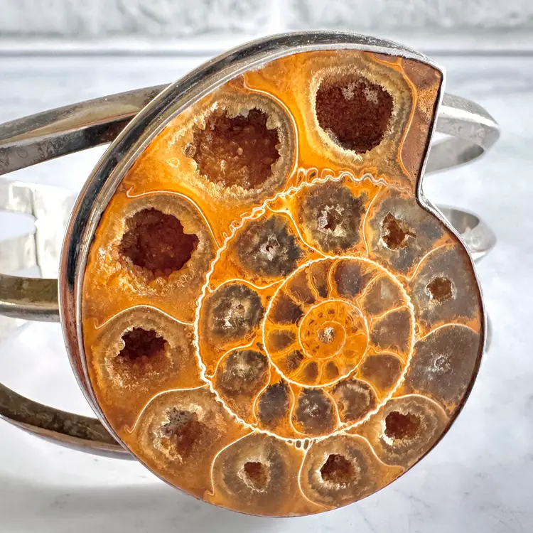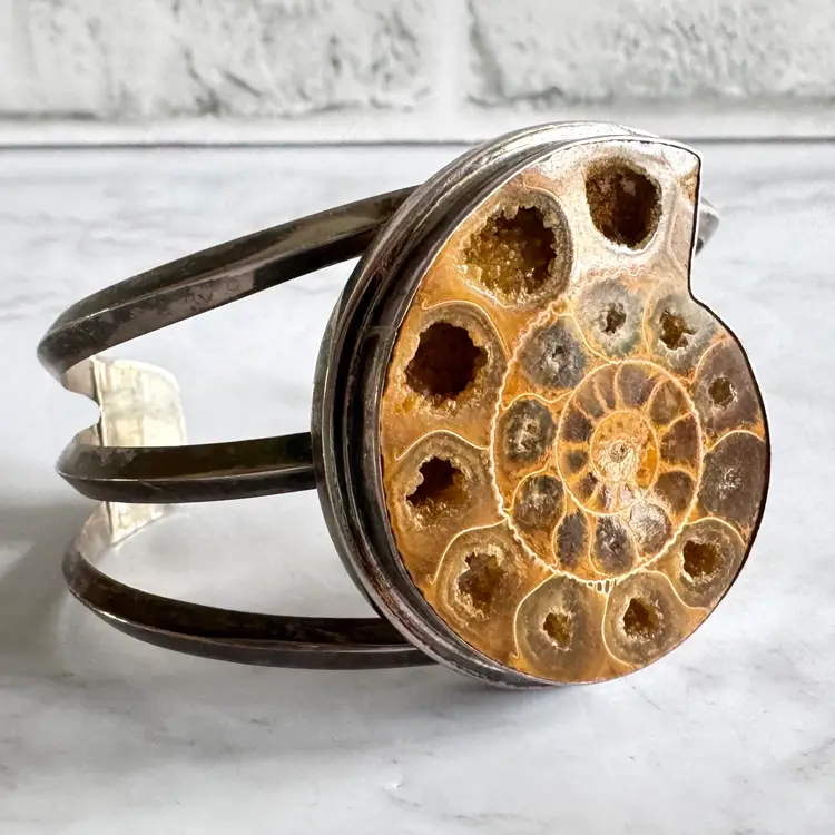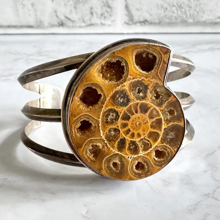Free Priority Mail shipping in the US. Vintage handmade ammonite shell shaped fossil and sterling silver cuff bracelet, measures 2-5/8 inches in length, slightly adjustable to size, marked Ancient Echos 925, excellent condition, 62g weight