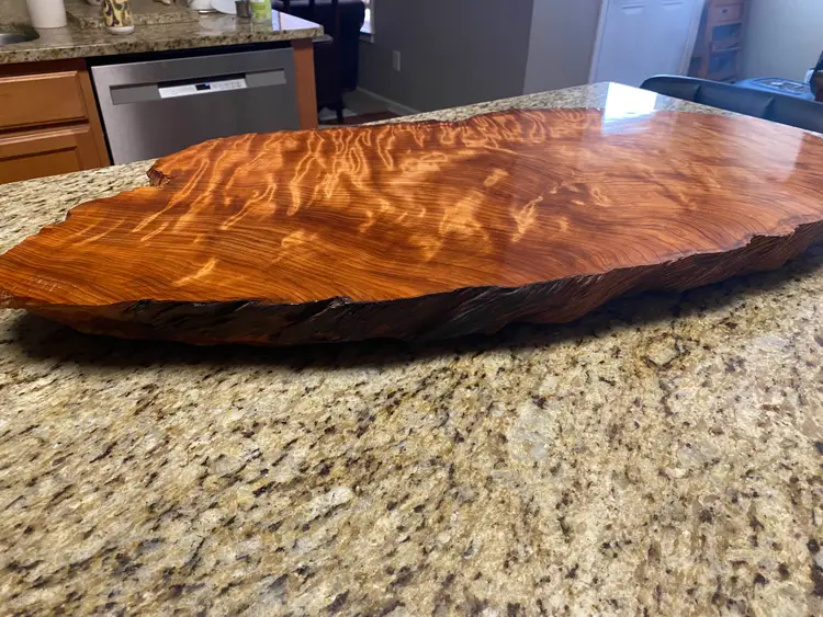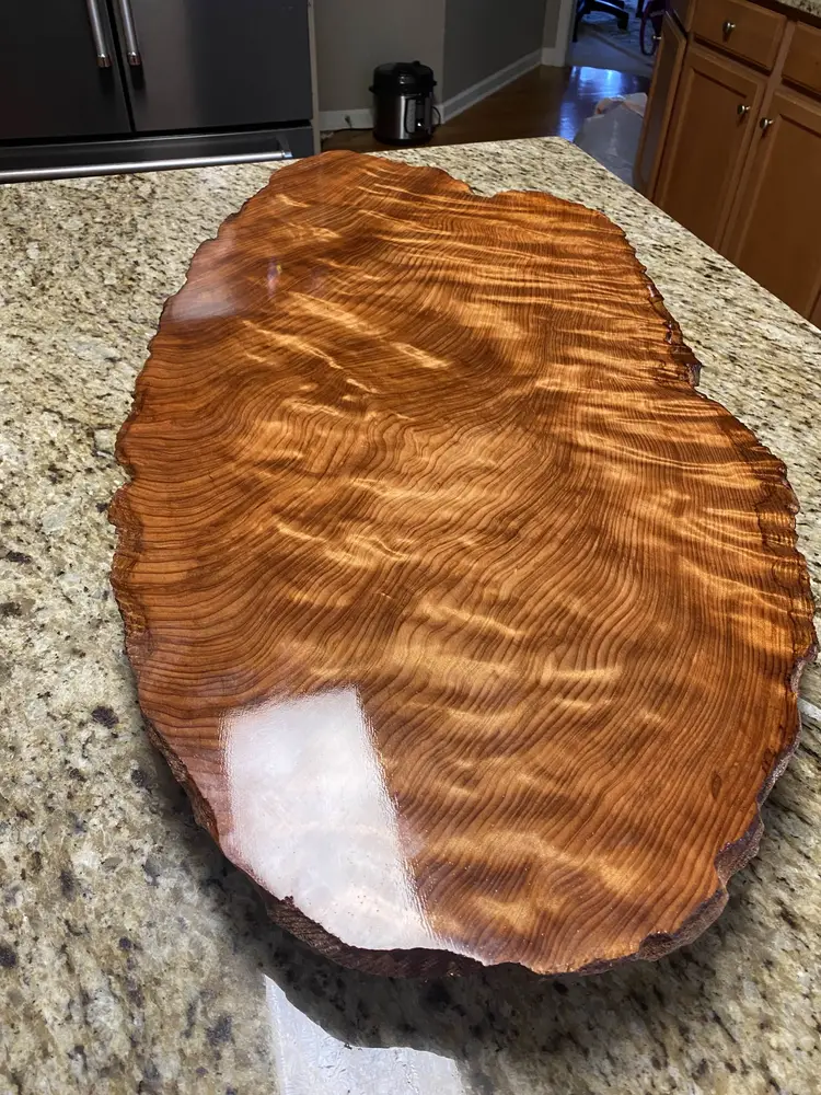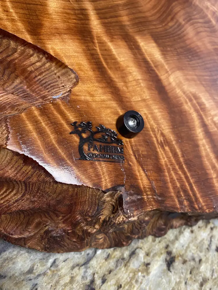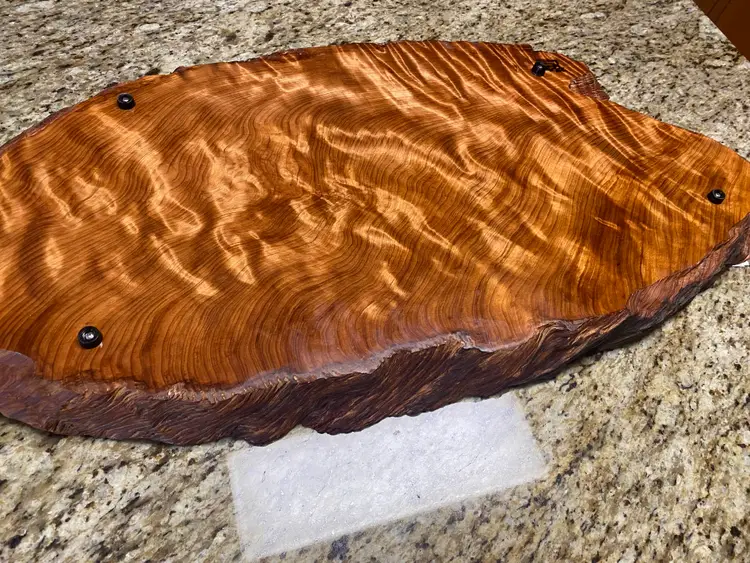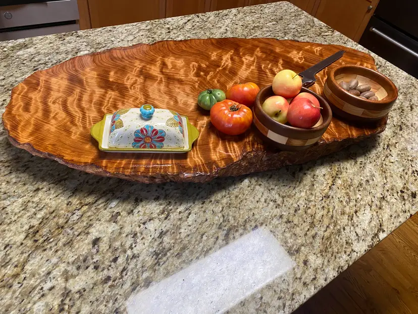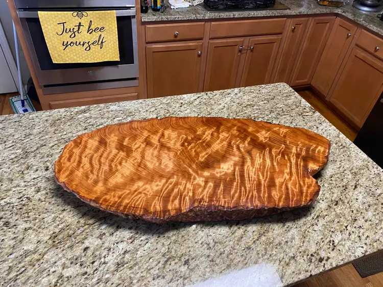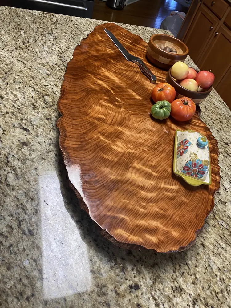 The slab has substantial thickness and presence while remaining manageable for everyday use. Rubber feet are installed to keep the board elevated and protect countertops. The surface is finished with multiple coats of a durable urethane, making it well suited for serving, display, or use as a kitchen accent without concern for spills or moisture.