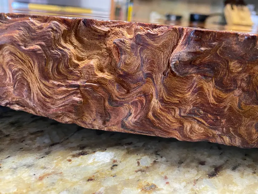 The grain features pronounced movement and waviness, with exceptionally tight growth rings that look more like flowing lava than actual wood.