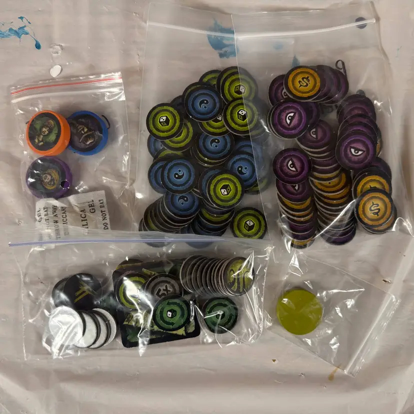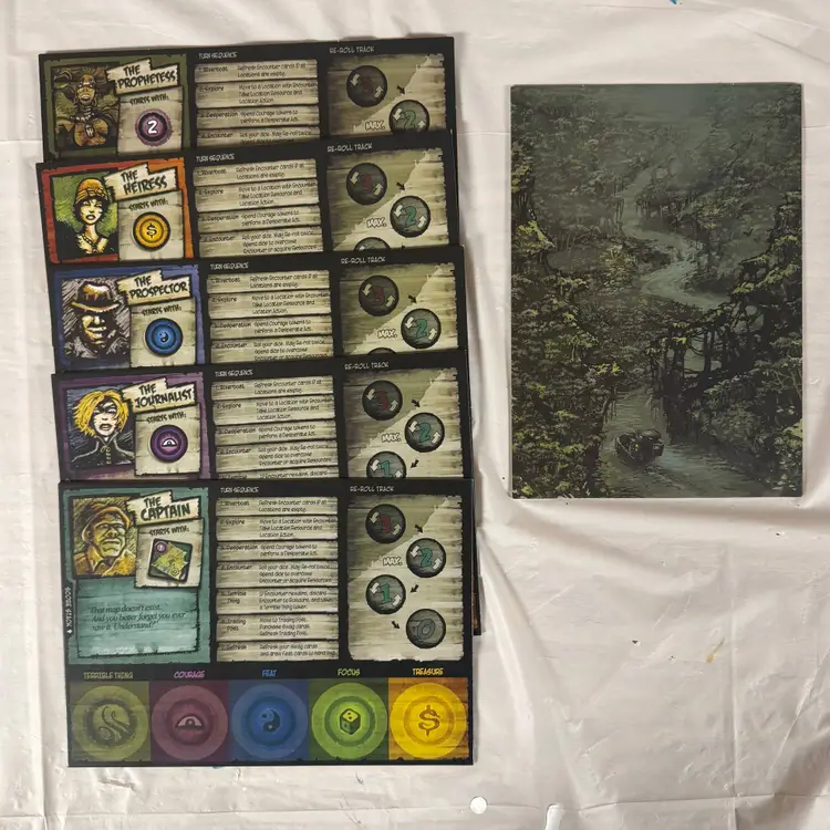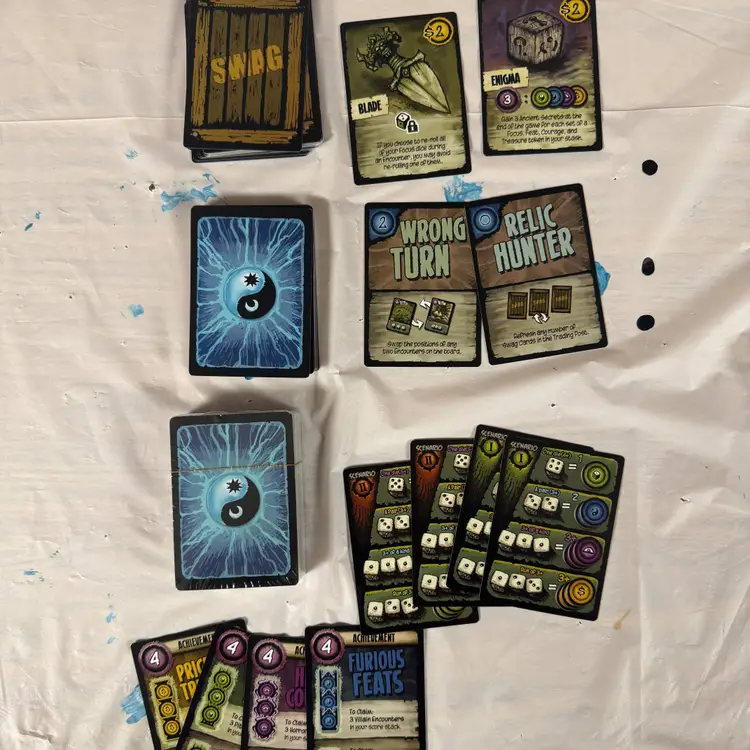 Game play involves rolling dice to achieve combinations: runs, pairs, three or more of a kind, and single die showing a particular number or higher. Dice combos are used to overcome Encounter cards that are worth points at the end of the game, and/or to acquire the four resource tokens in the game: Focus, Courage, Treasure and Feat.