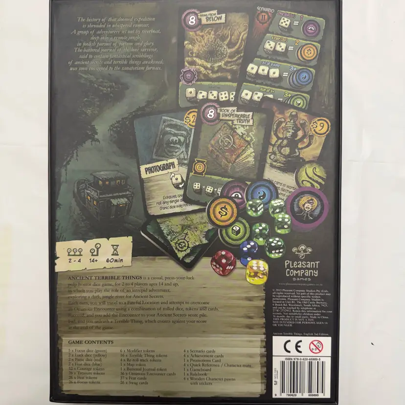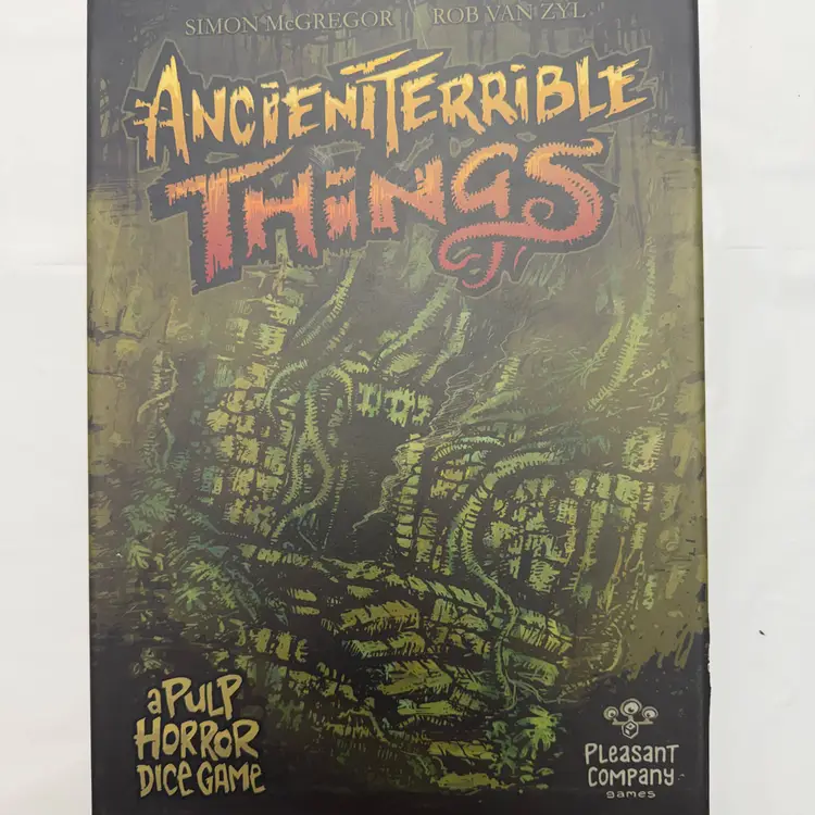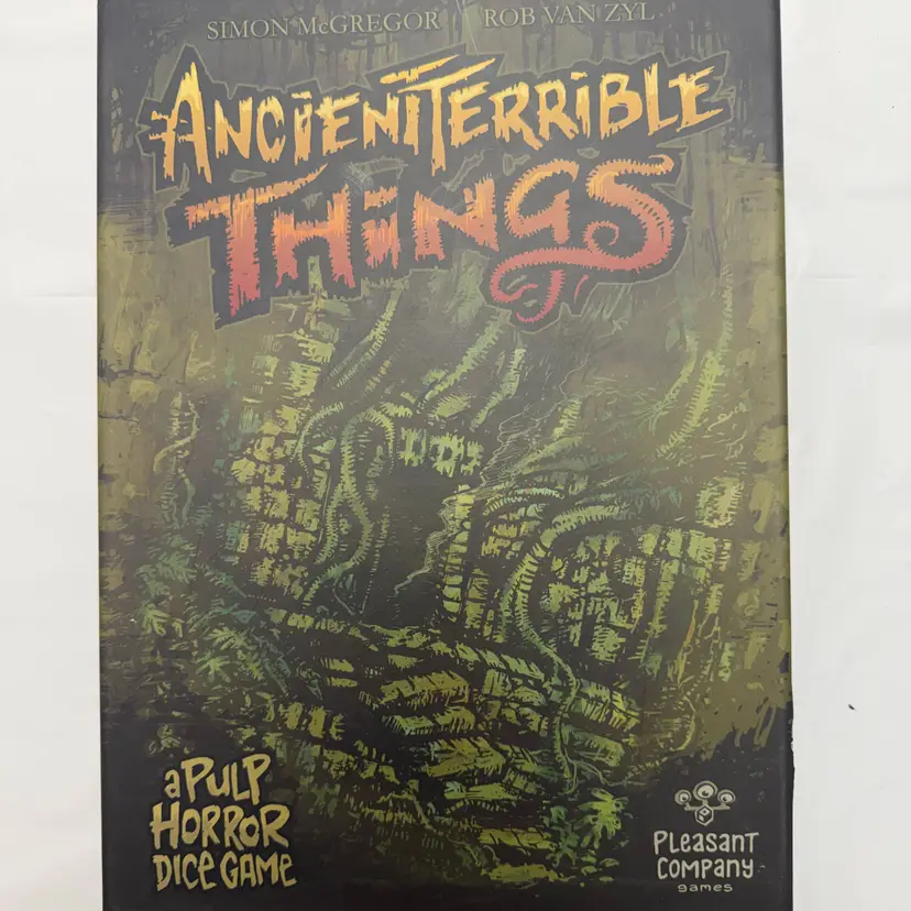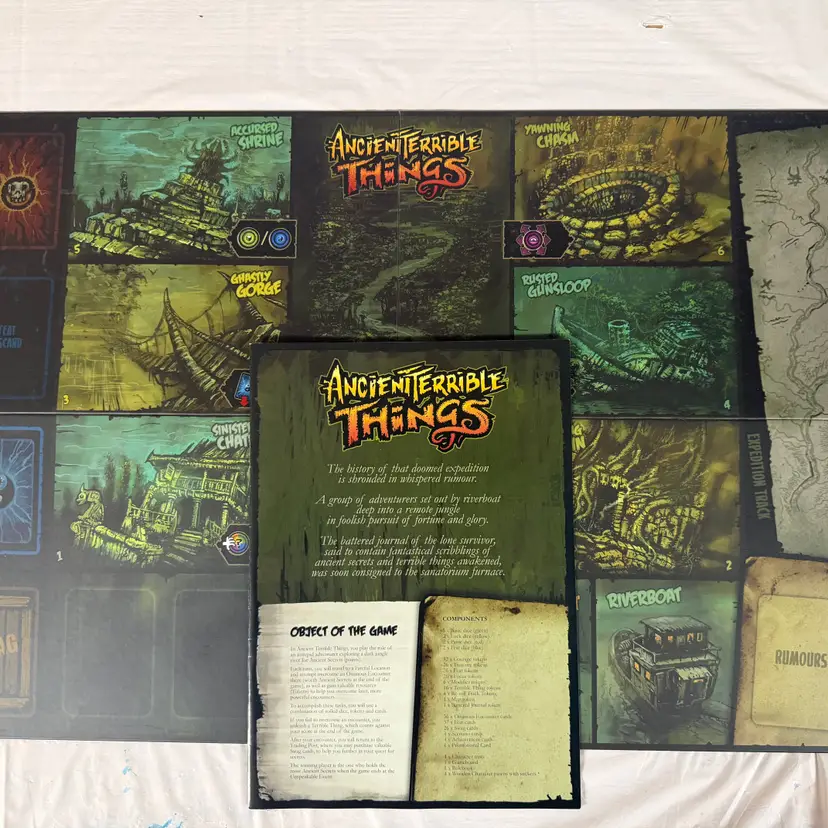 In Ancient Terrible Things, a pulp horror adventure game for 2-4 players, you play the role of an intrepid adventurer, exploring a dark jungle river. Each turn you must travel to a Fateful Location, face an Ominous Encounter, and attempt to unlock its Ancient Secrets. If you succeed (using a combination of dice, tokens and cards), you add the Secrets to your score; if you fail, you unleash a Terrible Thing, which counts against your score at the end of the game. The object of the game is to be the player with the most Ancient Secrets when the game ends at the Unspeakable Event.