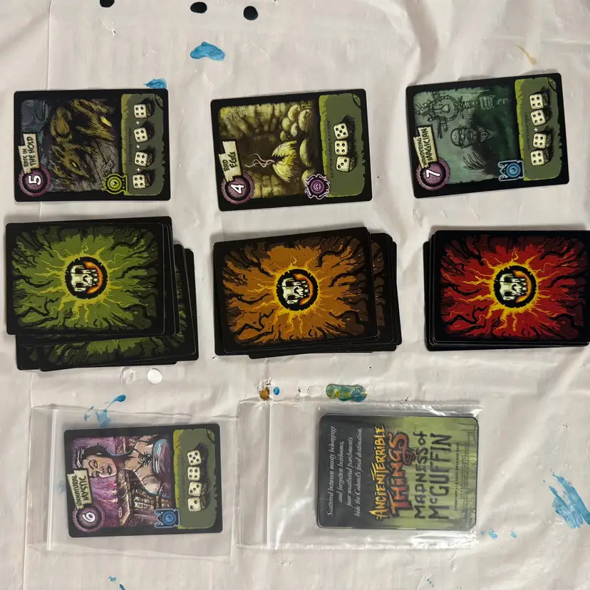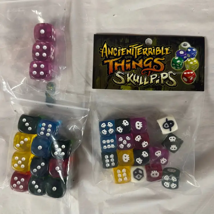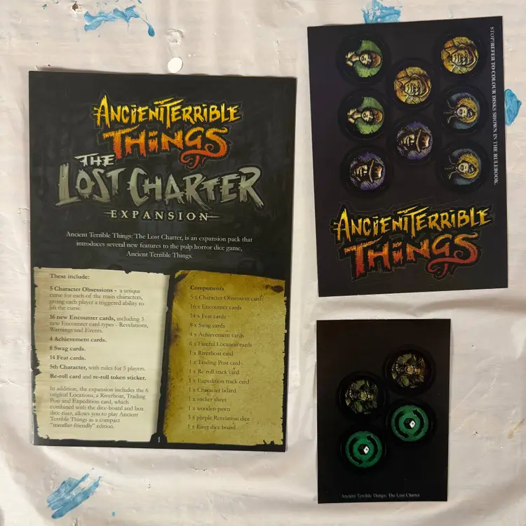 Ancient Terrible Things: The Lost Charter is a travel expansion pack for the pulp horror dice game Ancient Terrible Things. The expansion includes 54 new cards, including new Encounter card types, Achievements, Feat and Swag, Character Obsessions, travel-ready Location cards, 3 Revelation dice, and a full colour rulebook with details of travel set-up, new card effects and rules for solo play and 5-player game. The expansion comes in a compact travel-friendly box with a raised dice-roller platform and a 5th playable character with character token.