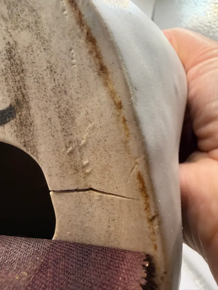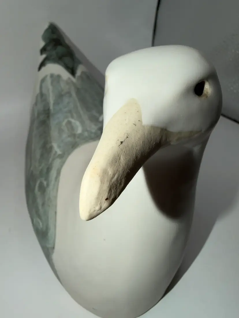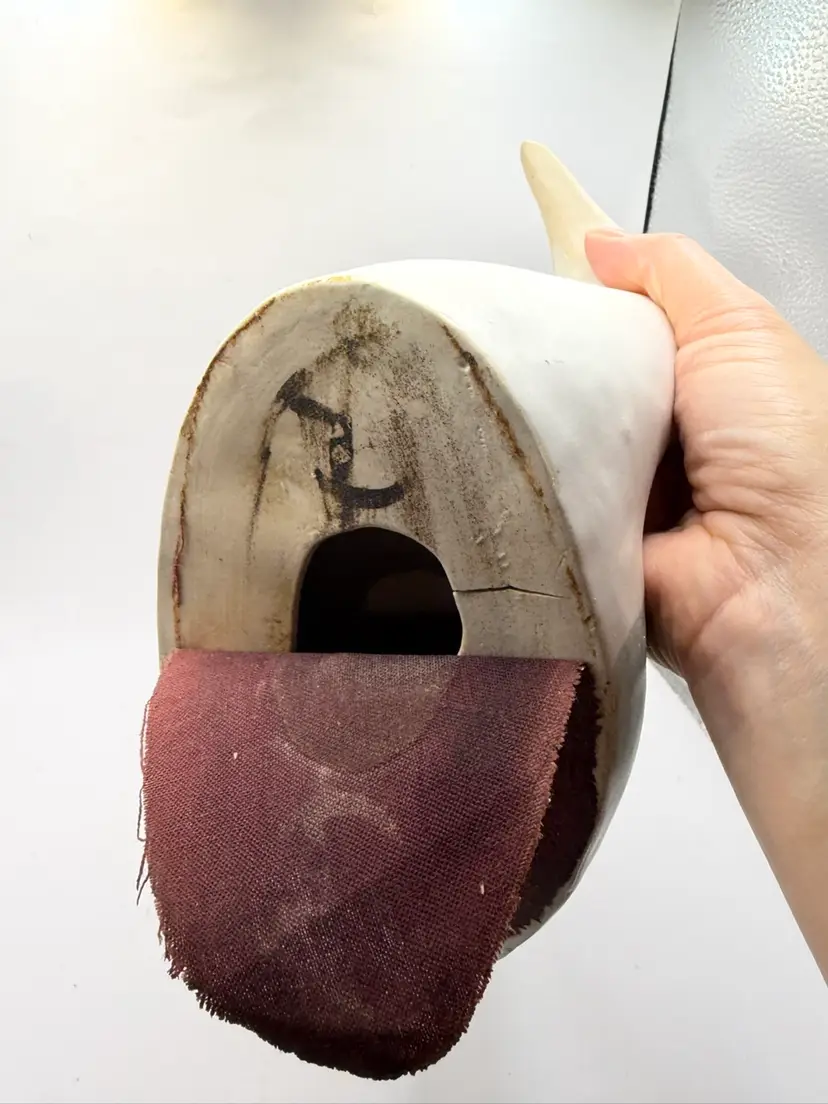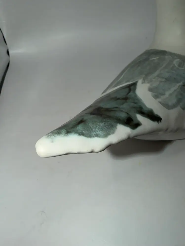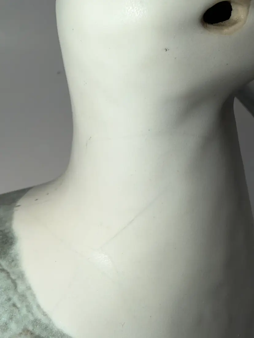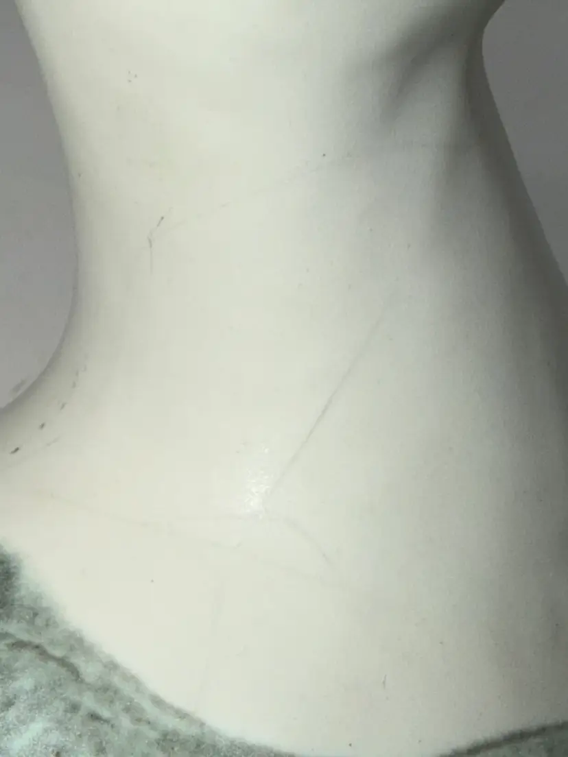 Hairline cracks at neck (see photos) and one crack under felt (see photo) 12”L Signed under felt