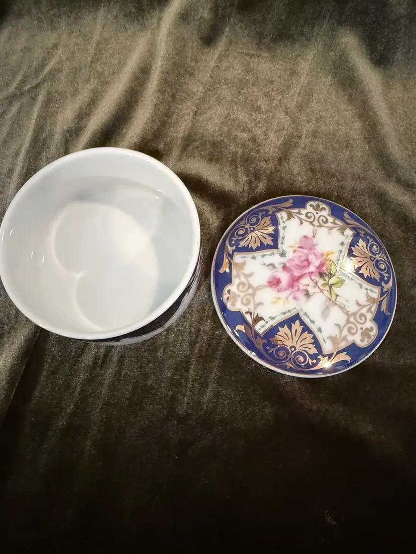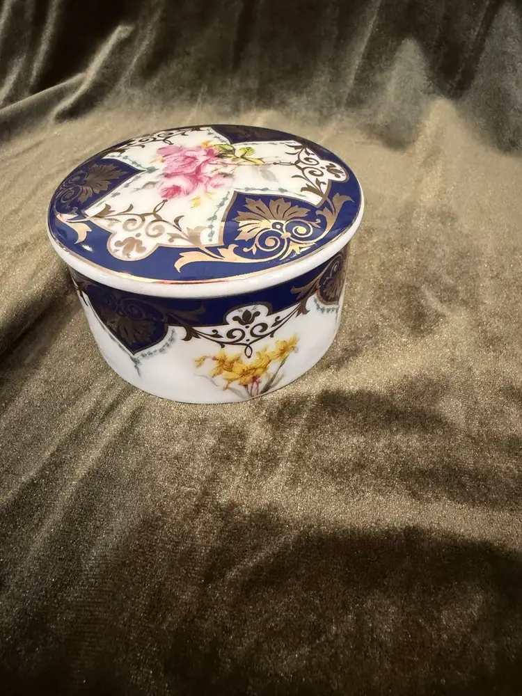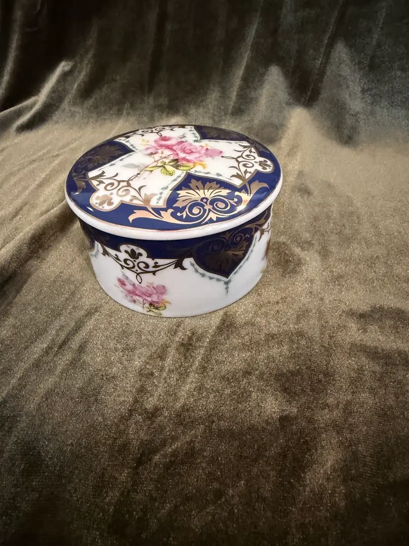A porcelain lidded trinket jar from the Biltmore Estate Collection, featuring the Vanderbilt Service pattern with cobalt blue borders, gold scrollwork, and pink floral accents.