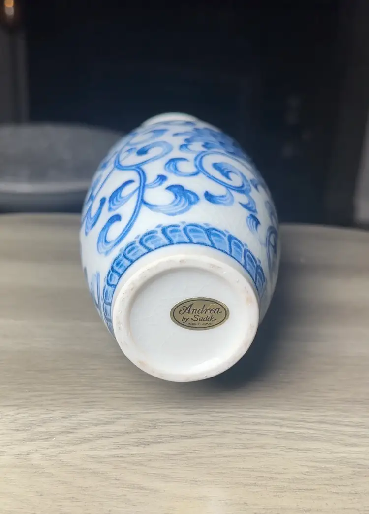 The Andrea Sadak Japan Blue and White Vase is an 8" tall handmade piece originating from Japan, featuring a traditional Japanese floral design of mums with a crazing effect. This collectible vase reflects the cultural influence of Japanese artistry and craftsmanship, making it a unique and decorative addition to any collection. 8” x 4”.