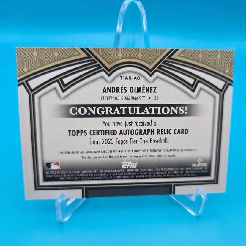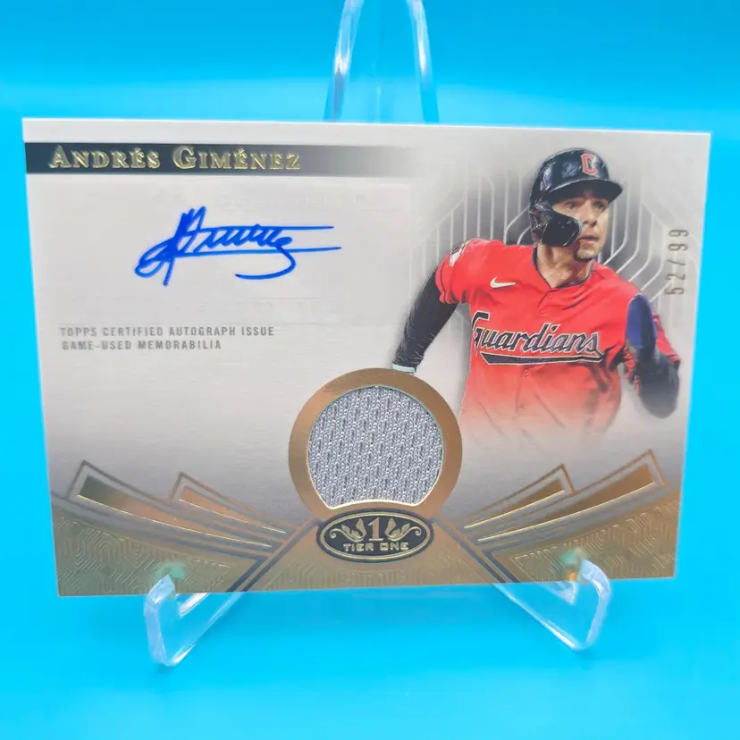 2023 Topps Tier One autograph relic card of platinum glove award winner Andres Gimenez numbered 52/99. NM or better condition. Shipped BMWT. Former Guardians 2B and new Toronto Blue Jays player.