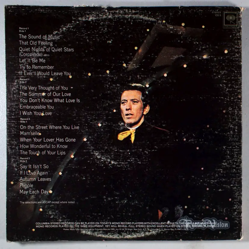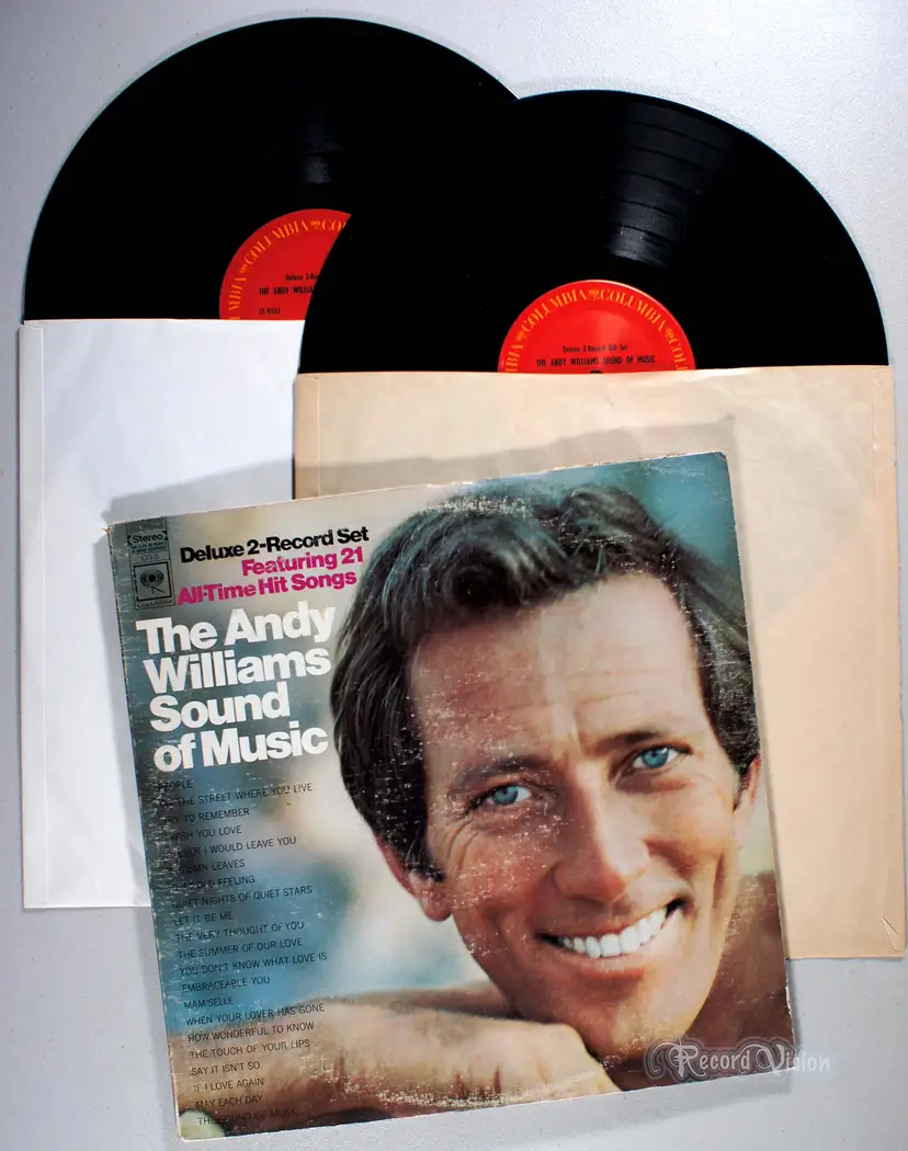 Sound of Music, is a double compilation album by Andy Williams. Although seven of the 21 tracks date back to his years with Cadence Records, where he racked up a half a dozen top 10 pop hits, the selections here are more in the vein of Standards or Easy Listening fare, as exemplified by the two charting singles included -- On the Street Where You Live and Quiet Nights of Quiet Stars (Corcovado). The album made its first appearance on the Billboard Top LPs chart in the issue dated February 1, 1969, and remained there for seven weeks, peaking at No. 139, and it entered the UK album chart on January 24, 1970, and reached No. 22 there over the course of nine weeks. The plan to use the collection to promote Williams's previous Columbia releases was explained in an article in the issue of Billboard magazine dated November 23, 1968: "Andy Williams' 18 Columbia albums are featured in an extensive promotion being sparked by The Andy Williams Sound of Music, a special two-record gift package.... A special [color] sleeve displaying Williams' 18 albums has been designed for" the two LPs in the set. The front and back cover and gatefold photos for this album are credited to Keats Tyler. The album's only new track, The Sound of Music, was recorded on October 3, 1968. In 2003 it was included on the Williams collection from Collectables Records entitled B Sides and Rarities.
