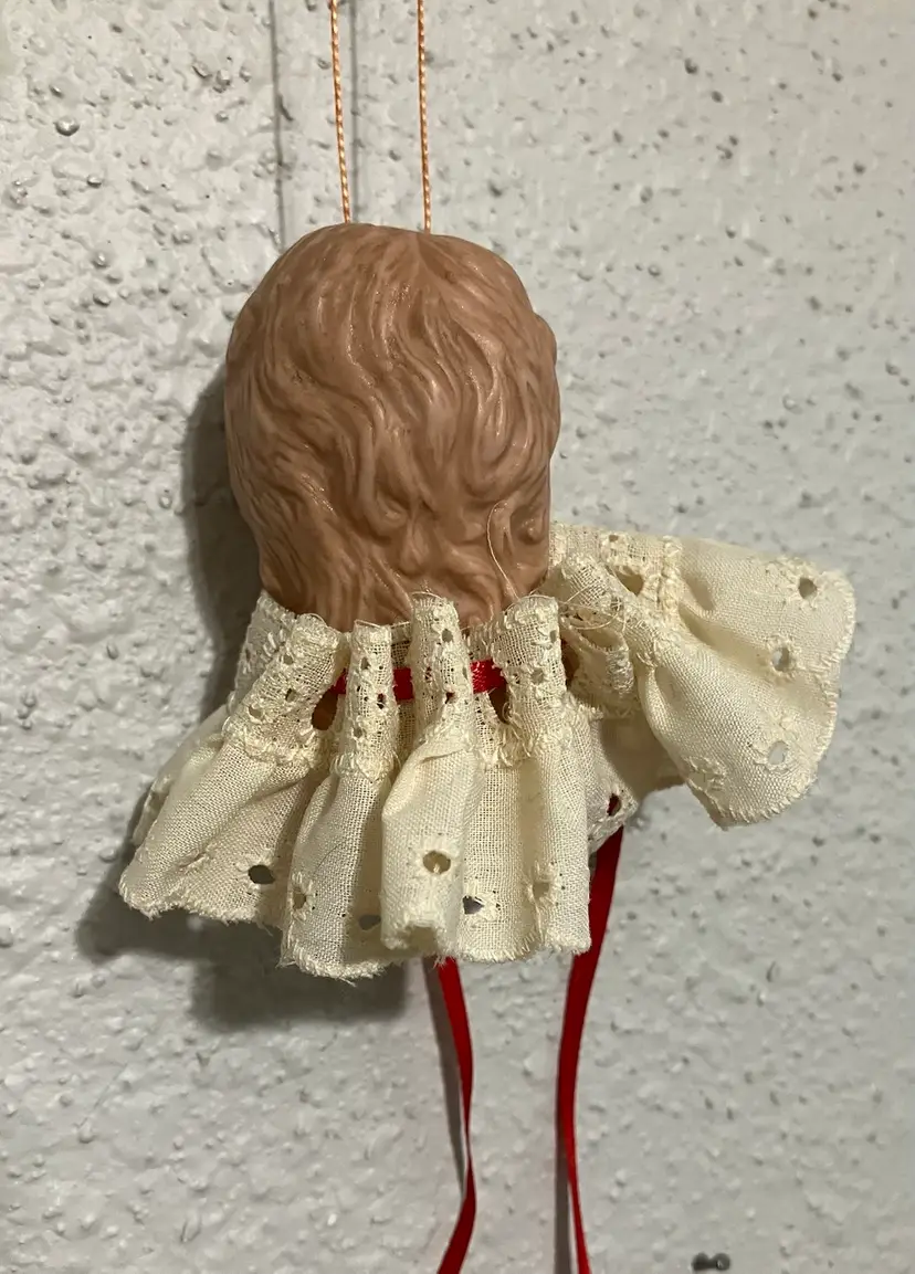 Vintage Angel ornament with ivory eyelet collar and red ribbon approx 2” wide x 2 1/2” high