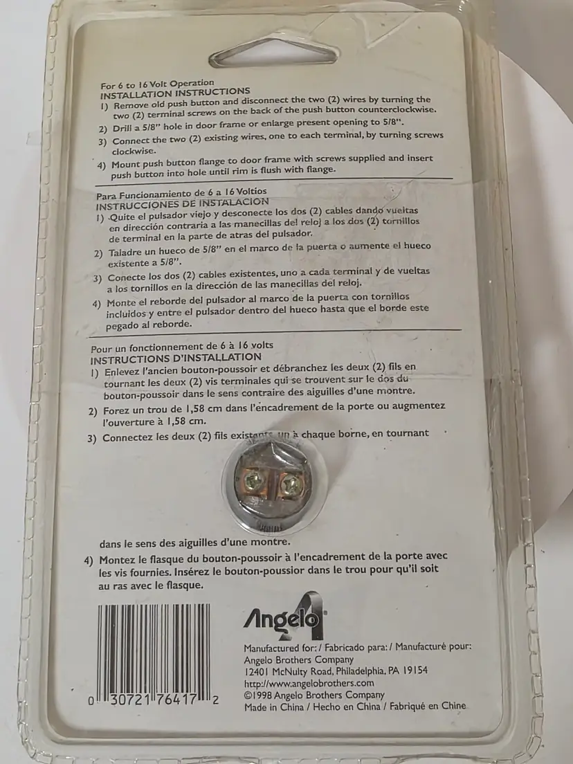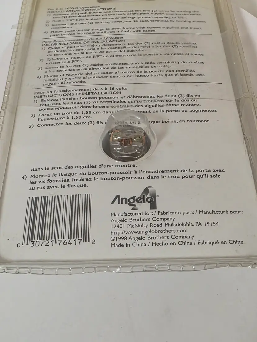 The Angelo Artworks Brass Push Button Door Bell is a stylish and unique addition to any home, featuring a pineapple, the Welcome symbol, in brass with a push button. This doorbell adds a touch of elegance and charm to the entryway, and is easily operated with a simple push. Crafted from high-quality brass, this door bell is durable and sure to withstand the daily wear and tear of use. Perfect for adding a personal touch to your home's façade, this door bell is a functional and decorative hardware piece. This is new old stock. The packaging is a little beat up, but everything is there.