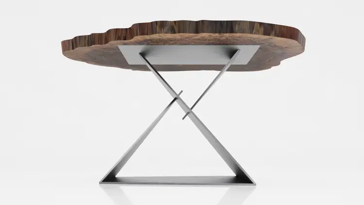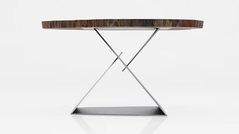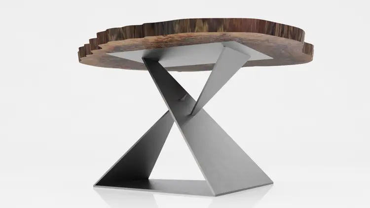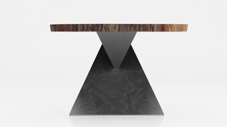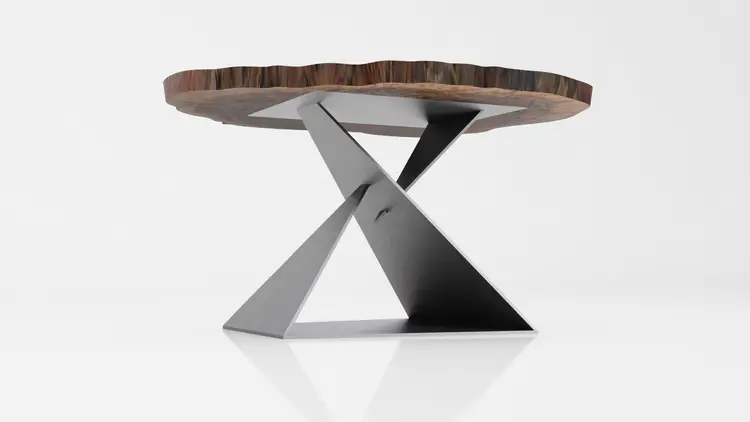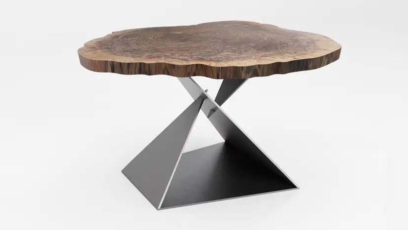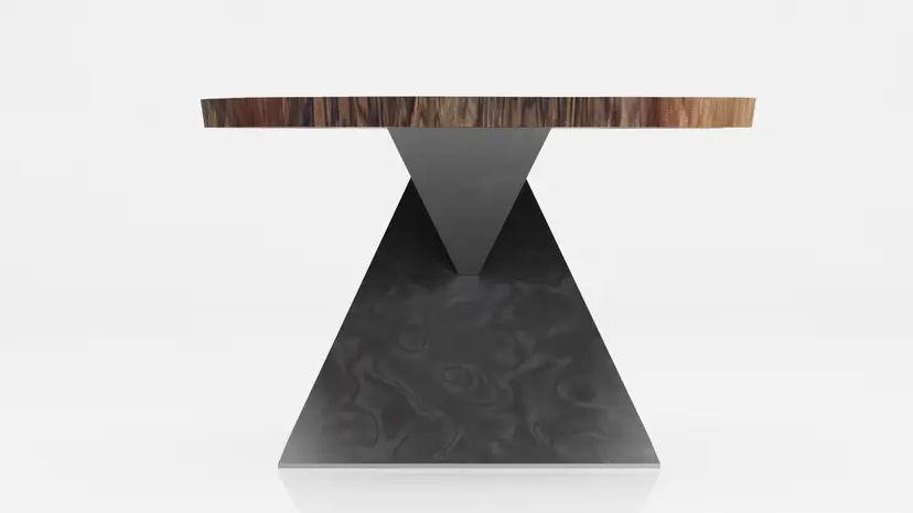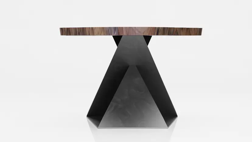 This unique, modern Angles table base design is cut from raw steel on a 5-axis water jet and welded into one solid piece.