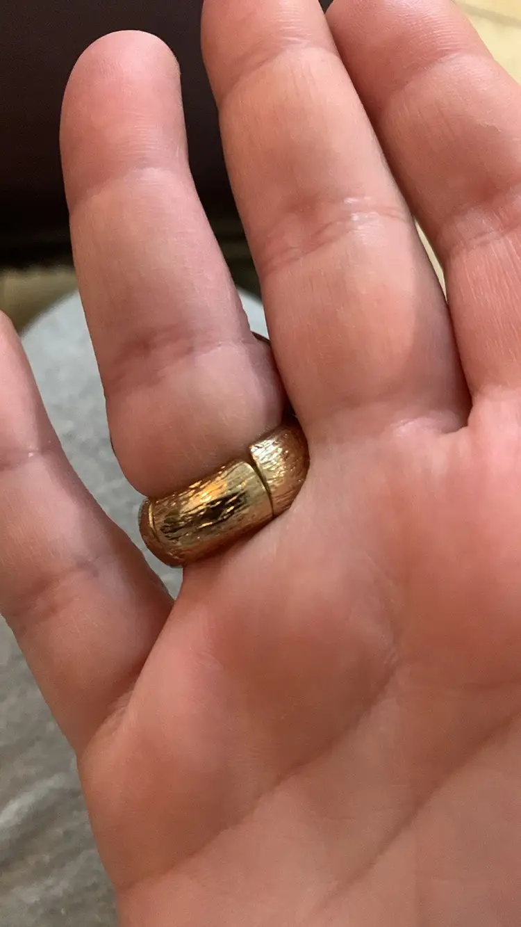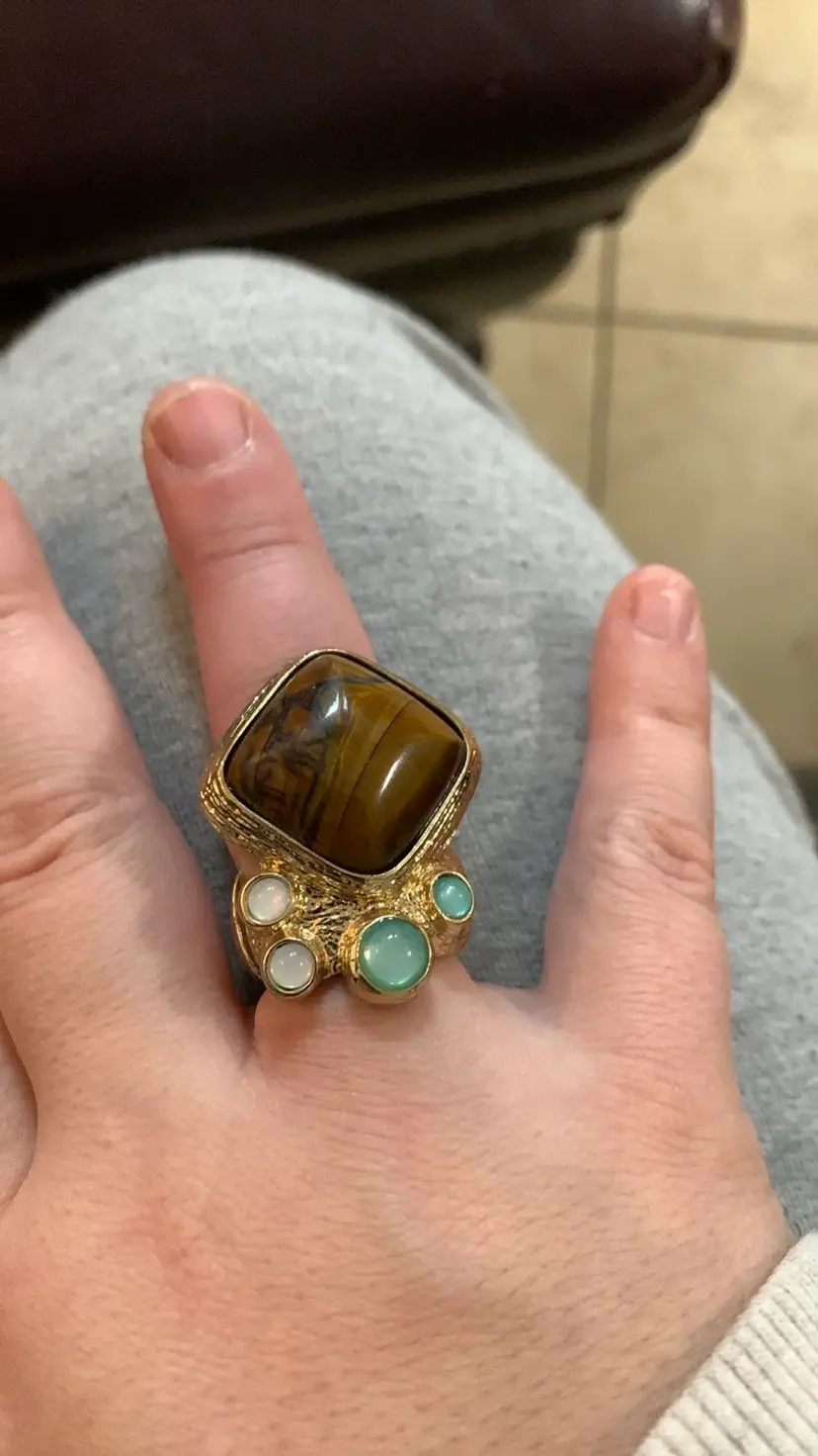 Gold tone ring with a large square tiger eye stone and three smaller green stones. Adjustable band. Probably best for a size 7-7.5. Handmade in the USA.