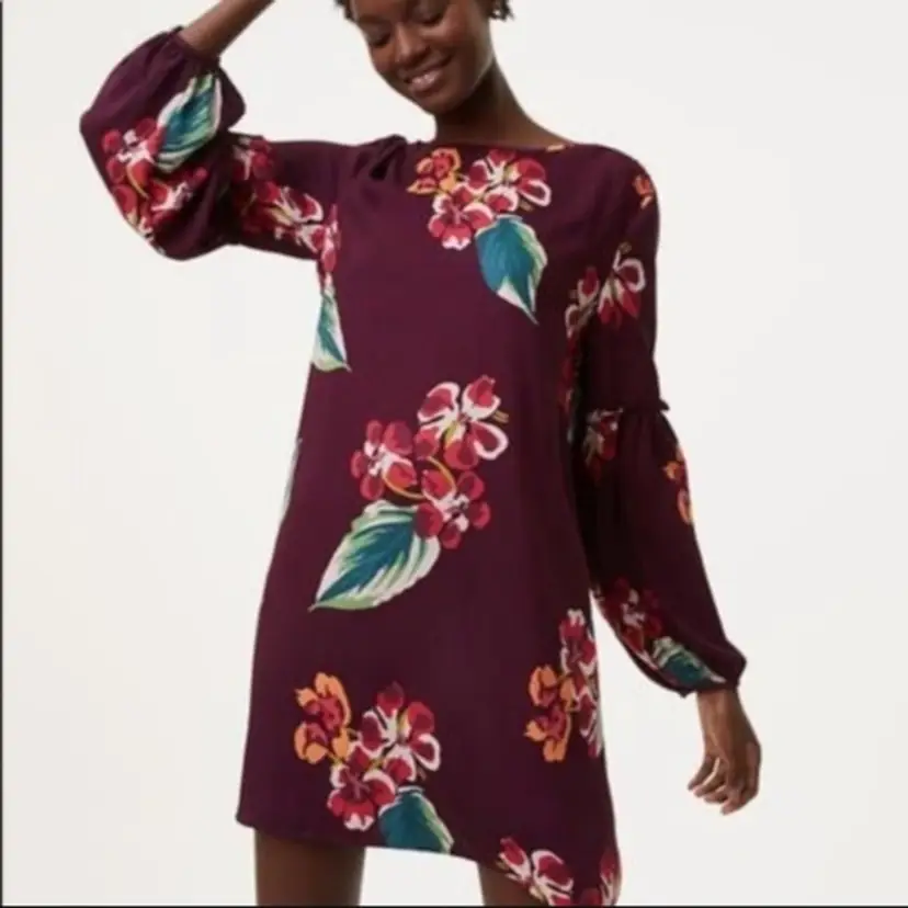 Ann Taylor LOFT Petite Women’s Balloon Sleeve Floral Shift dress in plum sz XSP Beautiful vibrant floral pattern. Print is called Autumn luau. Flowy loose fit, Keyhole back closure. Polyester. Great for year round wear. Shift dress High neckline, Button back closure. Billowy sleeves MSRP: $89.50