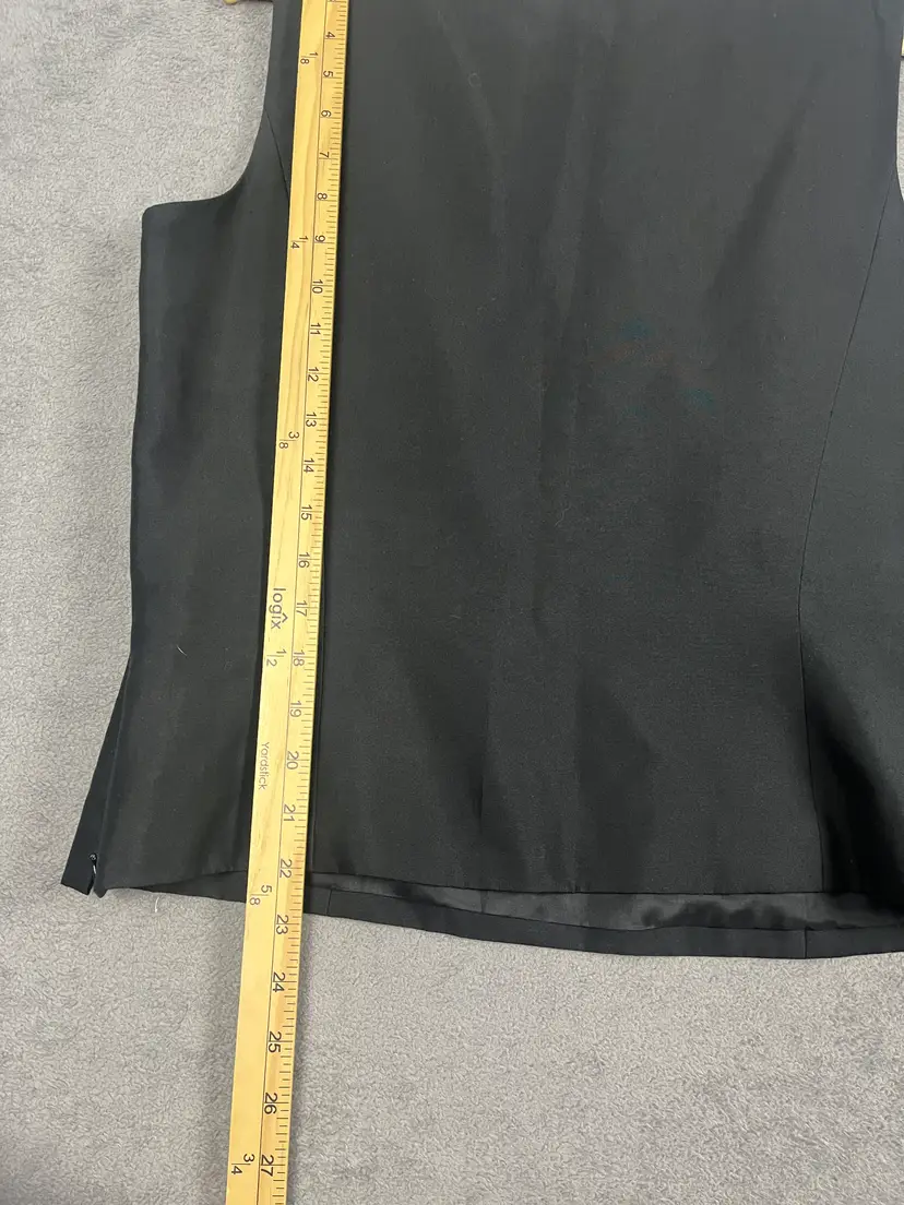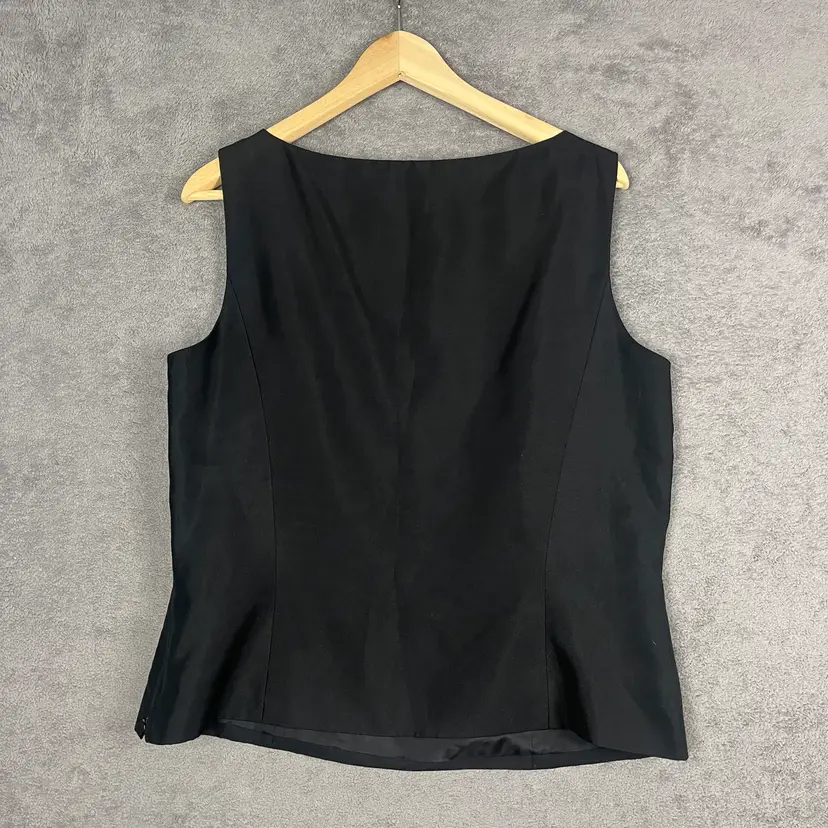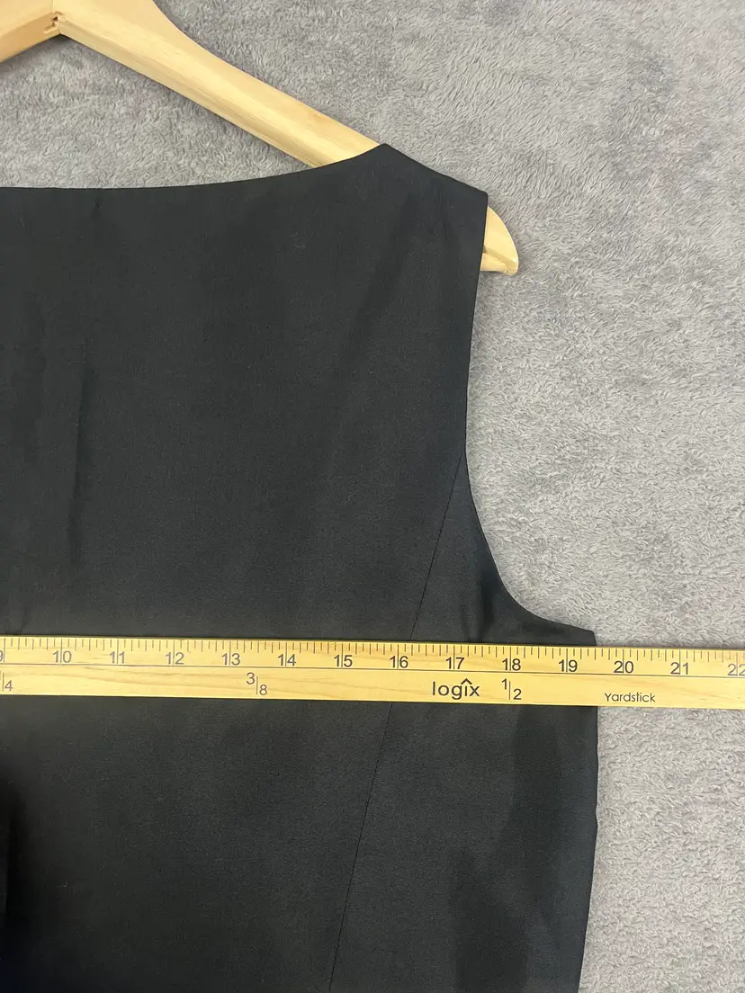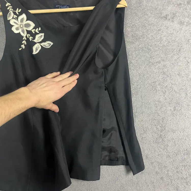Fabric: 100% silk shell with smooth acetate lining for a refined drape and comfortable wear Design: Sleeveless cut, scoop neckline, tonal floral embroidery, and tailored seams Feel: Lightweight, fluid, and elegant with a subtle sheen Condition: No holes, stains, or visible flaws noted See pictures for measurements