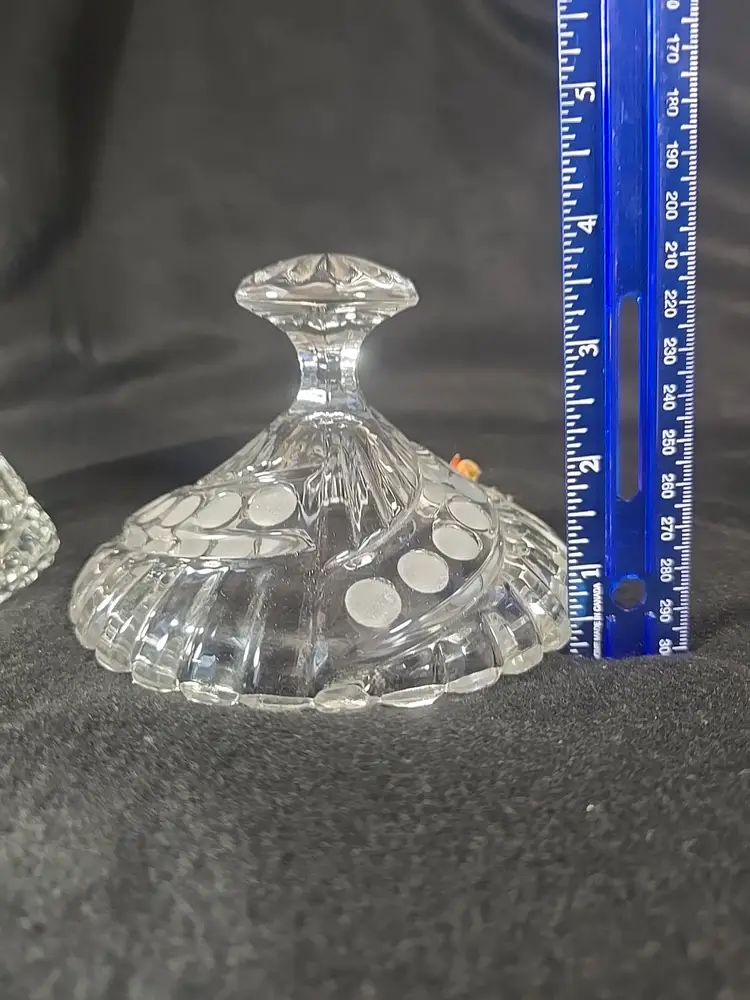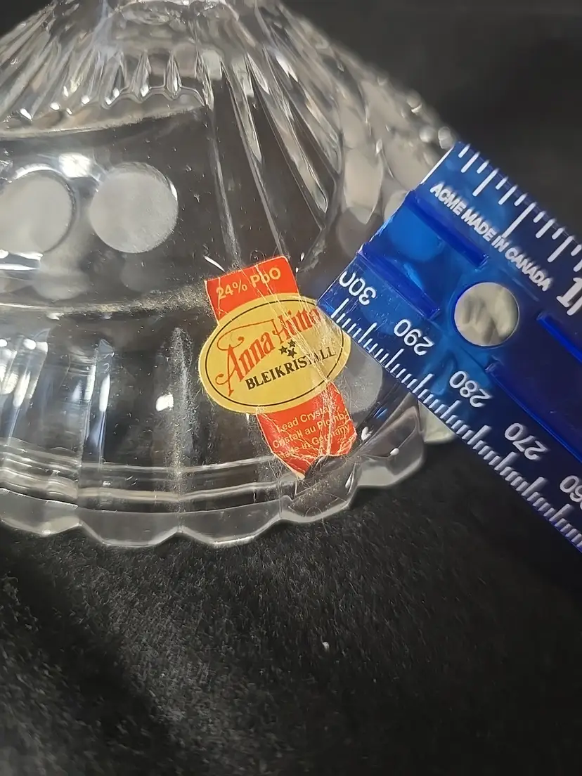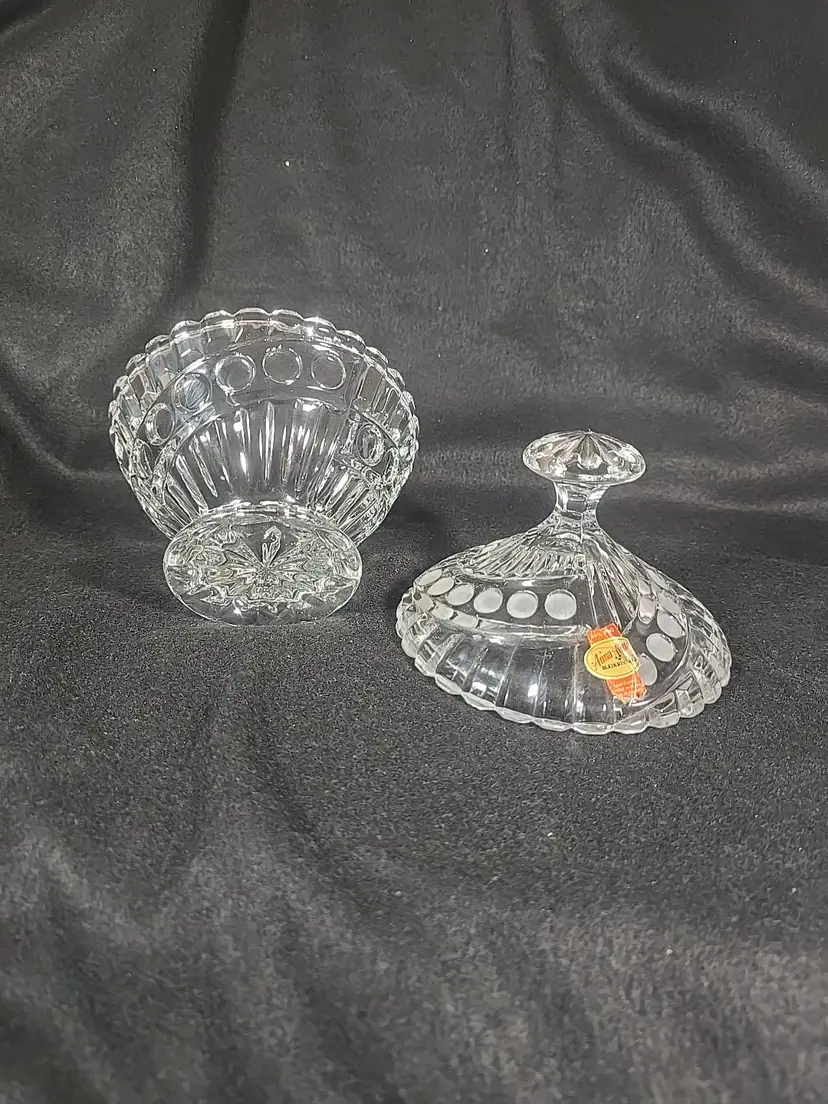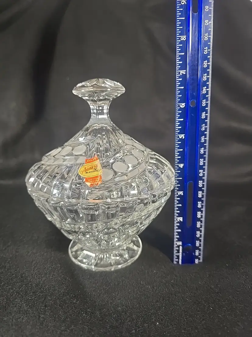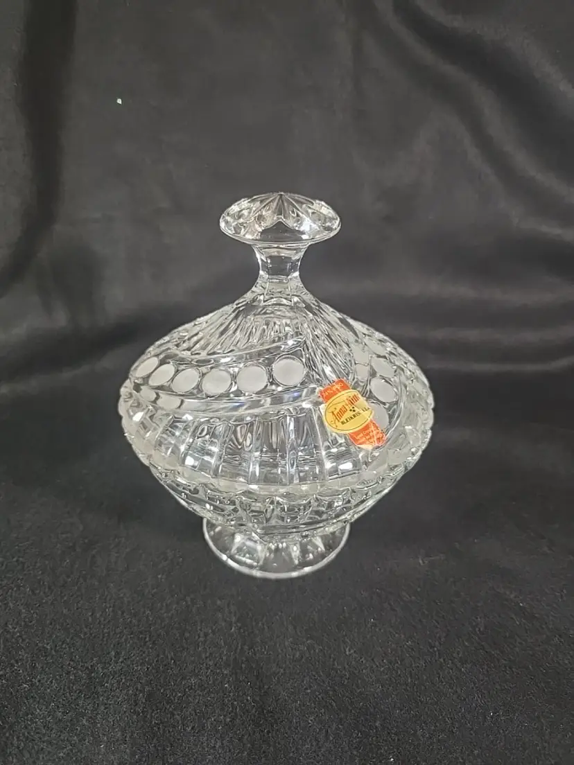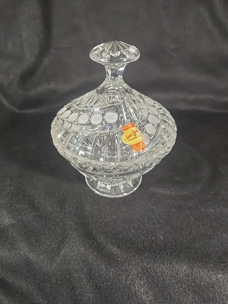 Elegant vintage Anna Hütte Bleikristall lidded candy dish made in Germany from 24% lead crystal. Features a classic footed base with a pressed dot and ribbed pattern and a matching domed lid with faceted finial. Perfect for candy, trinkets, or vanity decor. Measures approximately 6.5" tall with lid and 4.5" wide at the bowl. Original foil label intact.