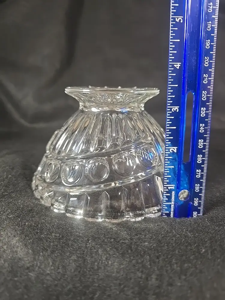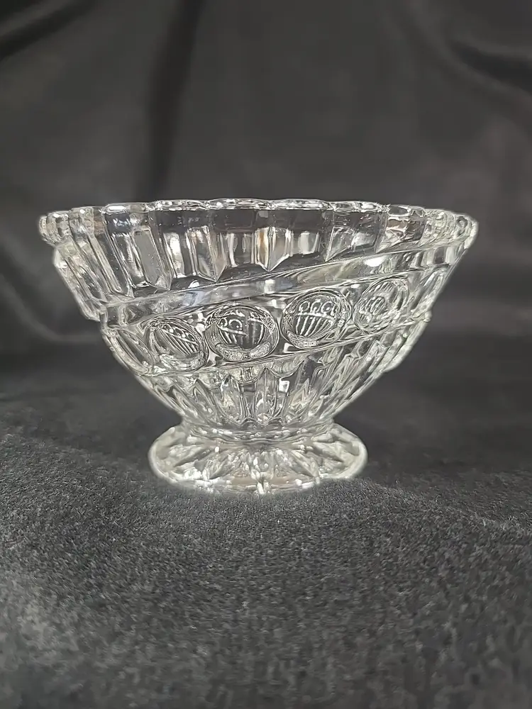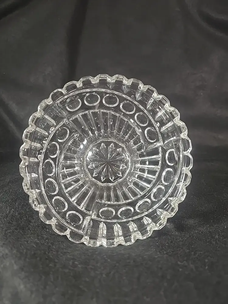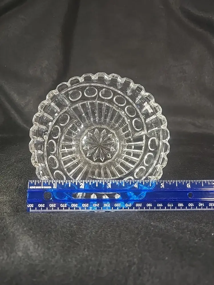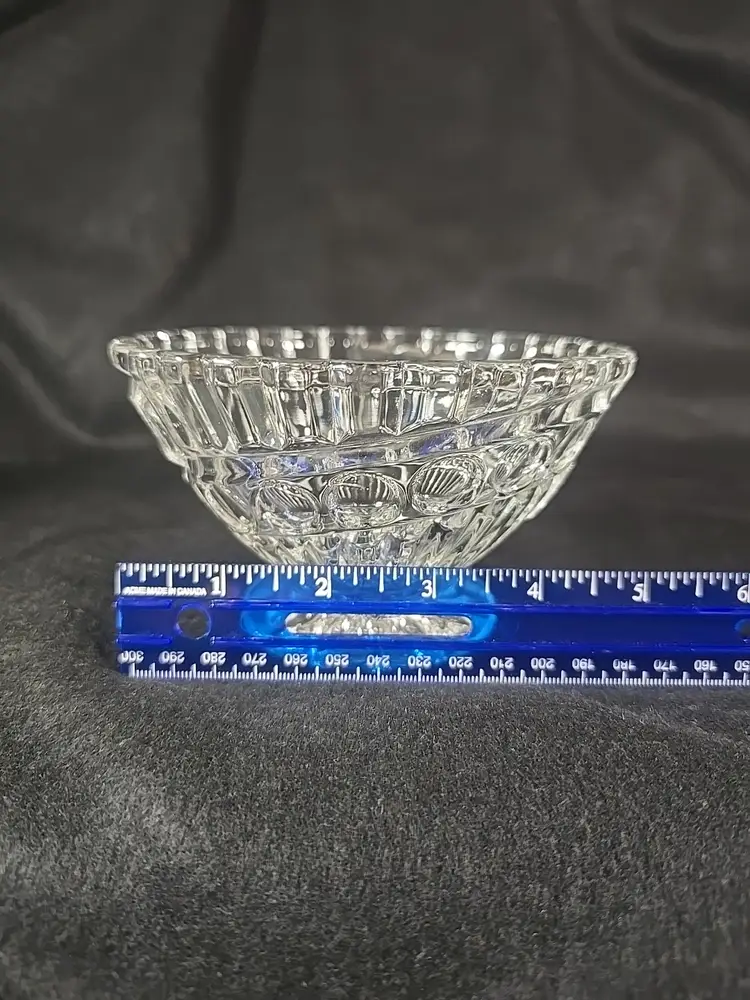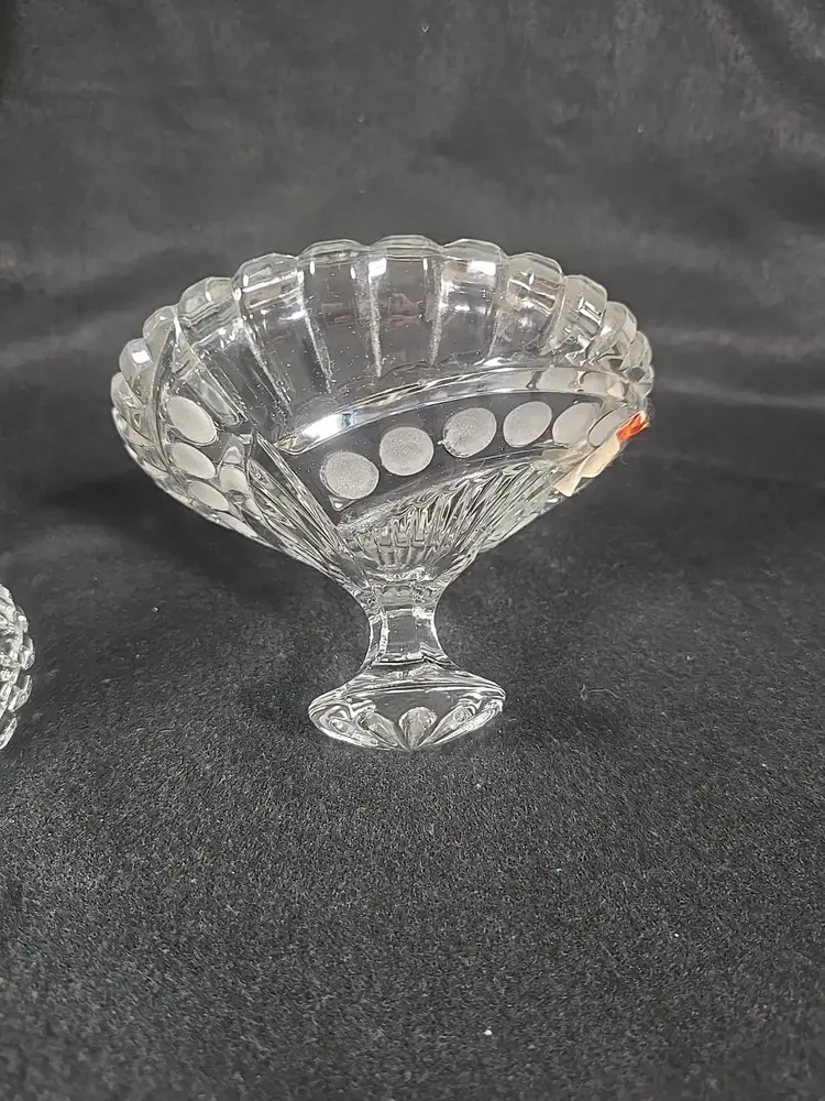 Elegant vintage Anna Hütte Bleikristall lidded candy dish made in Germany from 24% lead crystal. Features a classic footed base with a pressed dot and ribbed pattern and a matching domed lid with faceted finial. Perfect for candy, trinkets, or vanity decor. Measures approximately 6.5" tall with lid and 4.5" wide at the bowl. Original foil label intact.
