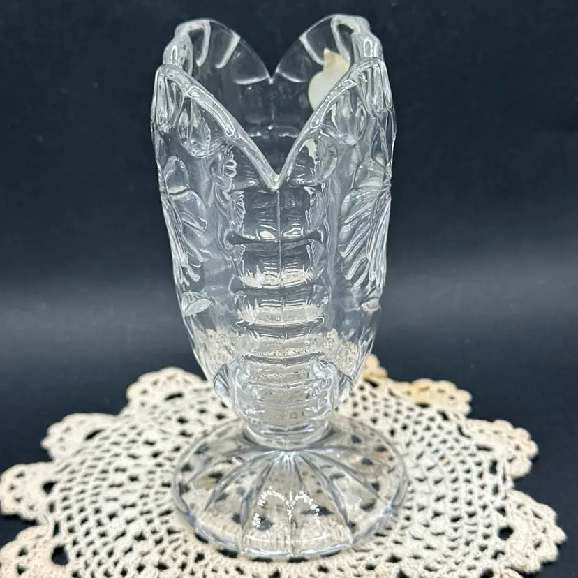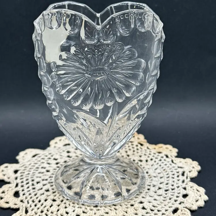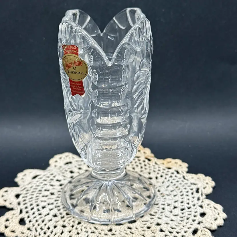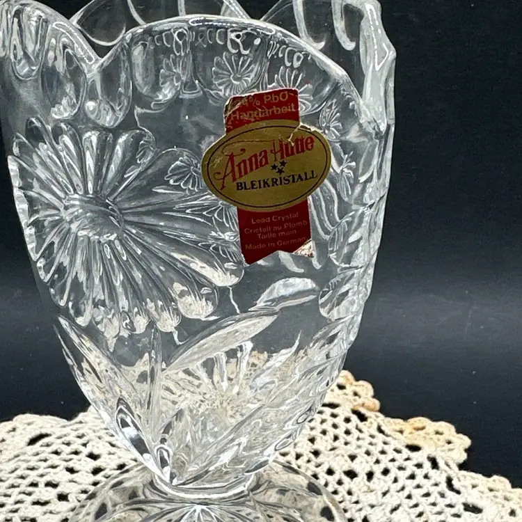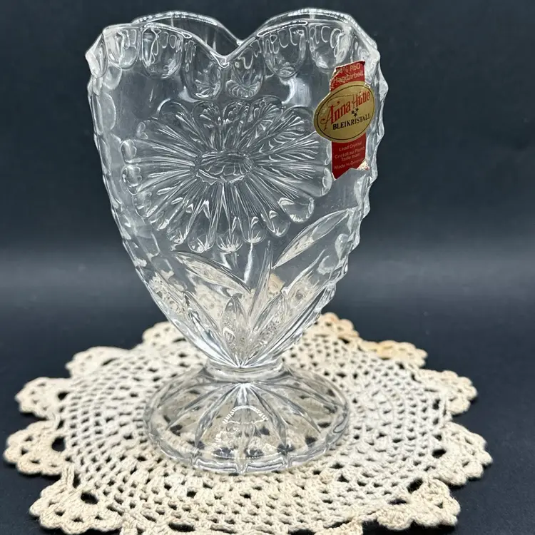 The Anna Hutte Bleikristall Heart Shaped 24% Lead Crystal Etched 5" Flower Vase is a stunning piece of decorative pottery and glassware, originating from Germany. Featuring a beautiful heart-shaped design with an etched daisy pattern, this clear crystal vase stands at 5 inches tall and has a glossy finish. Perfect for displaying flowers or as a standalone decorative piece, this Anna Hutte vase combines elegance and craftsmanship to enhance any space.