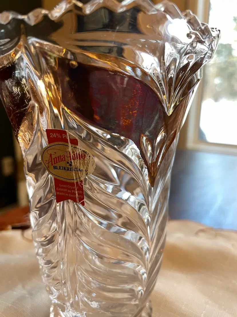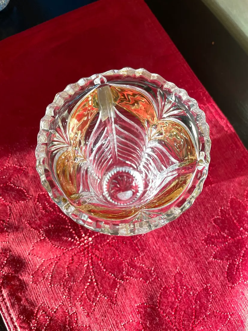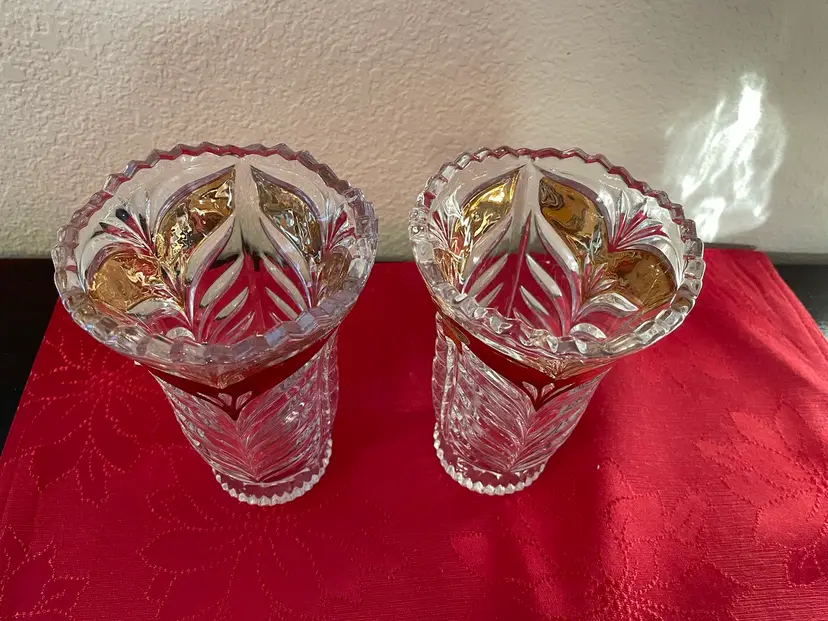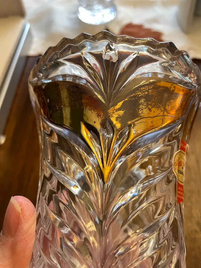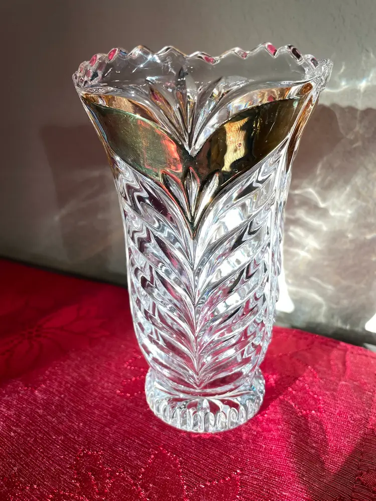 Beautiful 6 1/4"H lead crystal. No chips or cracks. The gold is tarnished and missing in a couple spots .