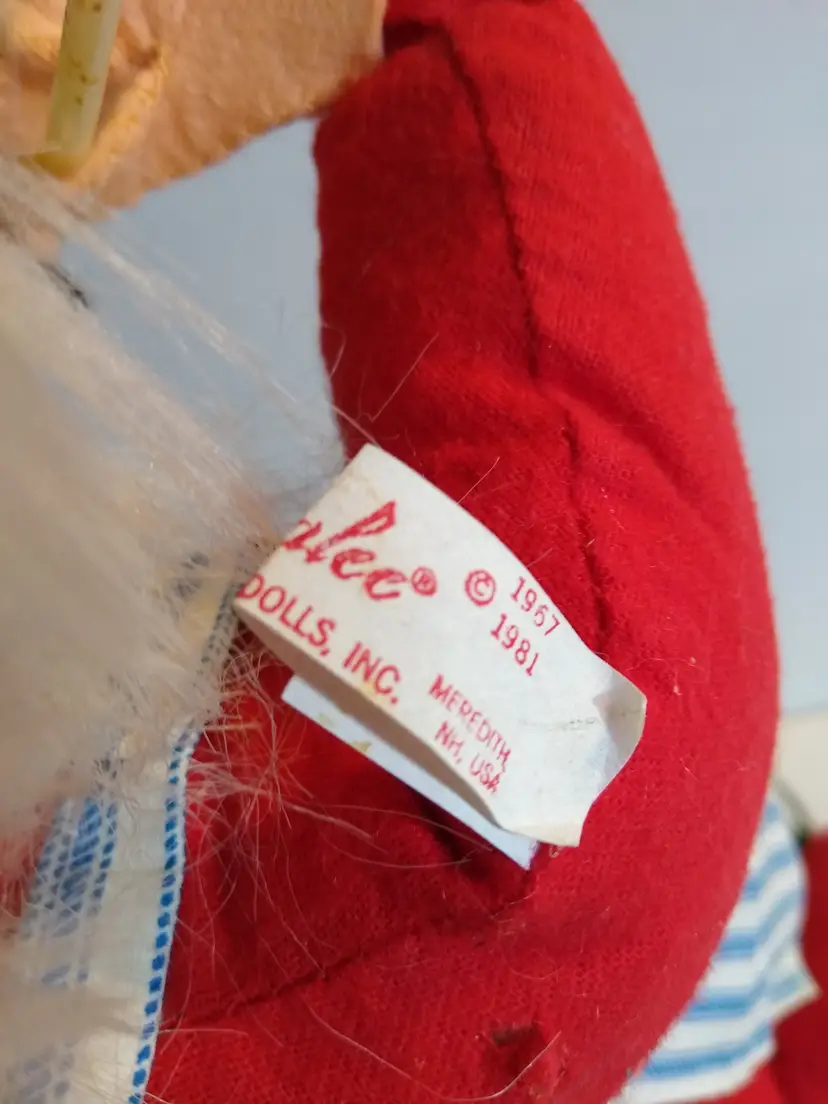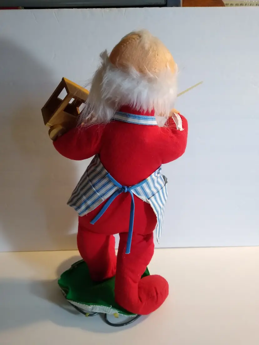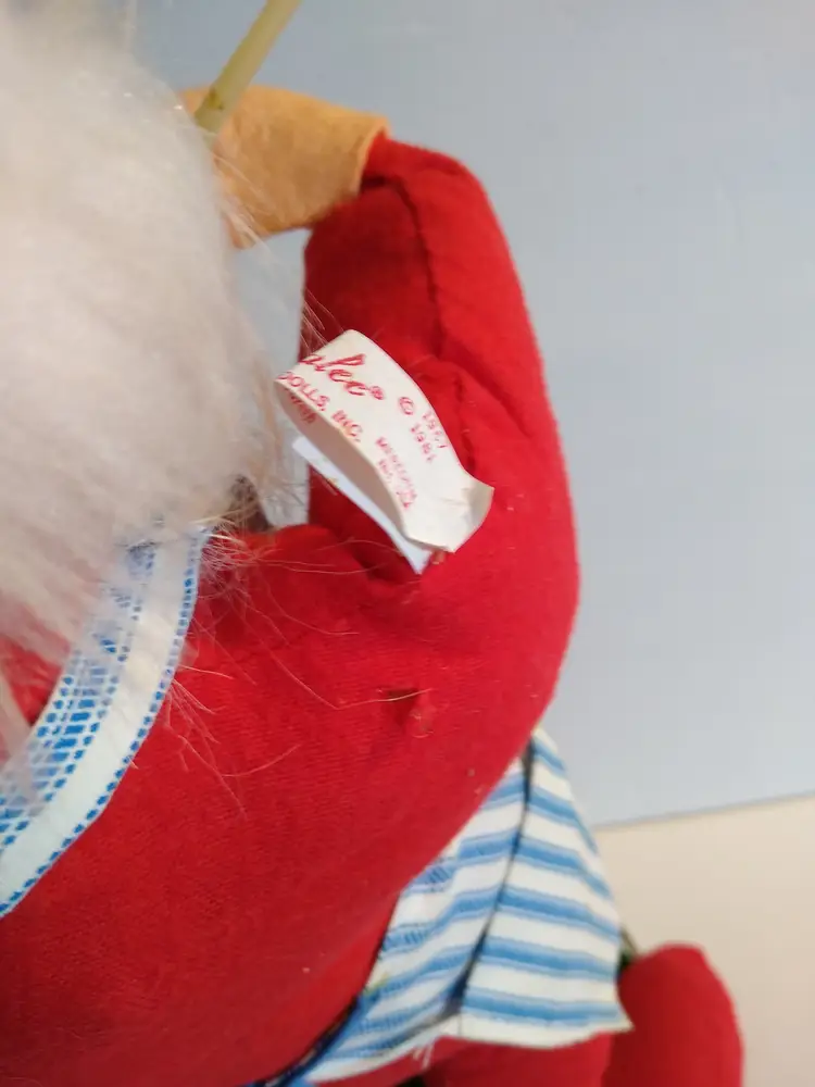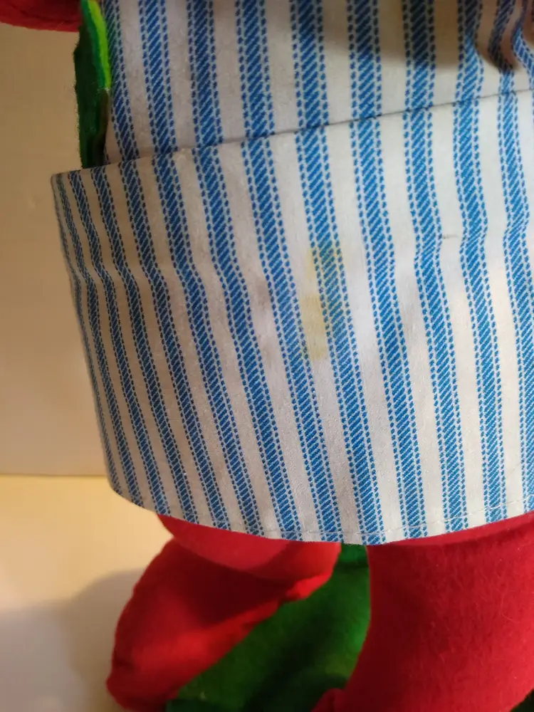 Used condition. Original dated 1981. Stands on metal round base with green felt. 18" tall. Has stains to front of apron, small tears, some general age wear. With cloth tag. Base is a bit out of shape and felt on base is slightly loose. Still displays great.