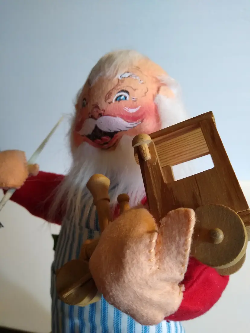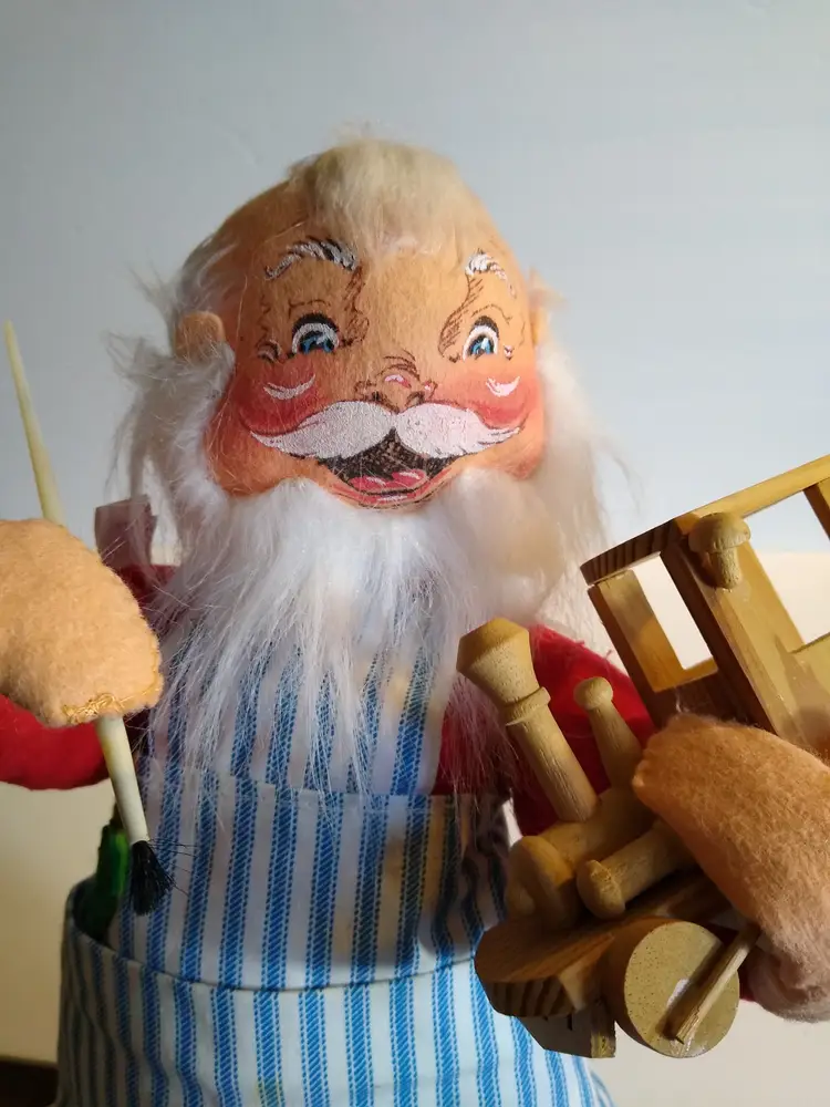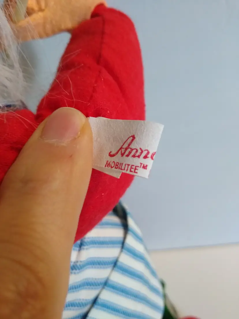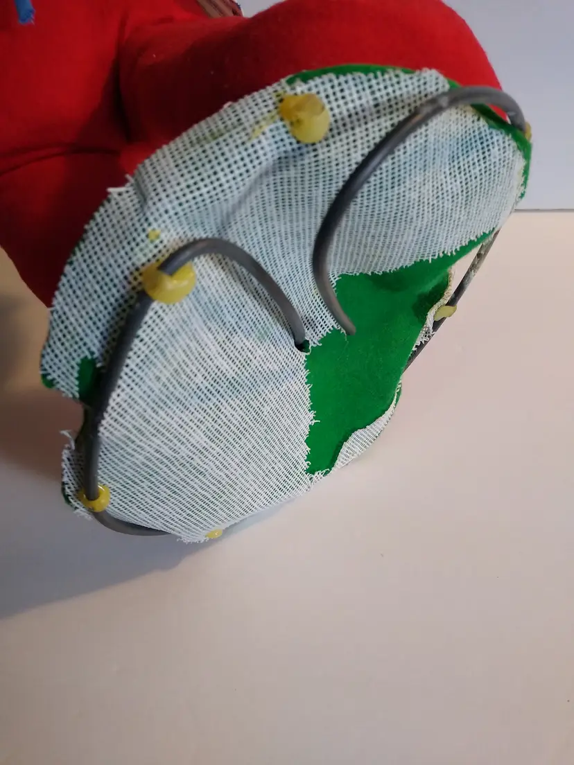 Used condition. Original dated 1981. Stands on metal round base with green felt. 18" tall. Has stains to front of apron, small tears, some general age wear. With cloth tag. Base is a bit out of shape and felt on base is slightly loose. Still displays great.