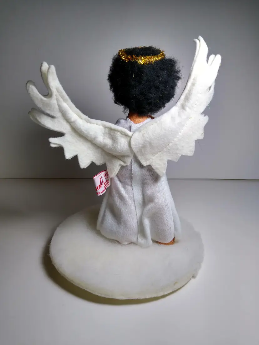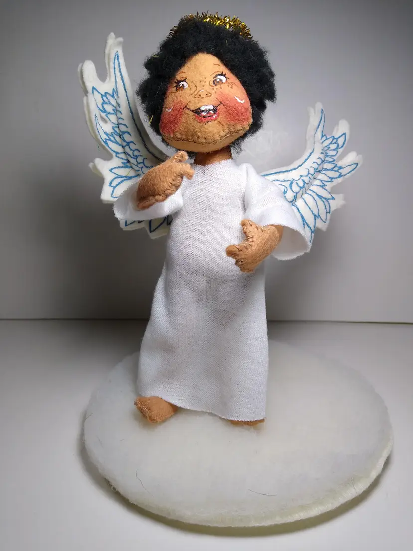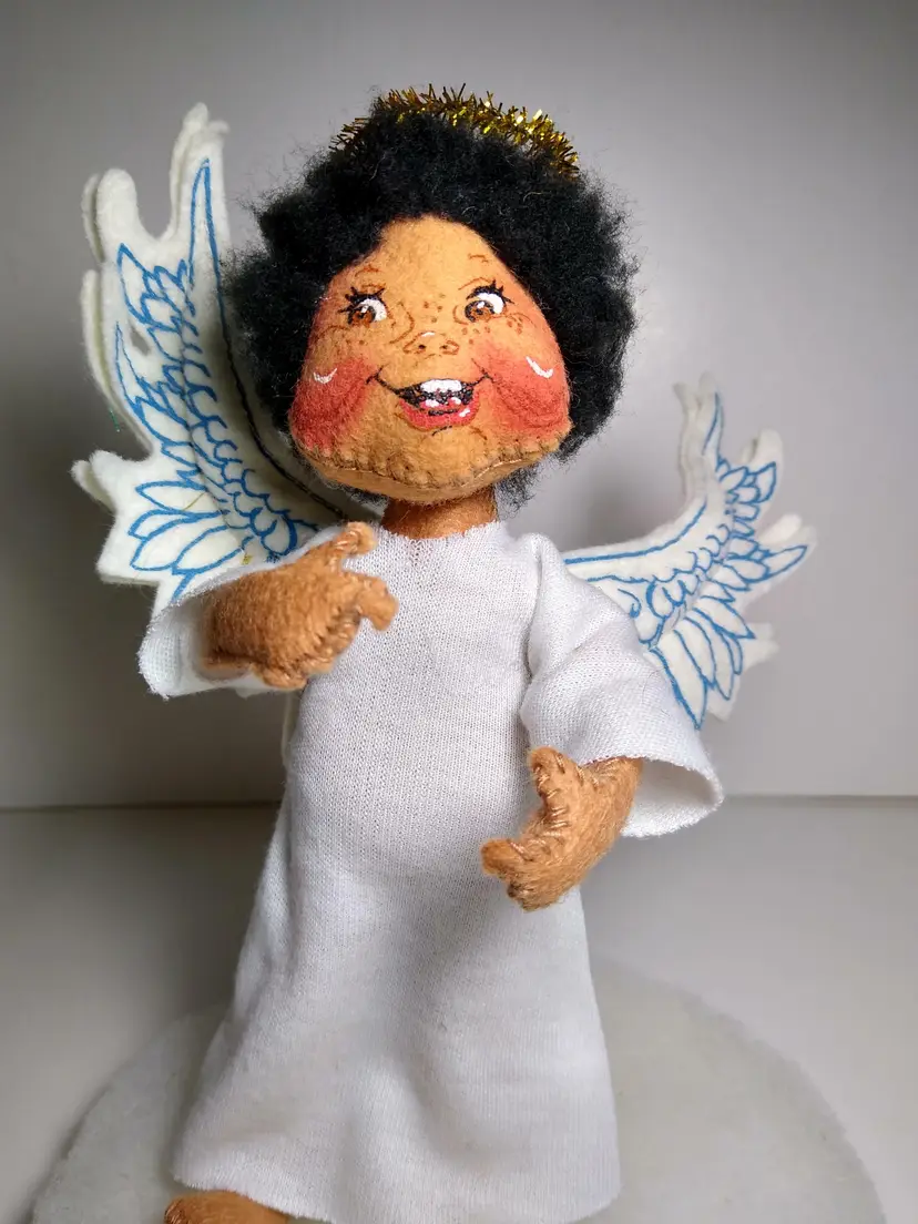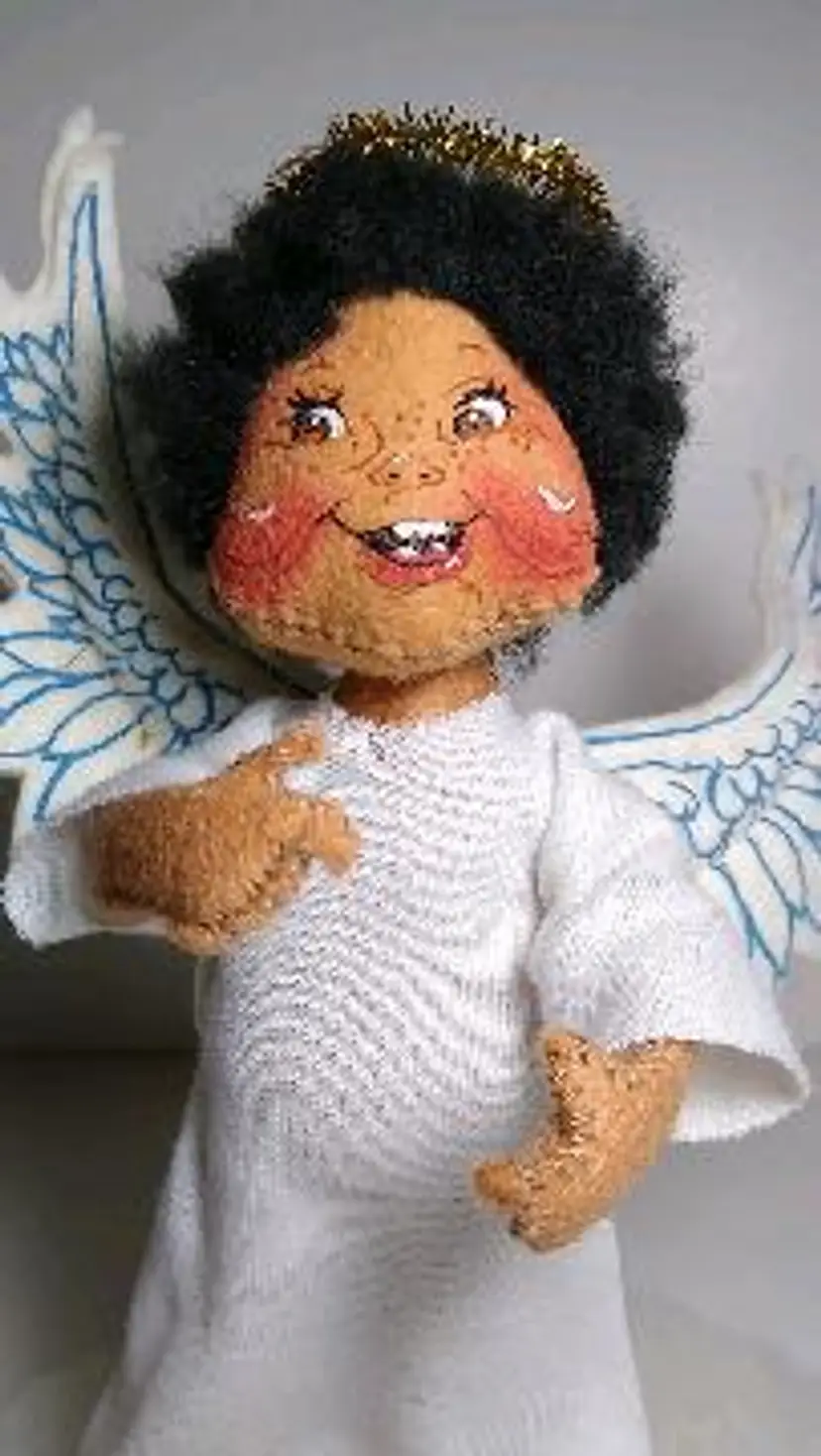 This Annalee doll is a rare find for collectors and enthusiasts alike. With its vintage design and gender-neutral features, this 7.5" rag and cloth doll is a unique addition to any collection. The doll's black hair and dark complexion complement its African American ethnicity, while its blue eyes add a touch of charm to the overall design. This Annalee doll is part of the Annalee Mobilitie Dolls product line and was manufactured in the United States in 1993. It comes with a halo and winged accessories, making it perfect for display or play. This single unit doll is an original and licensed reproduction, making it a valuable addition to any collection.