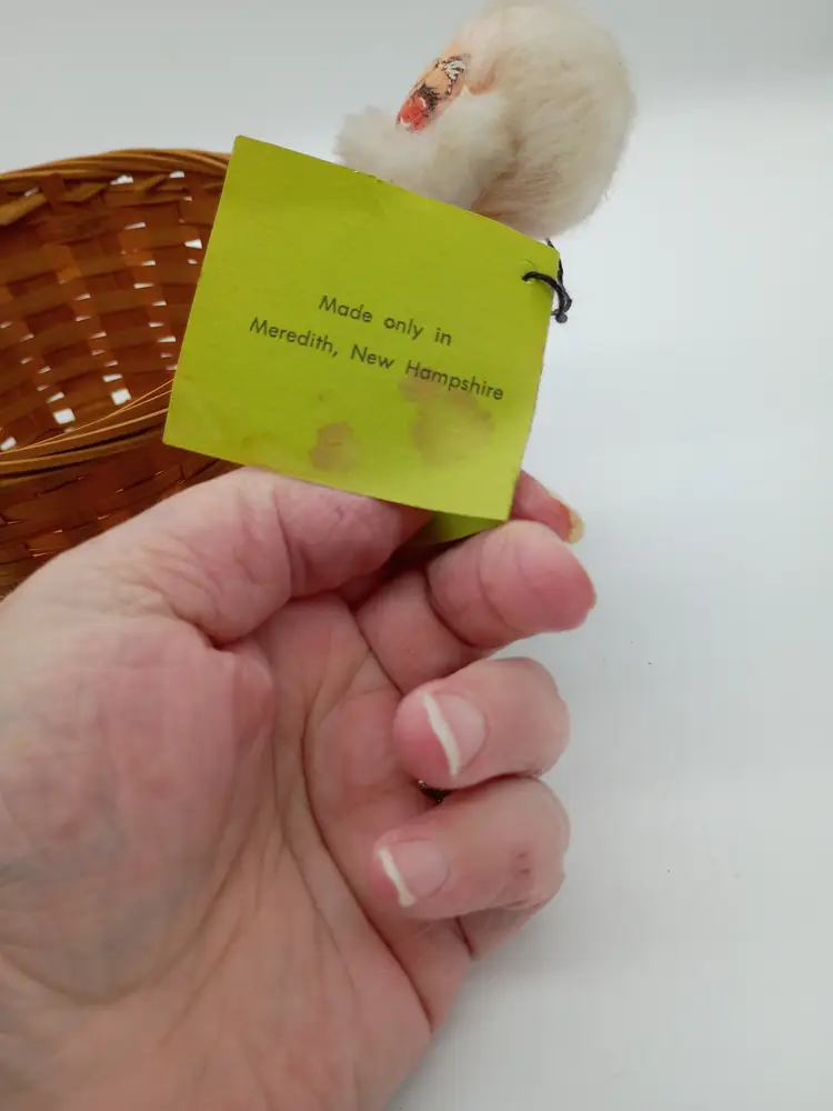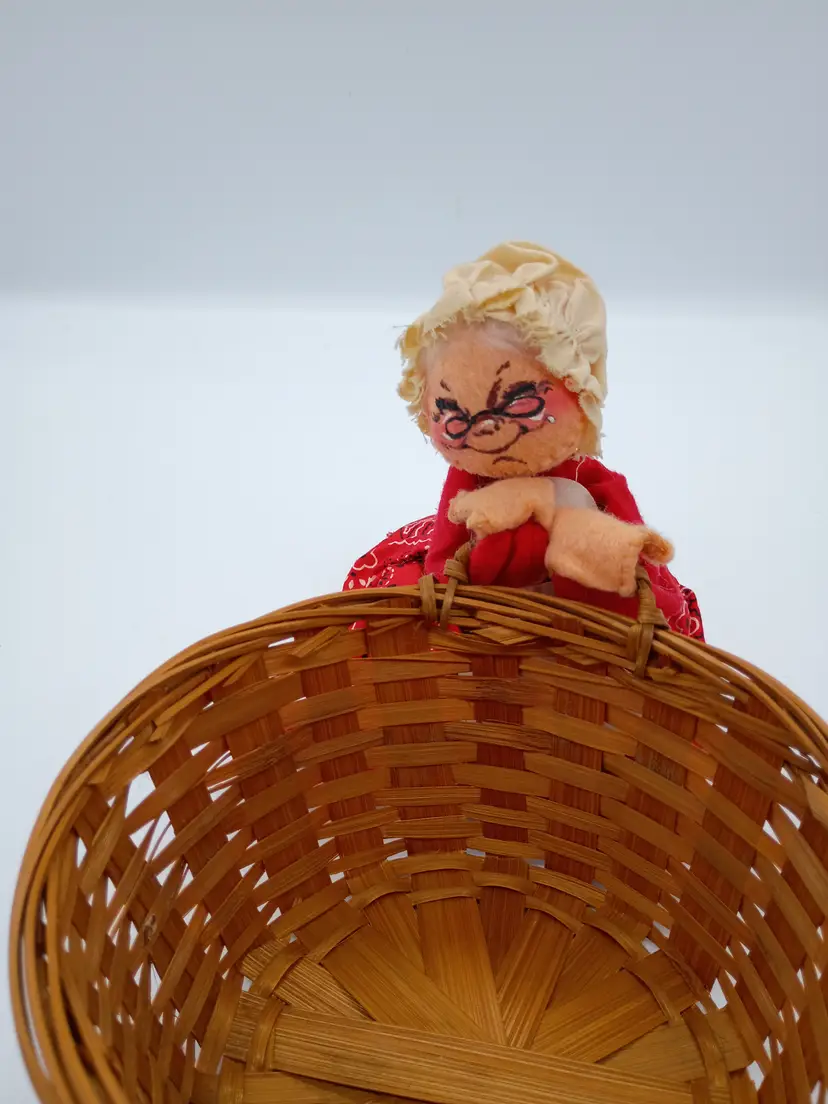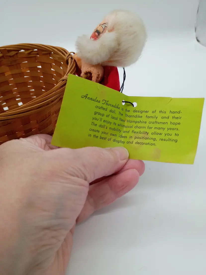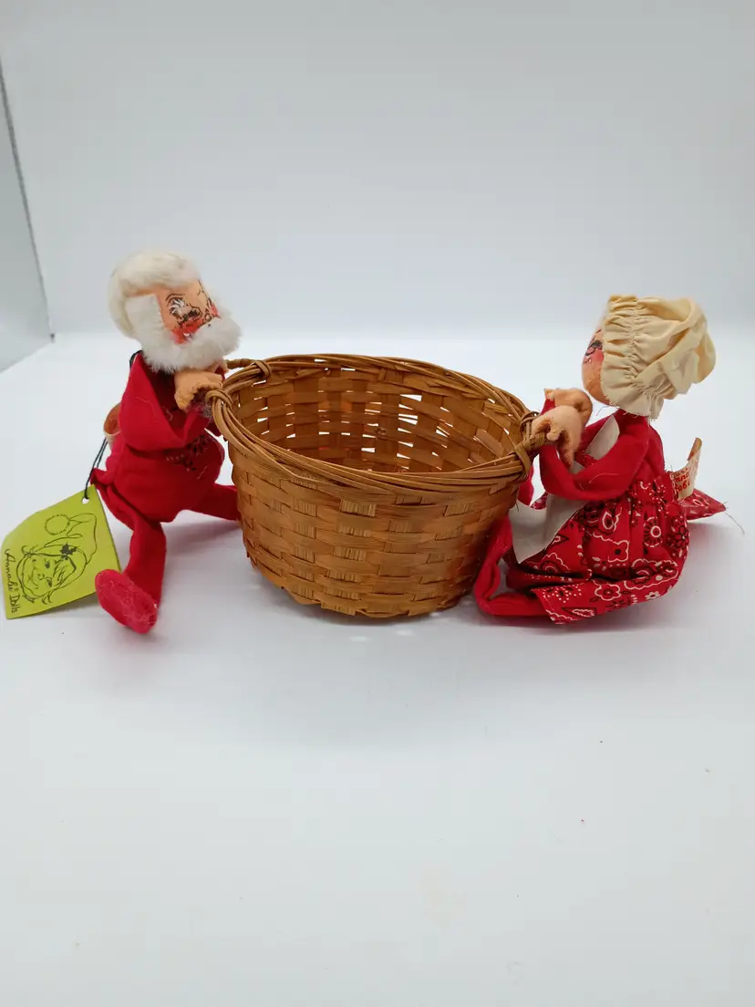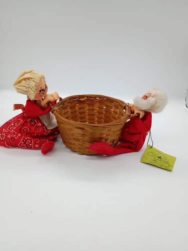 Annalee Christmas 1971 Mr. and Mrs. Santa Holding Wicker Basket Card Holder. This is 10 inches side to side 6 inches to tops of seated dolls head and 6 inches front to back. Great for candy holder or holding holiday cards or trinkets. This is preowned with original hang tags. No rips tears odors holes stains or fraying the basket is intact. Excellent condition for it's age. Ships USPS domestically and UPS/ USPS International Shipping globally