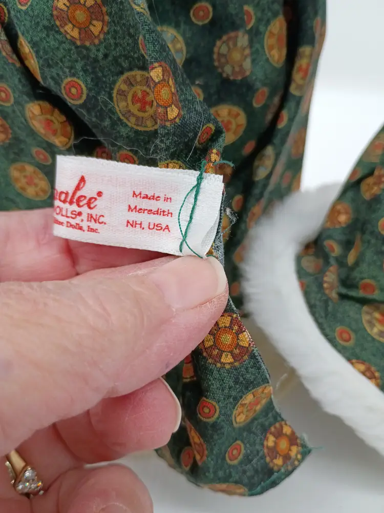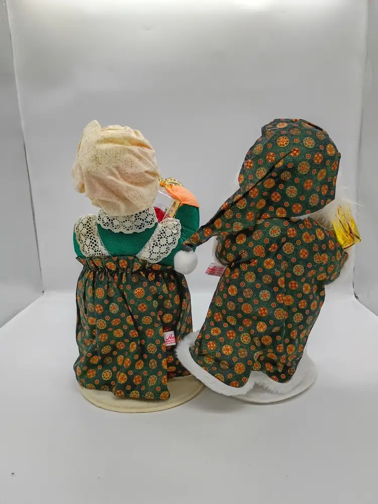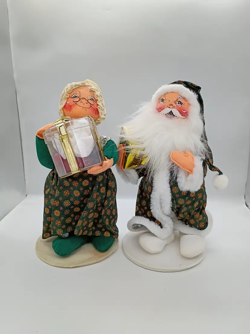 Annalee Christmas 2000 Wrapping Gold Santa & Mrs Claus 12-13 " Dolls #683300. Mrs Claus is slightly shorter. Both are on 8 inch bases.These are preowned they have body tags but no hang tags. No rips tears odors stains fraying or fading. Mrs. Clause has a slightly different base then Santa but with her dress it really does not show. Excellent condition. Ships USPS domestically and UPS/ USPS International Shipping globally
