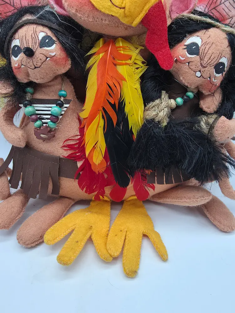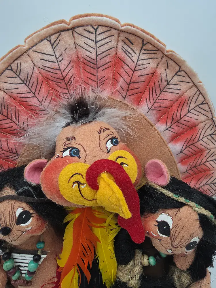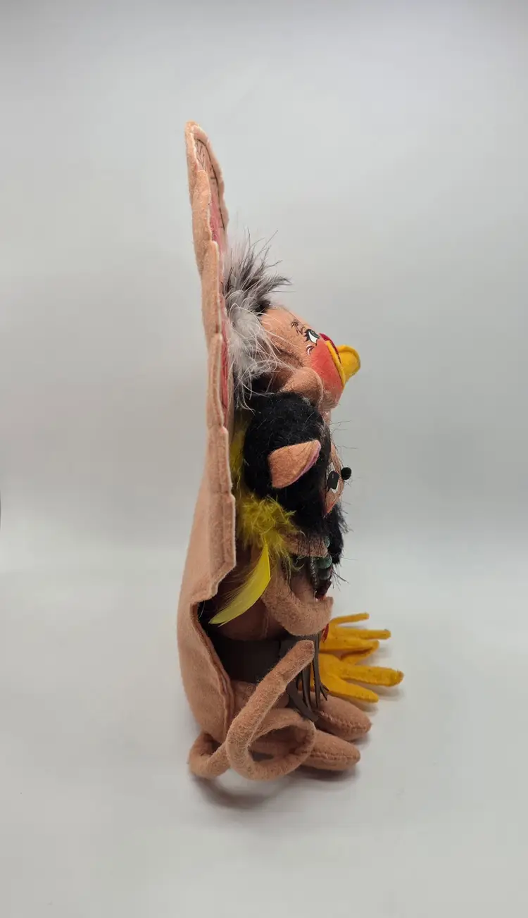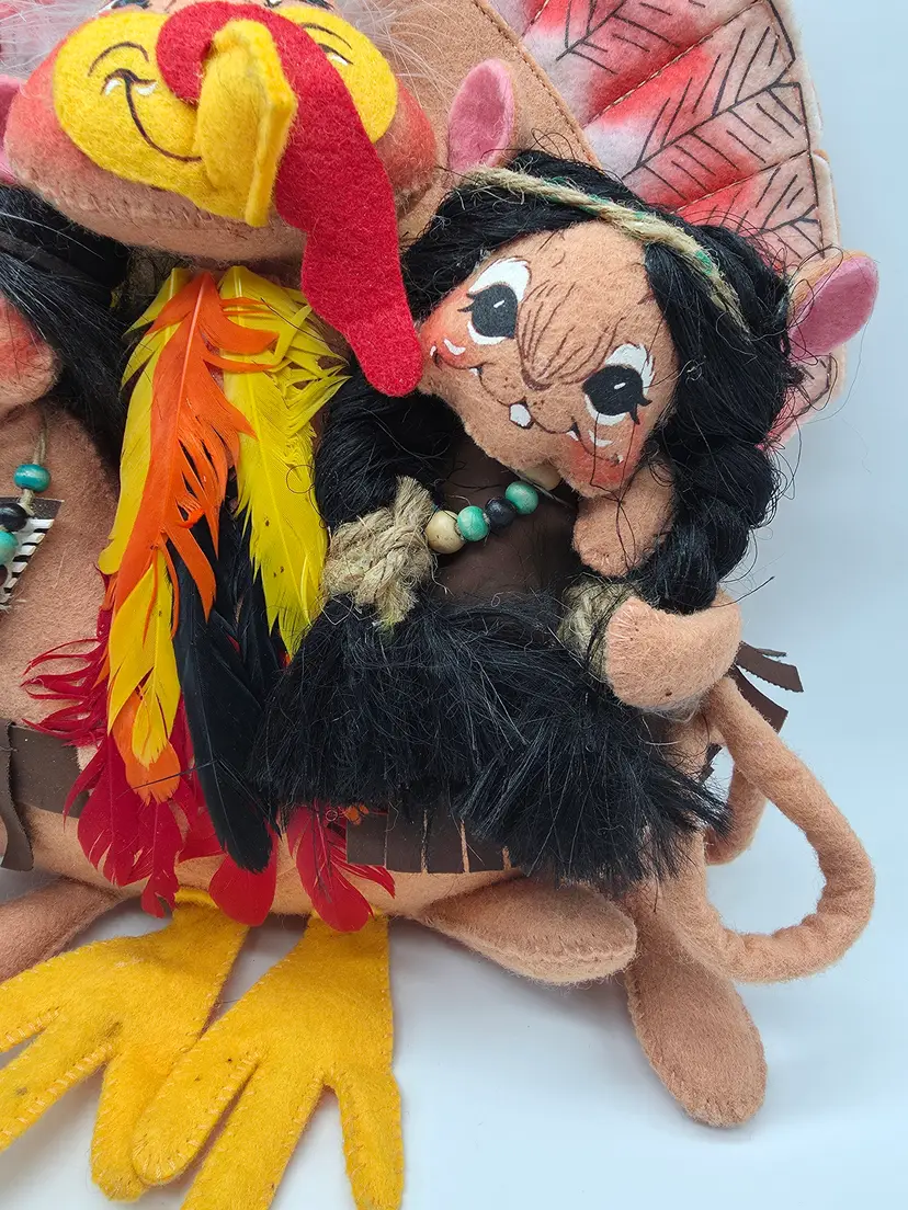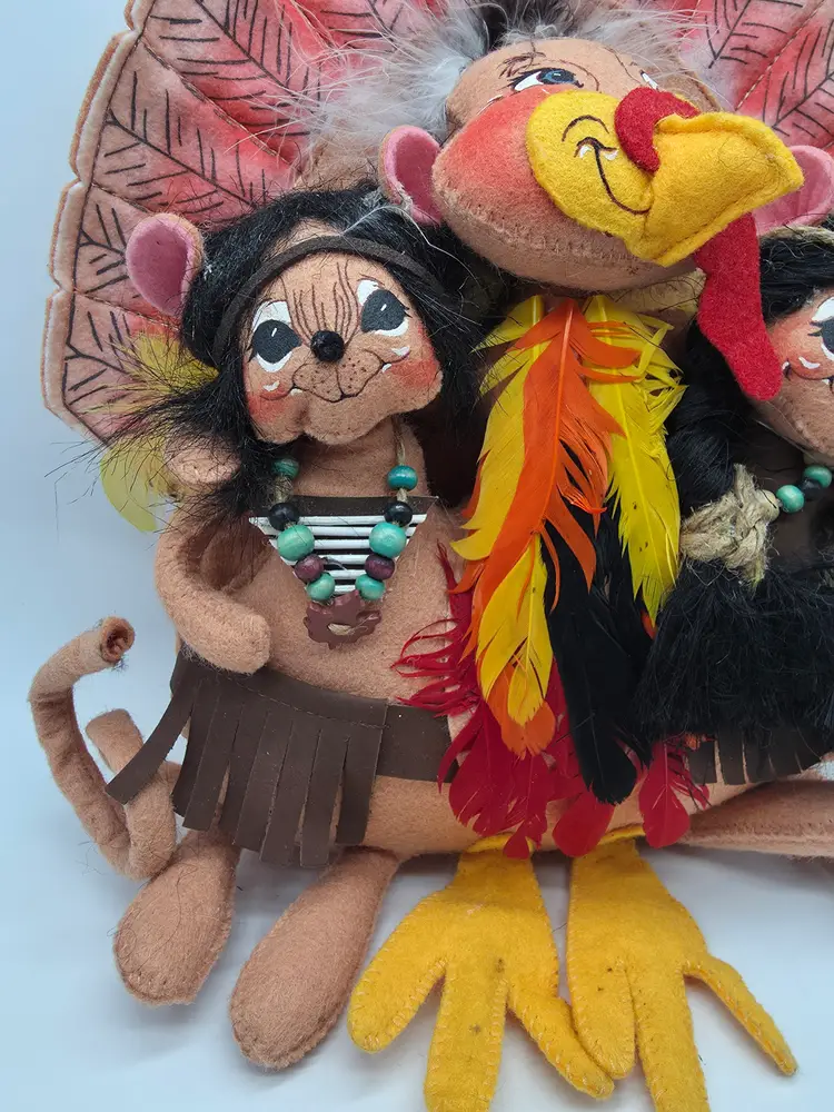 This 2007 Annalee Doll is a Thanksgiving Turkey with Native American mice. It is a hand-painted plush doll made of felt. This collectible is a special addition for collectors or holiday enthusiasts looking for a distinctive Thanksgiving decoration.