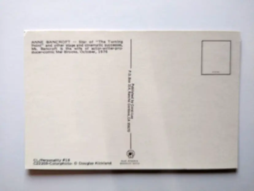 Artist: Anne Bancroft Number of Items in Set: 1 Unit of Sale: Single Unit Character: Actress Featured Person: Anne Bancroft Occasion: Portrait Size: Standard (5.5 x 3.5 in) Signed: No Custom Bundle: No Material: Paper Year Manufactured: 1980 Original/Licensed Reprint: Original Franchise: None Brand/Publisher: Coral Lee Subject: Actress Personalize: No Type: Printed (Lithograph) Era: Photochrome (1939-Now) Theme: Actress, Films, Movie Star, Movies, TV Features: Chrome Time Period Manufactured: 1980-1989 Country/Region of Manufacture: United States Postage Condition: Unposted