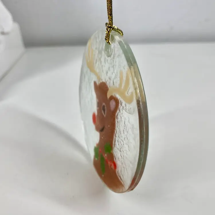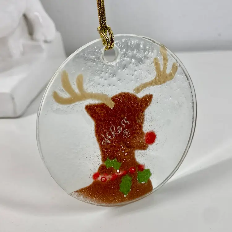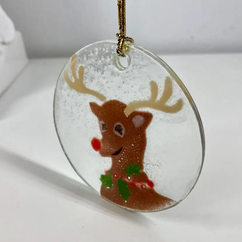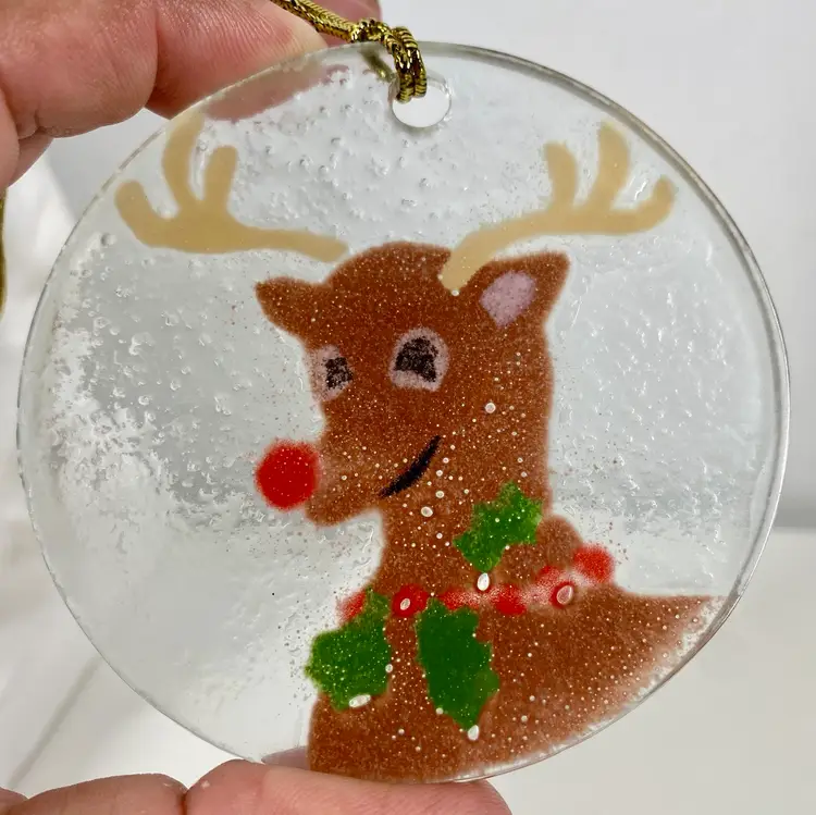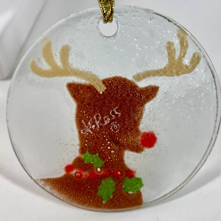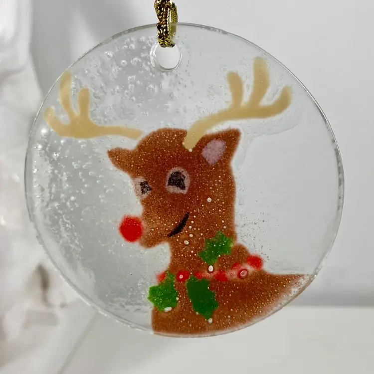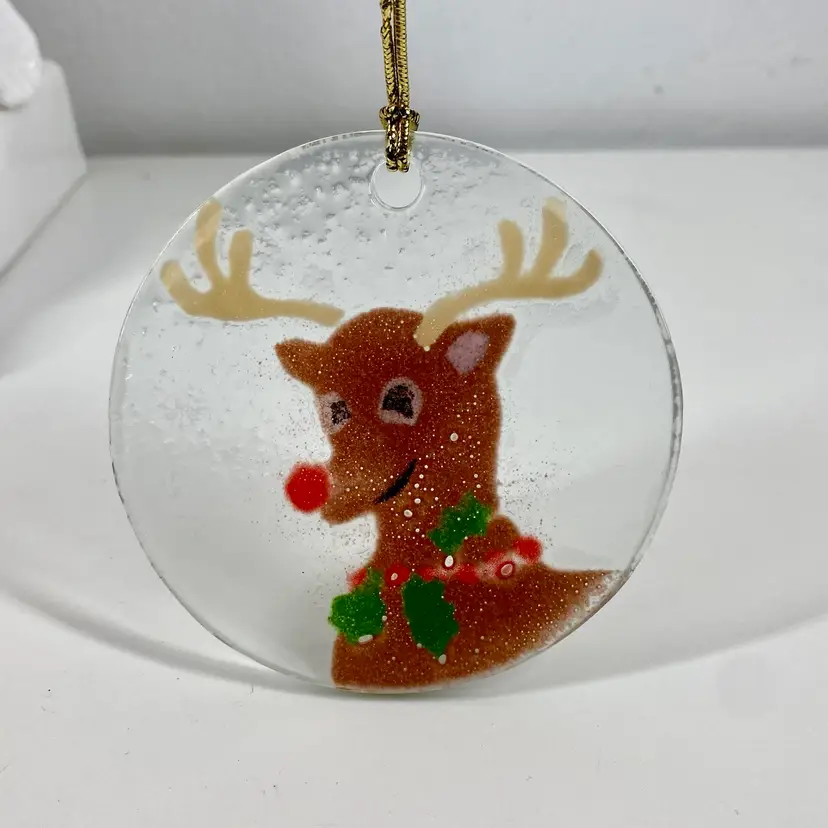 Hi... Celebrate the holiday season with this beautiful fused glass ornament featuring Anne C. Ross's signature design of Rudolph the Red Nose Reindeer. This contemporary piece is a perfect addition to your Christmas tree, measuring 3 1/4 inches in height and width. Crafted with care by hand in the United States, this original artwork is signed by the artist and showcases a unique combination of red, brown, green, on a clear background. Add this one-of-a-kind hand made piece to your collection and bring the magic of Rudolph the Red Nose Reindeer to life this Christmas.