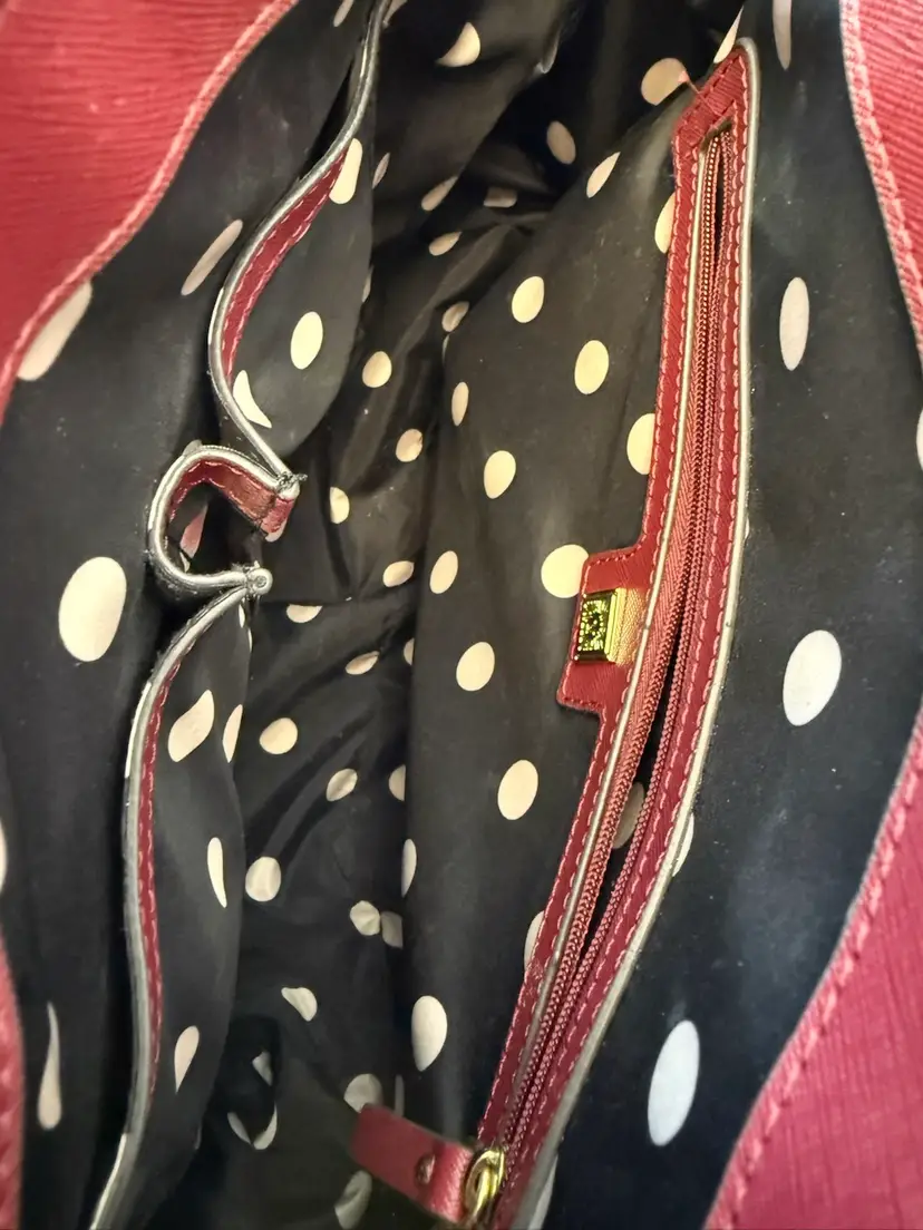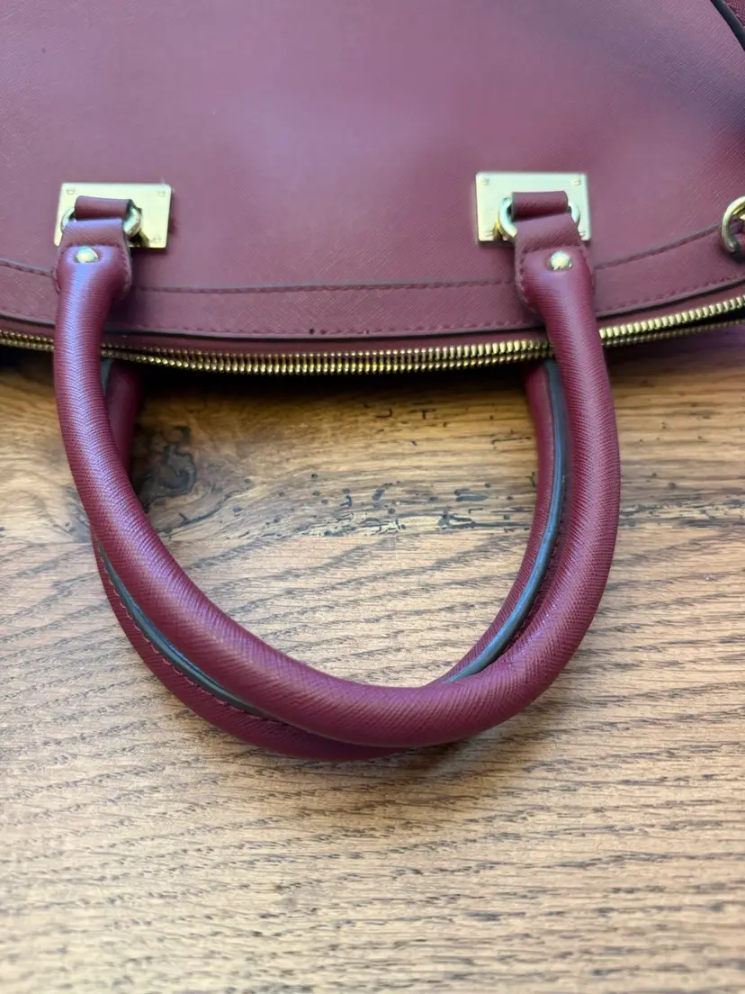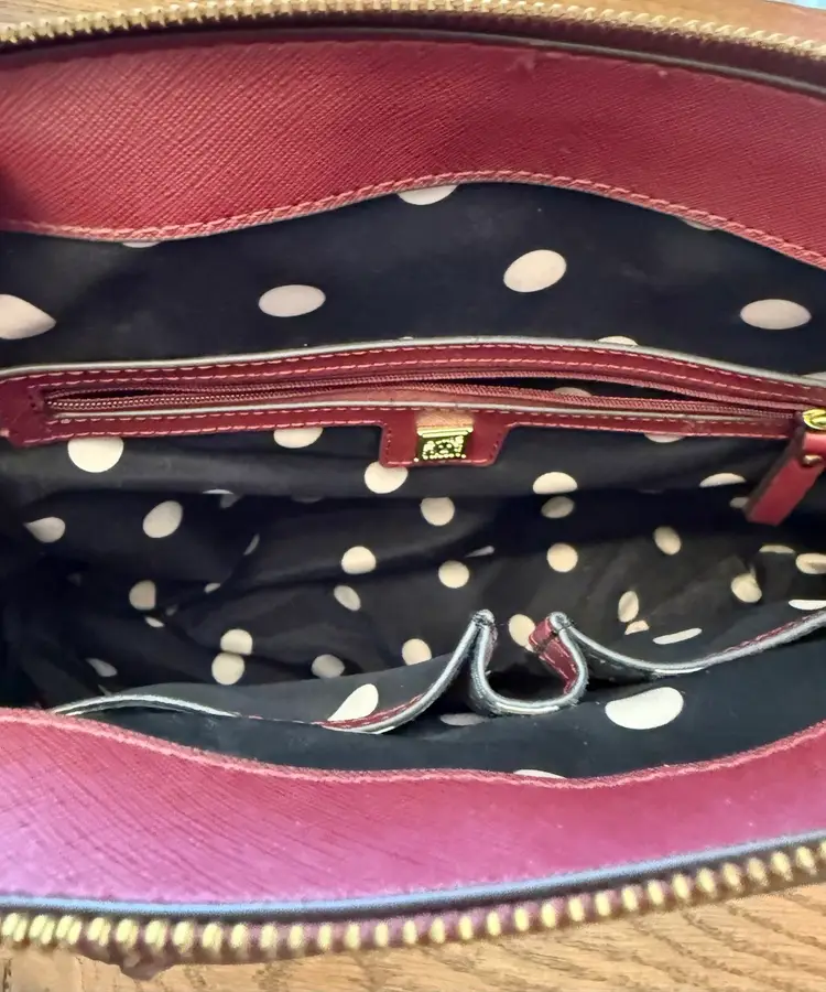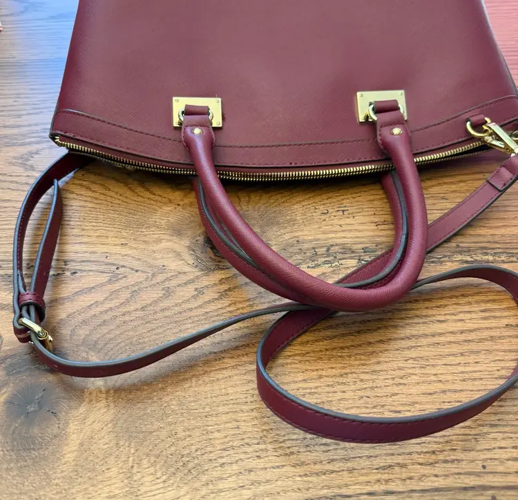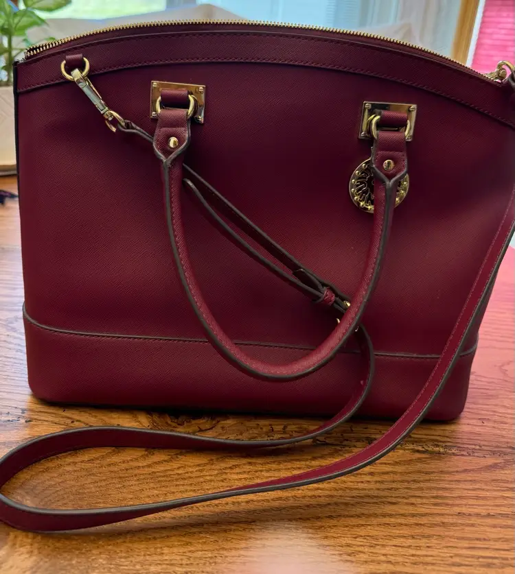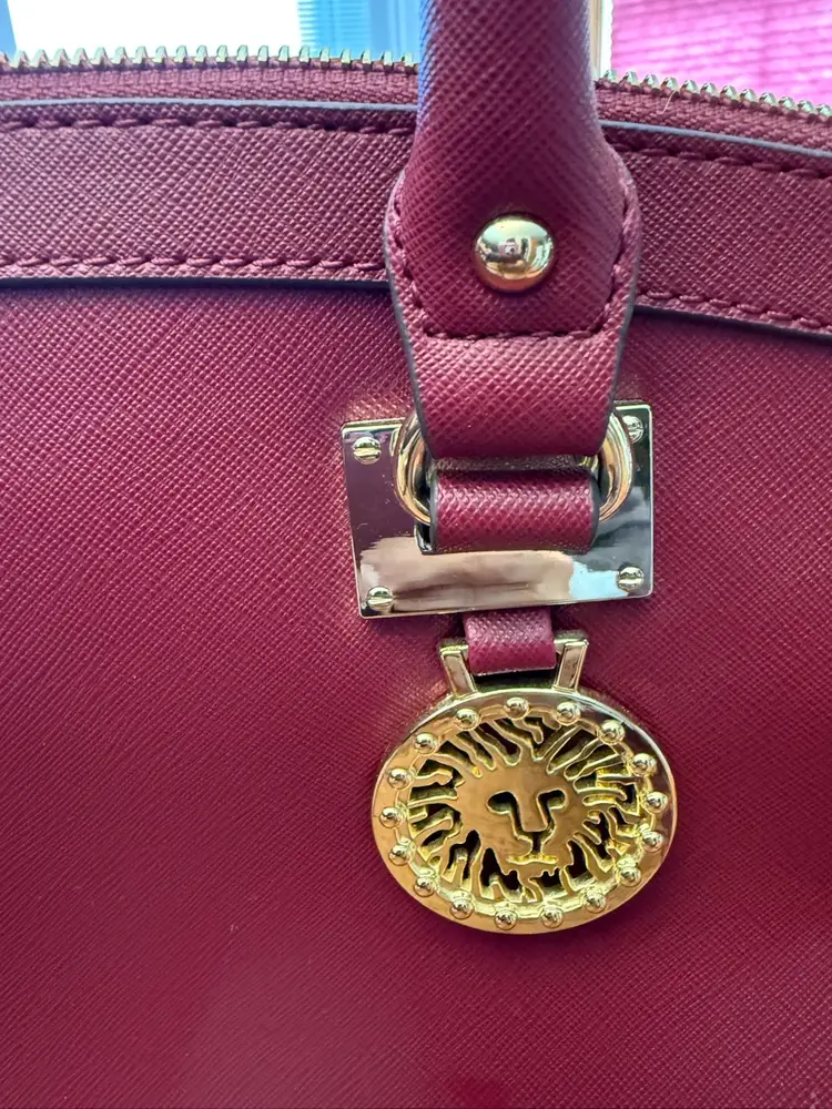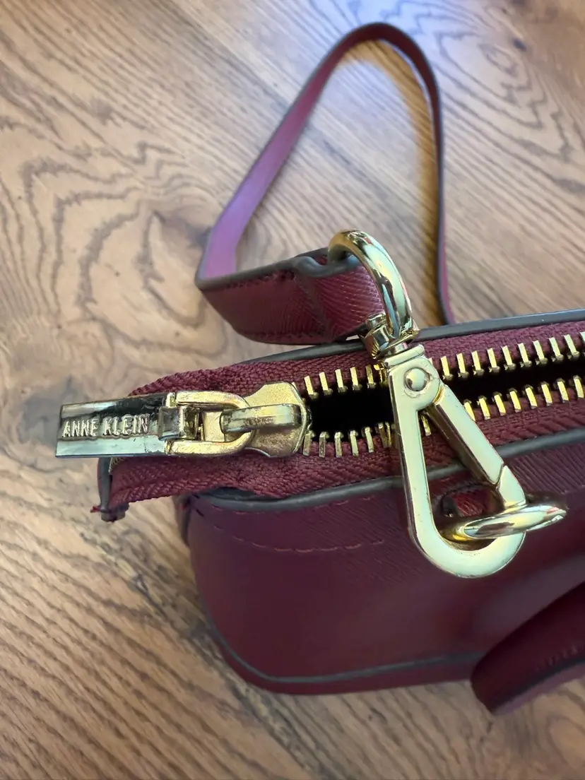 The Anne Klein Burgundy Faux Leather Satchel Handbag is a stylish and versatile accessory for any occasion. Made from faux leather with a brushed finish, this medium-sized shoulder bag features a rectangular shape with double burgundy handles and gold-plated hardware accents. The zip and snap closure ensures your belongings are secure, while the inner and outer pockets provide organization for all your essentials. Perfect for workwear, formal events, or casual outings, this handbag exudes a classic and sophisticated charm with a touch of luxury. This bag is new without tag. Measurements: 13 1/2"wide and 10 1/2" Tall.