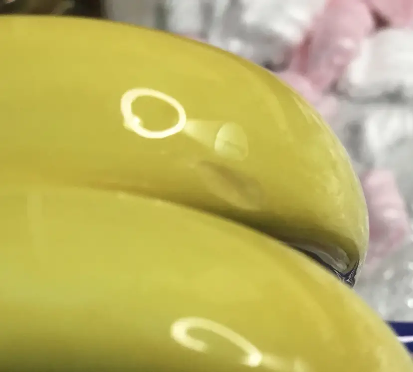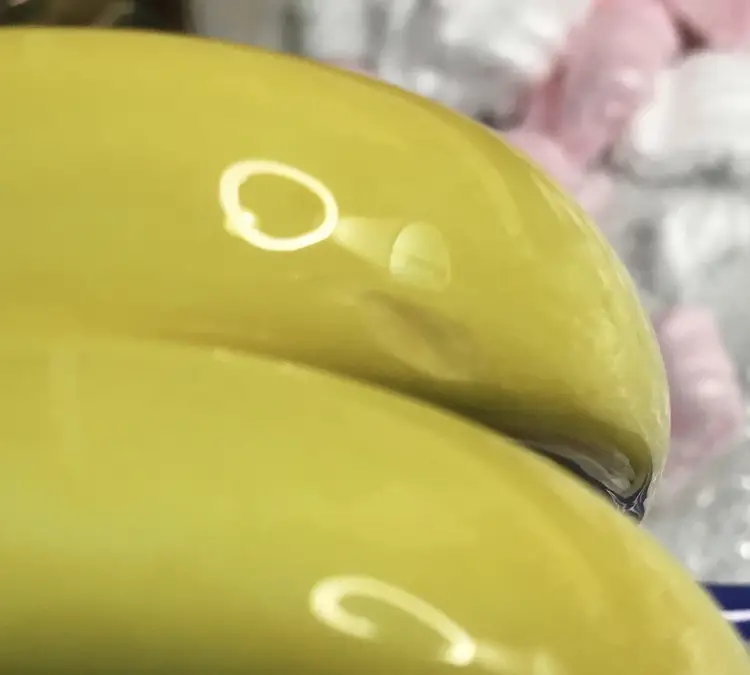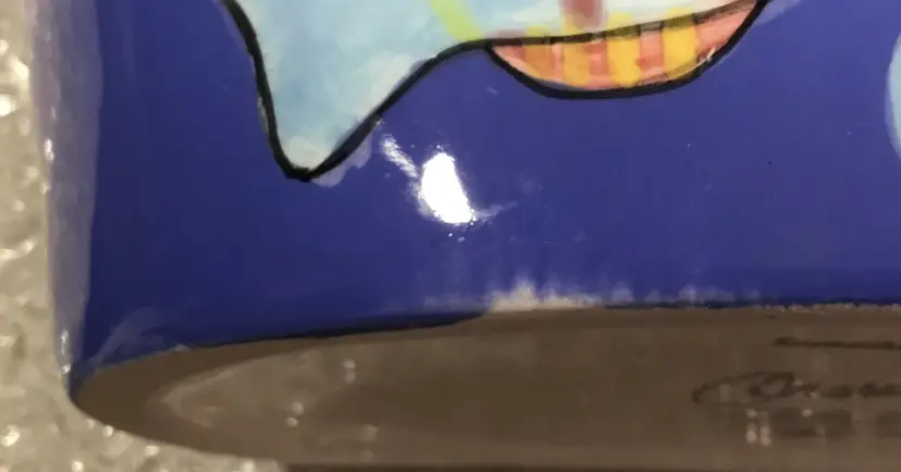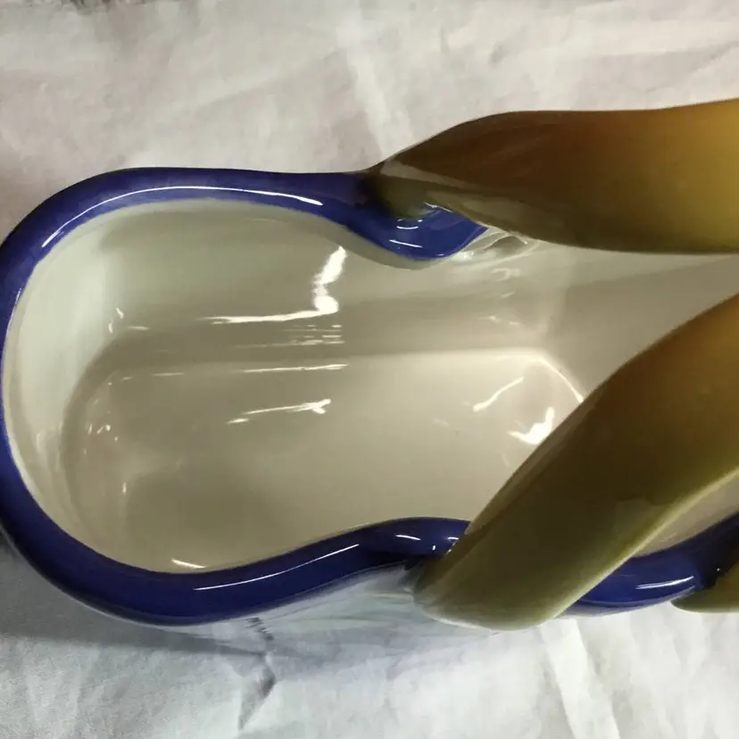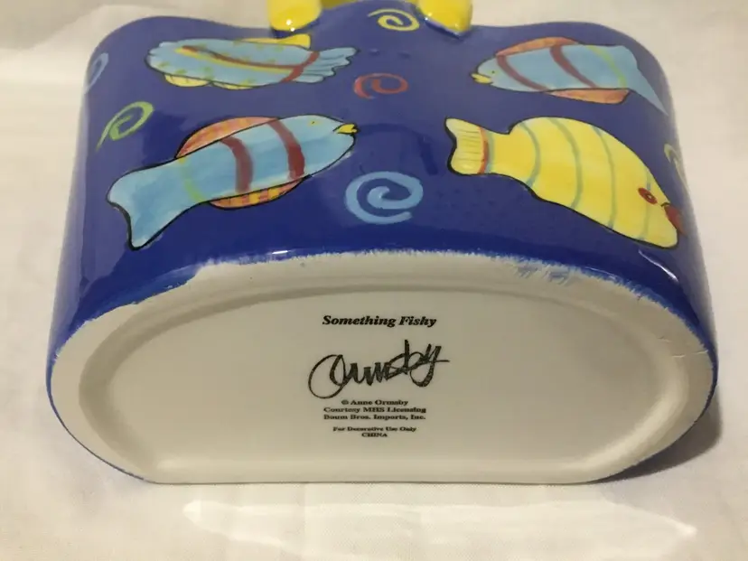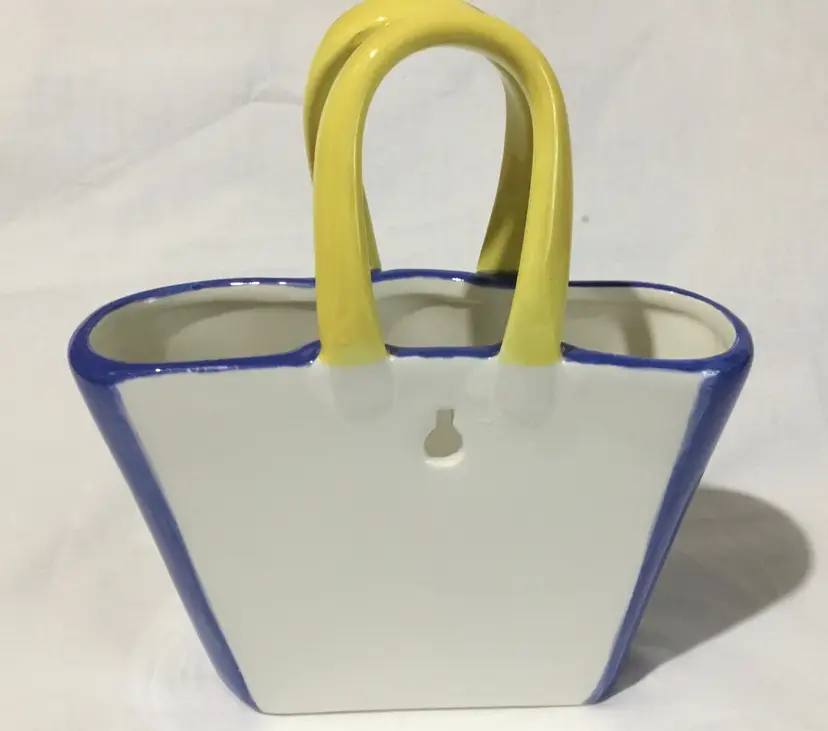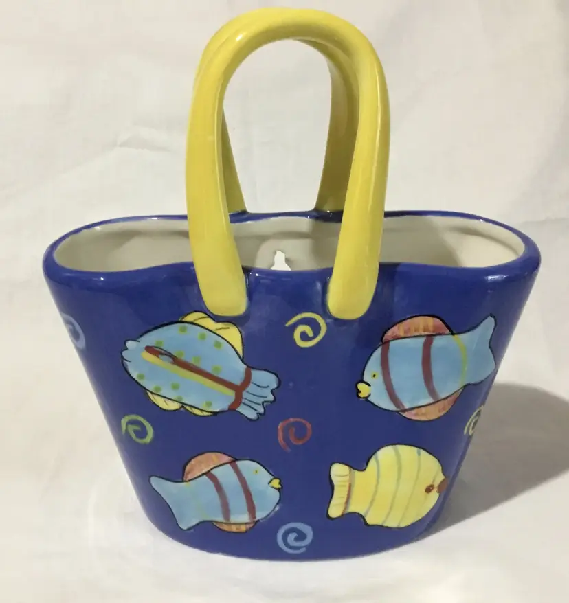 7 inches high including handles, 7 inches wide at top, 2.5 inches front to back, white, glazed ceramic hanging wall pocket with nail hole formed in the back, blue background with yellow handles, white glazed interior, light blue and yellow striped fish on front, multicolor small swirls around them. Glossy finish. Great for planter, succulents, holder for pens/pencils, headbands, barrettes, vase or display faux greenery. 4 tiny manufacturer's flaws where glaze is uneven. (See all photos.)