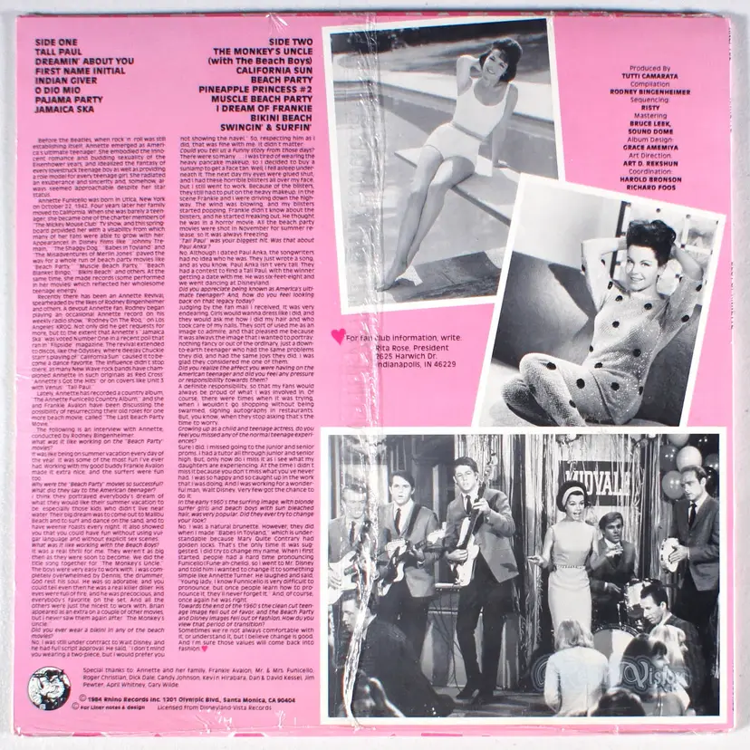 The Best of Annette features a number of Funicello's pop hits from the late 1950s and early 1960s, mostly written by the Sherman Brothers and including: Tall Paul, First Name Initial, O Dio Mio, and Pineapple Princess. The album also includes songs from her films such as: Beach Party, Binki Beach, Pajama Party.