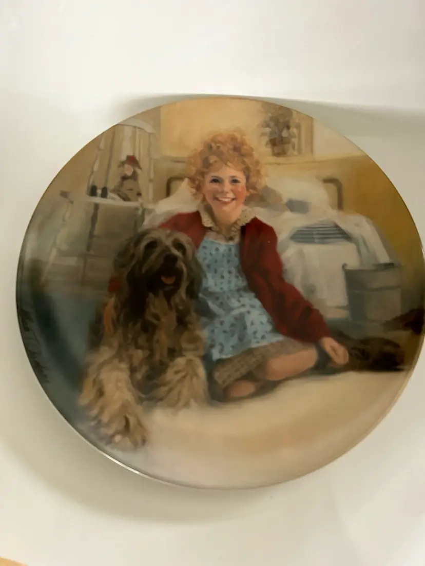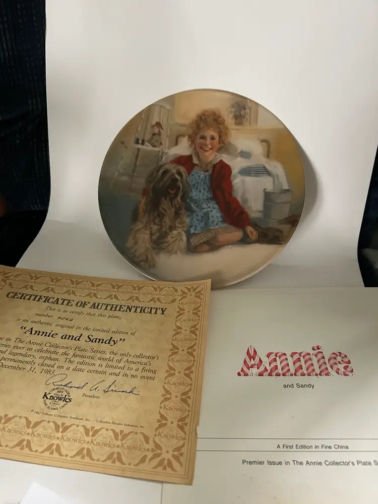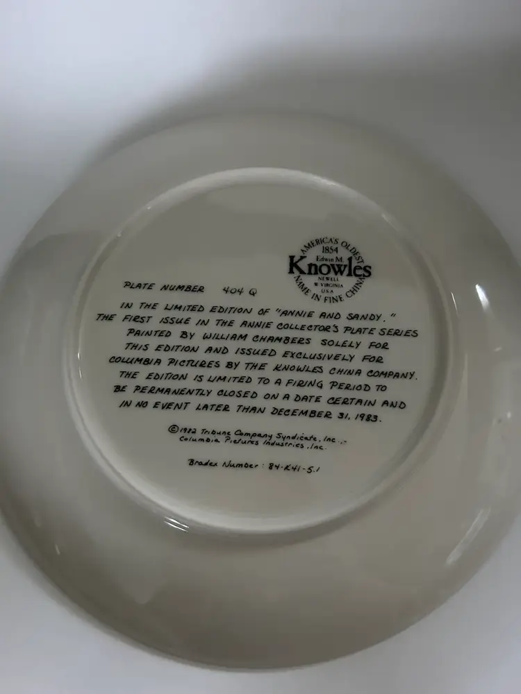 Beautiful plate of Annie & her dog Sandy. Made by The Edwin M Knowles China Company. Has original paper work & original shipping box from The Bradford Exchange. Box has a few stains. No chips, cracks or stains on the plate. Measures: 8 inches.