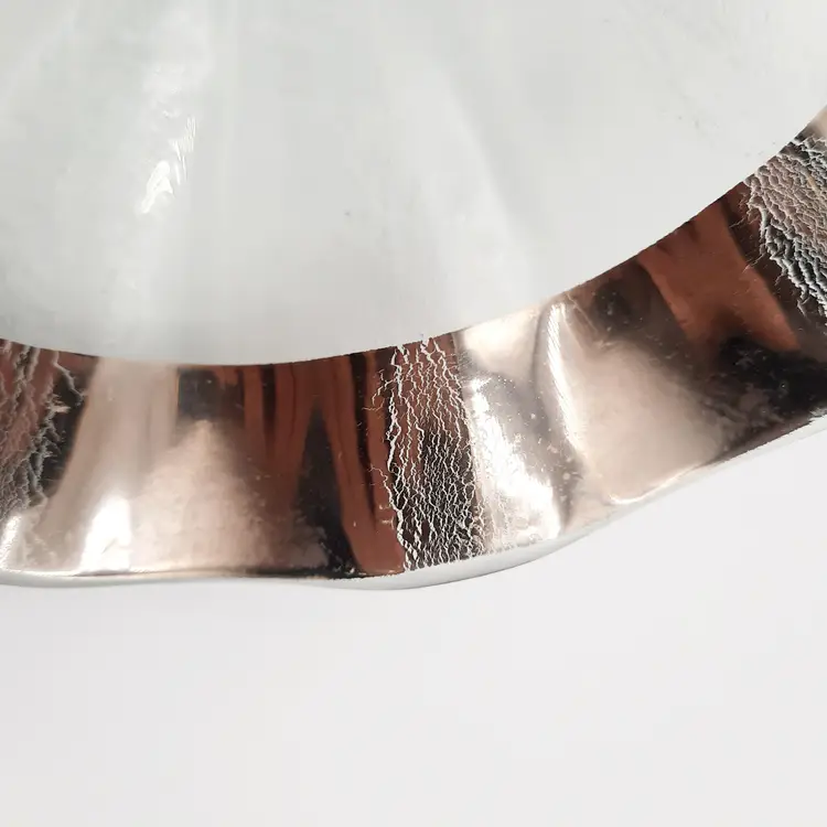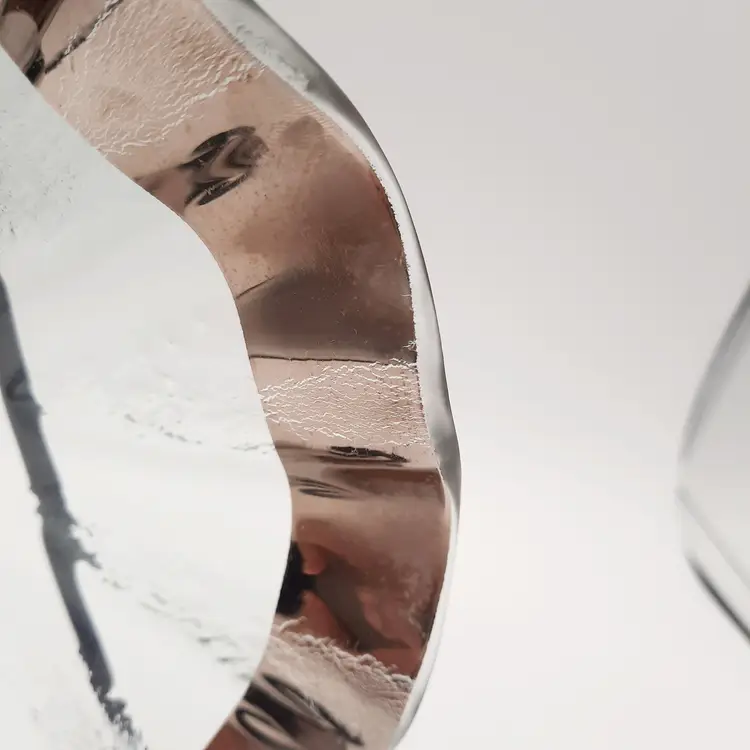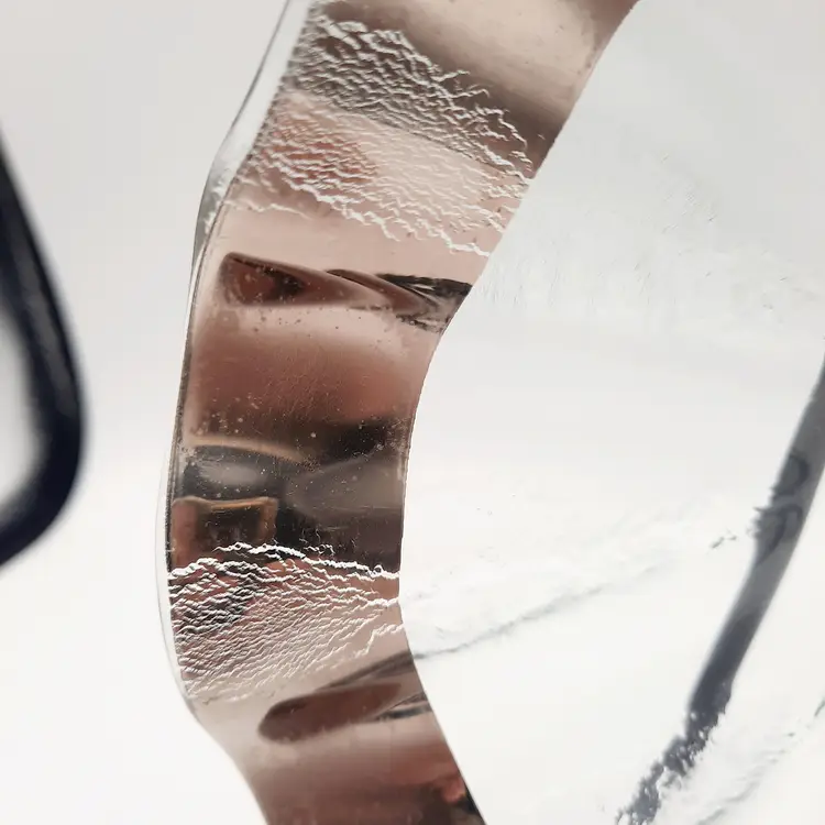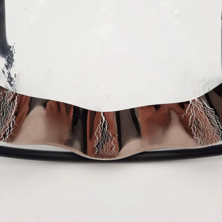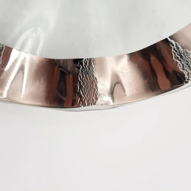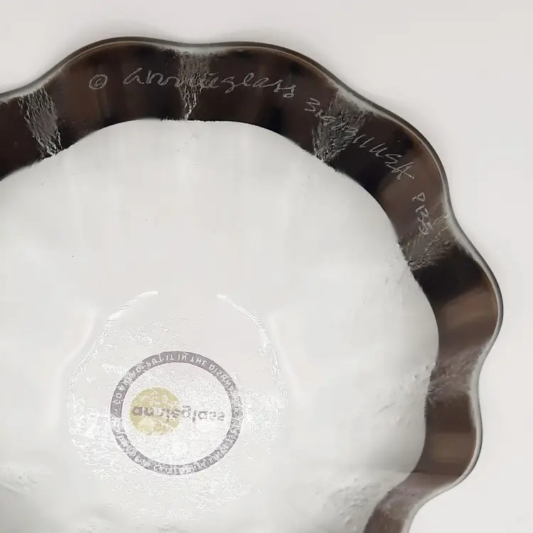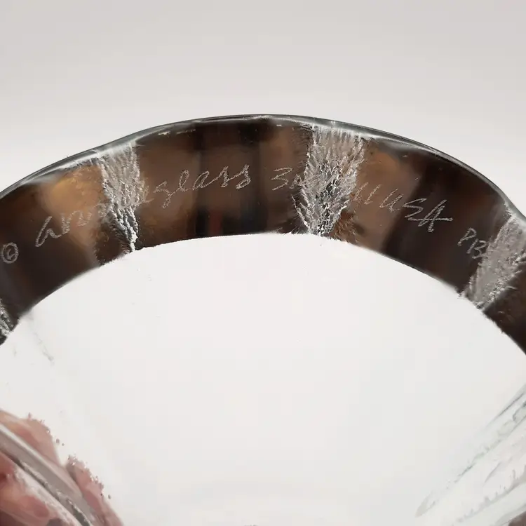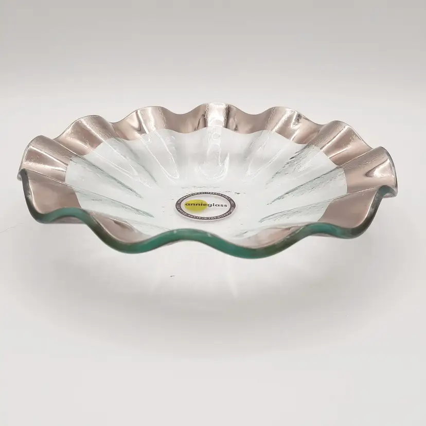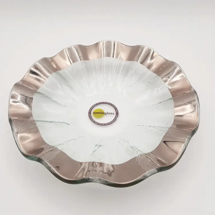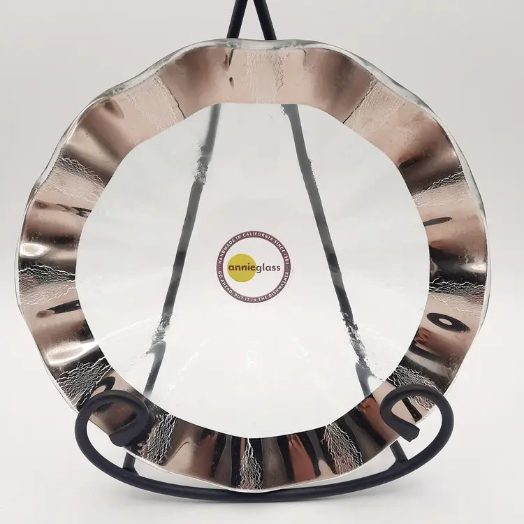 Handmade in CA, 7", clear glass is textured on bottom ridges, platinum border has a crackle finish alternating with a worn finish that looks to be the original design, piece has original sticker indicating dishwasher safe.