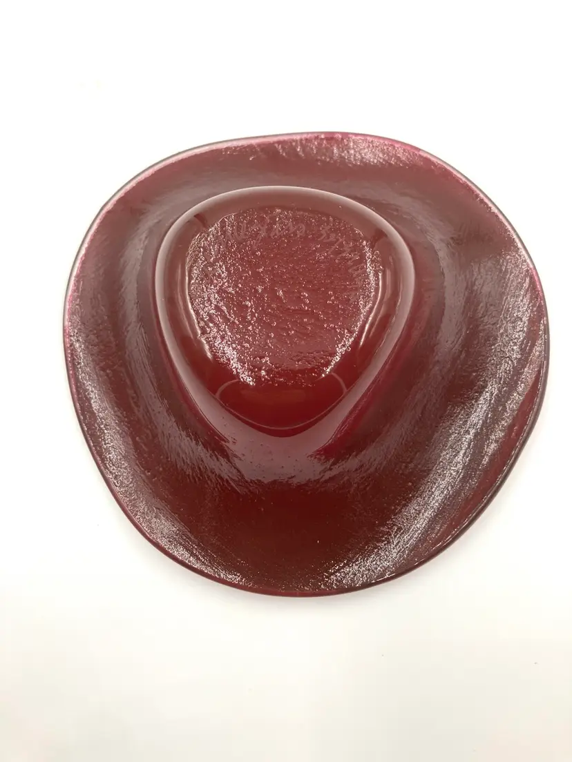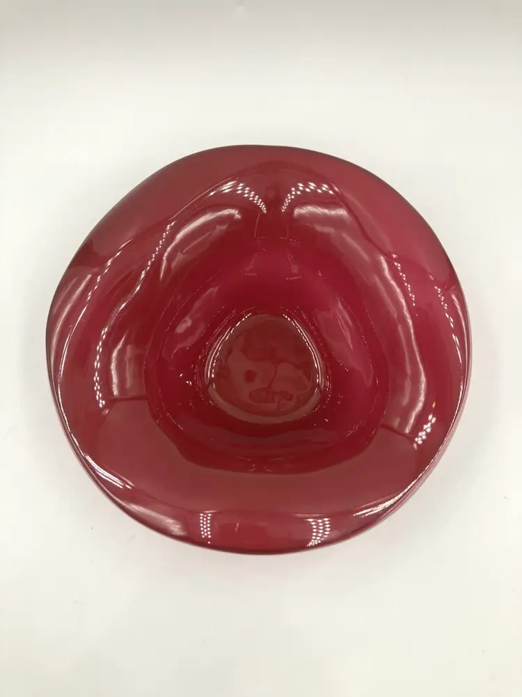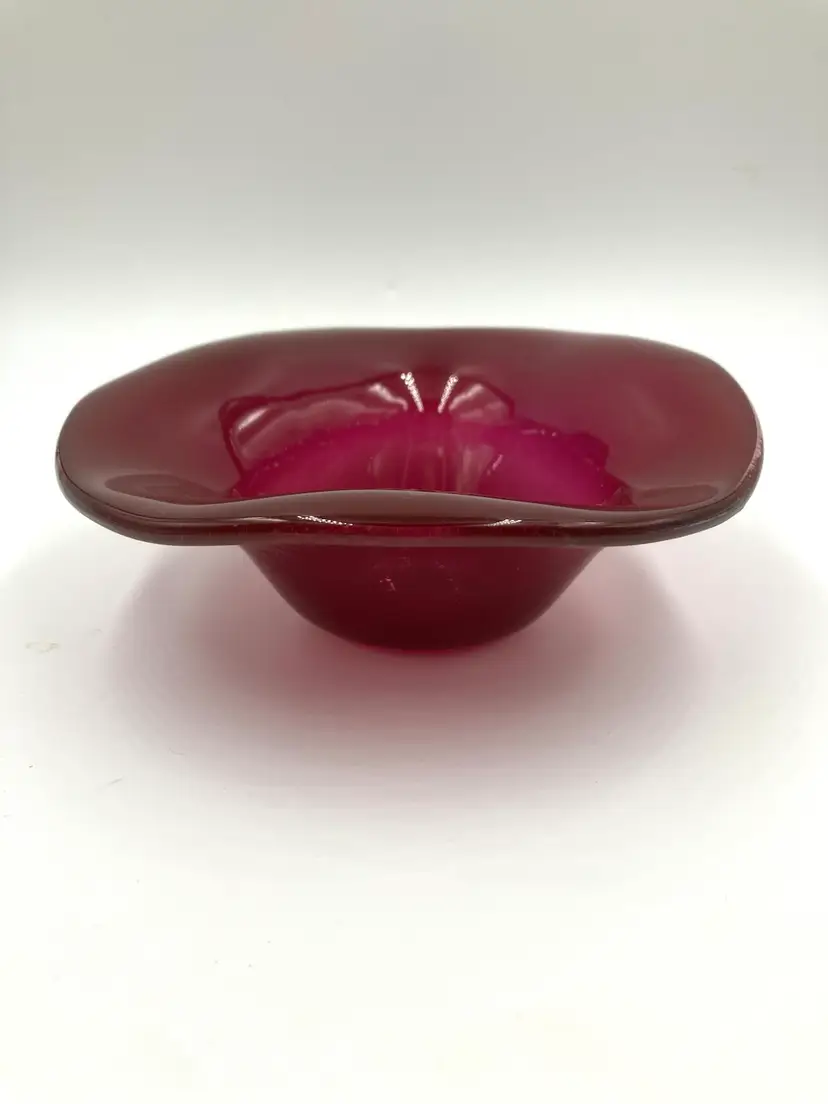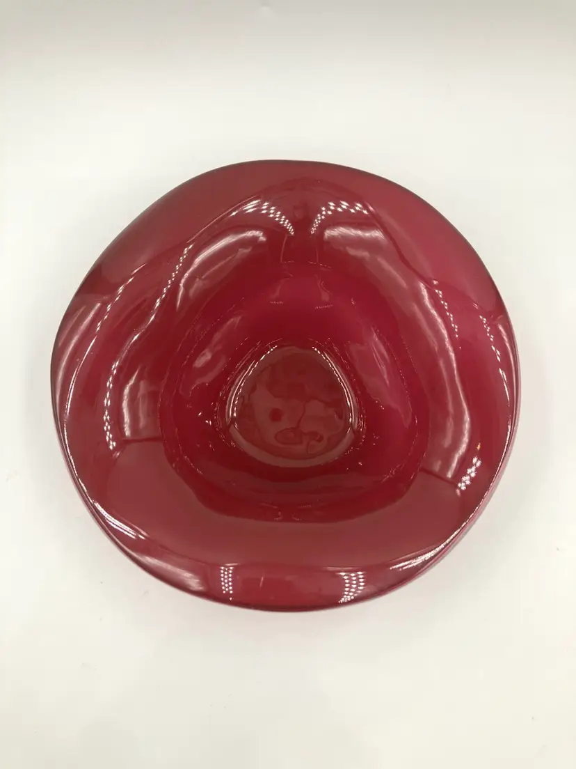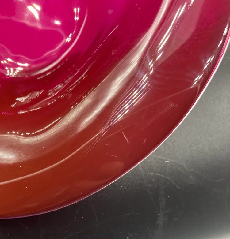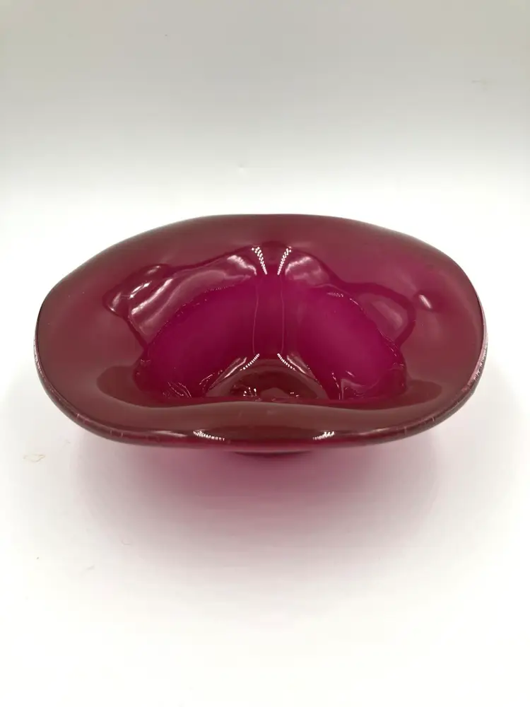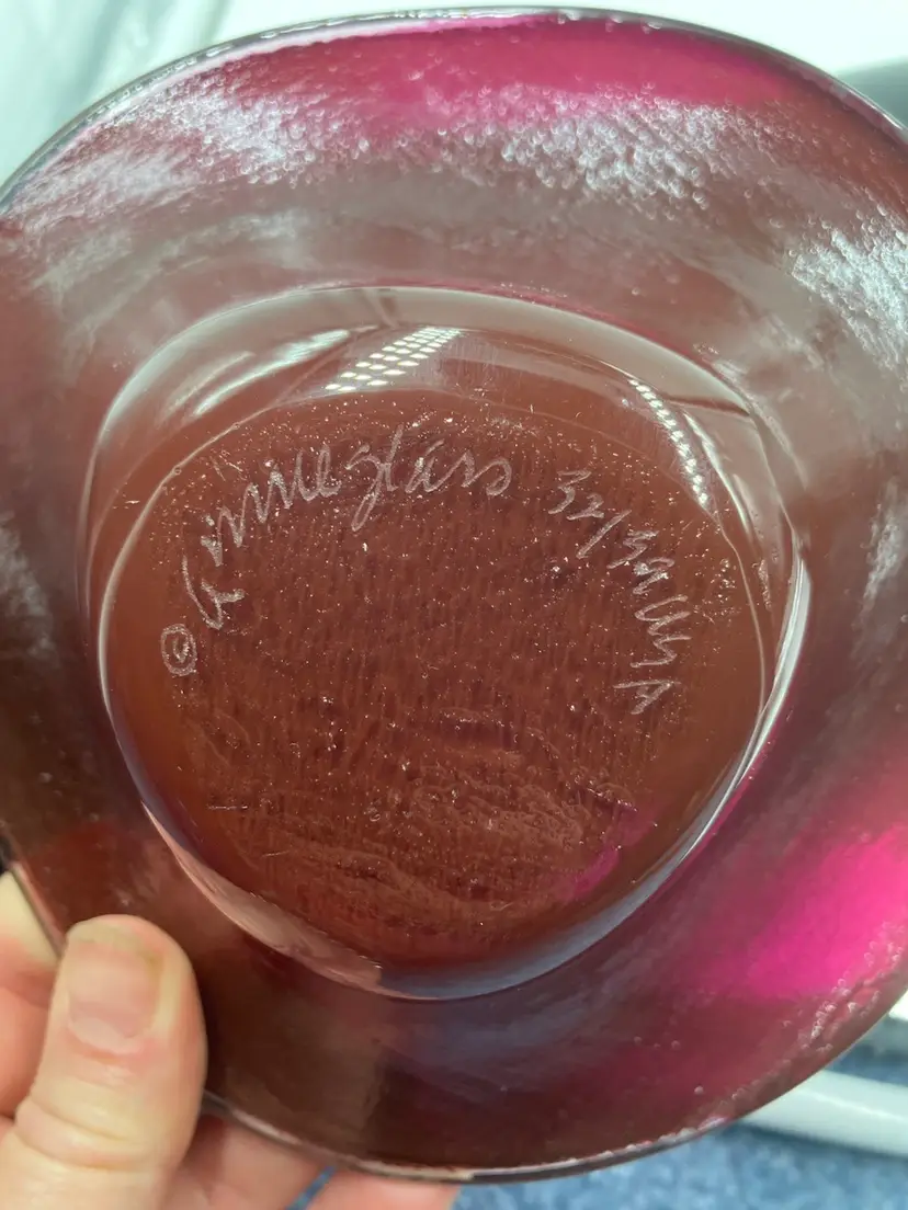 Measures 6” diameter x 2” tall. Artist is Annie Morehauser from California. It’s in great condition but there is a small 1/8” scratch and smaller surface marks near it on one side - see pics. Beautiful piece with a fun color. Signature says c Annie glass 32/39 USA