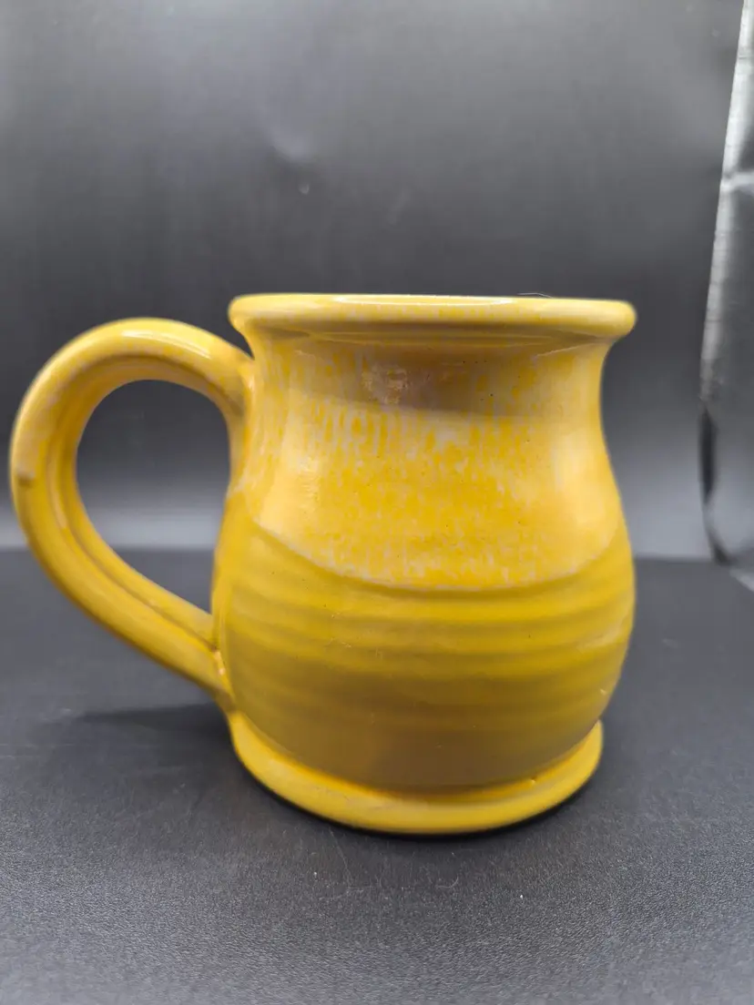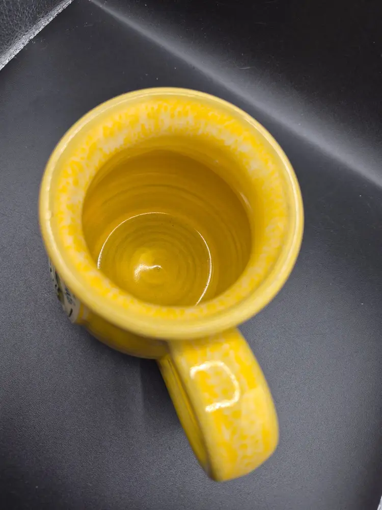 Sip your morning coffee from this vibrant yellow mug, lovingly handcrafted by Deneen Pottery. A keepsake from Another Broken Egg Cafe, Siesta Key, Florida.
