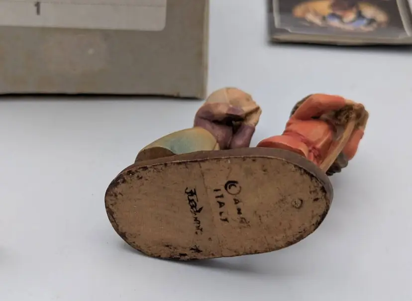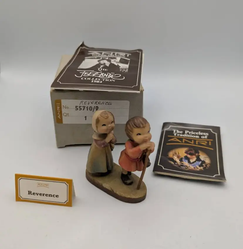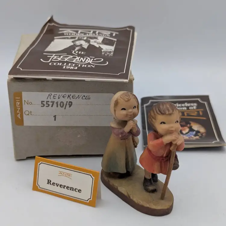 This is an ANRI carved wooden figurine. Titled "Reverence" It features a boy and girl shepherds gazing upward. Made in Italy Comes with original box and paperwork. Measures: Height approx. 3 inches Length 2.25 inch