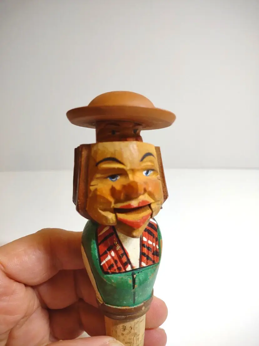 ANRI vintage hand carved and hand painted wood mechanical bottle stopper. Works perfect. Push the lever and the hat goes up to reveal a small head as the jaw drops. Size is 5" tall. Has wear to paint. Cork base has age use wear. STAND NOT INCLUDED.