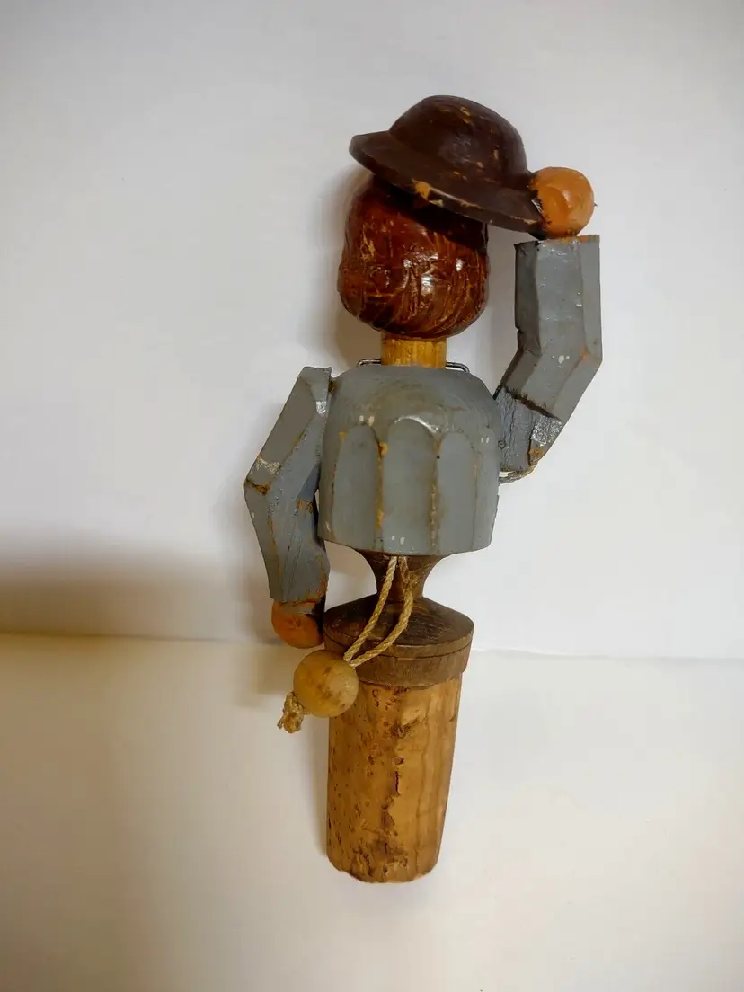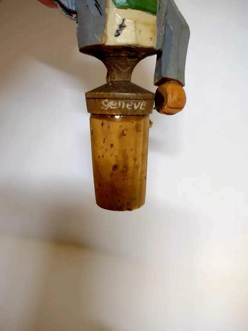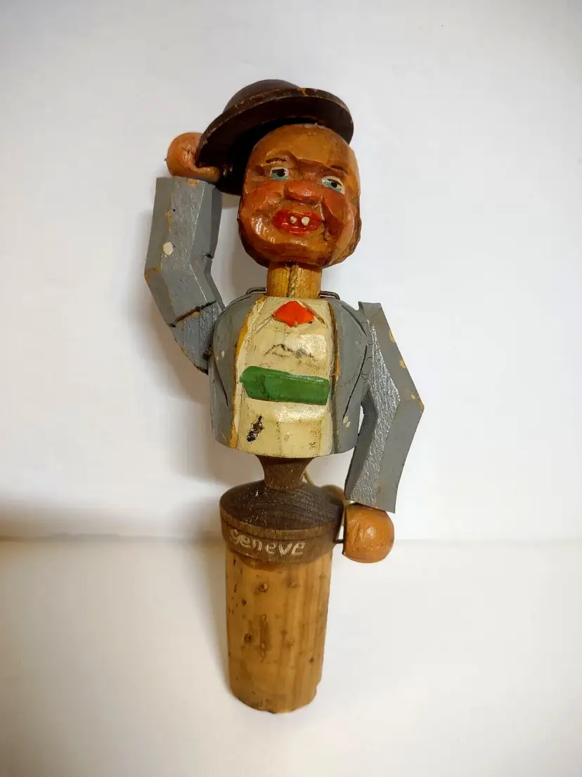 ANRI vintage hand carved and hand painted wood mechanical bottle stopper. Works perfect. Size is 5" tall. Has wear the the paint, light roughness around hat brim, glue on cork base, and wear the cork base. This was customized with Geneve text on front of base.